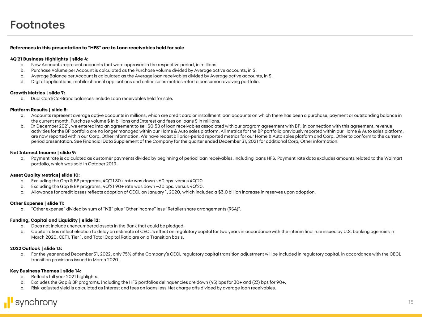 15 Footnotes References in this presentation to “HFS” are to Loan receivables held for sale 4Q'21 Business Highlights | slide 4: a. New Accounts represent accounts that were approved in the respective period, in millions. b. Purchase Volume per Account is calculated as the Purchase volume divided by Average active accounts, in $. c. Average Balance per Account is calculated as the Average loan receivables divided by Average active accounts, in $. d. Digital applications, mobile channel applications and online sales metrics refer to consumer revolving portfolio. Growth Metrics | slide 7: b. Dual Card/Co-Brand balances include Loan receivables held for sale. Platform Results | slide 8: a. Accounts represent average active accounts in millions, which are credit card or installment loan accounts on which there has been a purchase, payment or outstanding balance in the current month. Purchase volume $ in billions and Interest and fees on loans $ in millions. b. In December 2021, we entered into an agreement to sell $0.5B of loan receivables associated with our program agreement with BP. In connection with this agreement, revenue activities for the BP portfolio are no longer managed within our Home & Auto sales platform. All metrics for the BP portfolio previously reported within our Home & Auto sales platform, are now reported within our Corp, Other information. We have recast all prior-period reported metrics for our Home & Auto sales platform and Corp, Other to conform to the current- period presentation. See Financial Data Supplement of the Company for the quarter ended December 31, 2021 for additional Corp, Other information. Net Interest Income | slide 9: a. Payment rate is calculated as customer payments divided by beginning of period loan receivables, including loans HFS. Payment rate data excludes amounts related to the Walmart portfolio, which was sold in October 2019. Asset Quality Metrics| slide 10: a. Excluding the Gap & BP programs, 4Q’21 30+ rate was down ~60 bps. versus 4Q’20. b. Excluding the Gap & BP programs, 4Q’21 90+ rate was down ~30 bps. versus 4Q’20. c. Allowance for credit losses reflects adoption of CECL on January 1, 2020, which included a $3.0 billion increase in reserves upon adoption. Other Expense | slide 11: a. “Other expense” divided by sum of “NII” plus “Other income” less “Retailer share arrangements (RSA)”. Funding, Capital and Liquidity | slide 12: a. Does not include unencumbered assets in the Bank that could be pledged. b. Capital ratios reflect election to delay an estimate of CECL’s effect on regulatory capital for two years in accordance with the interim final rule issued by U.S. banking agencies in March 2020. CET1, Tier 1, and Total Capital Ratio are on a Transition basis. 2022 Outlook | slide 13: a. For the year ended December 31, 2022, only 75% of the Company’s CECL regulatory capital transition adjustment will be included in regulatory capital, in accordance with the CECL transition provisions issued in March 2020. Key Business Themes | slide 14: a. Reflects full year 2021 highlights. b. Excludes the Gap & BP programs. Including the HFS portfolios delinquencies are down (45) bps for 30+ and (23) bps for 90+. c. Risk-adjusted yield is calculated as Interest and fees on loans less Net charge offs divided by average loan receivables.