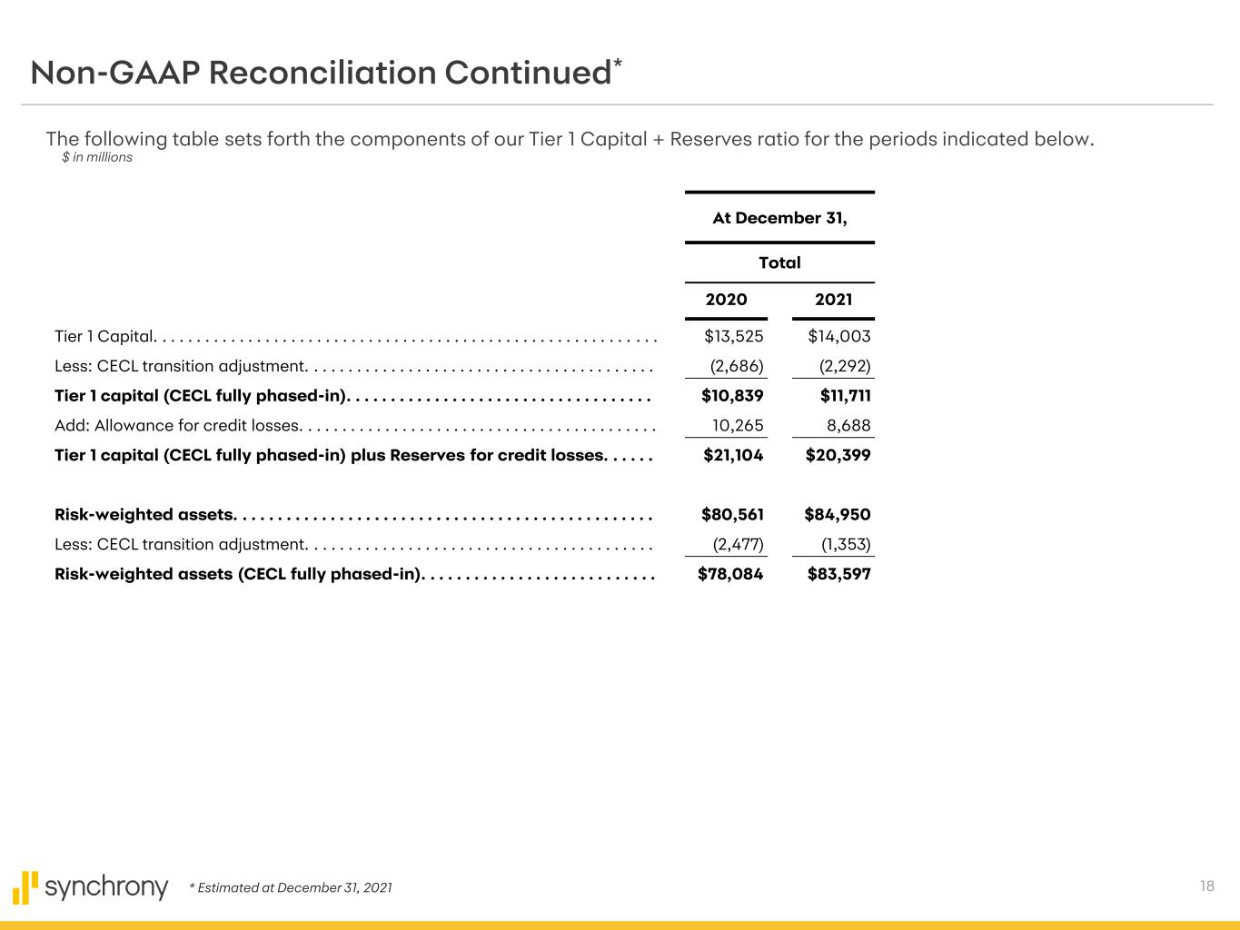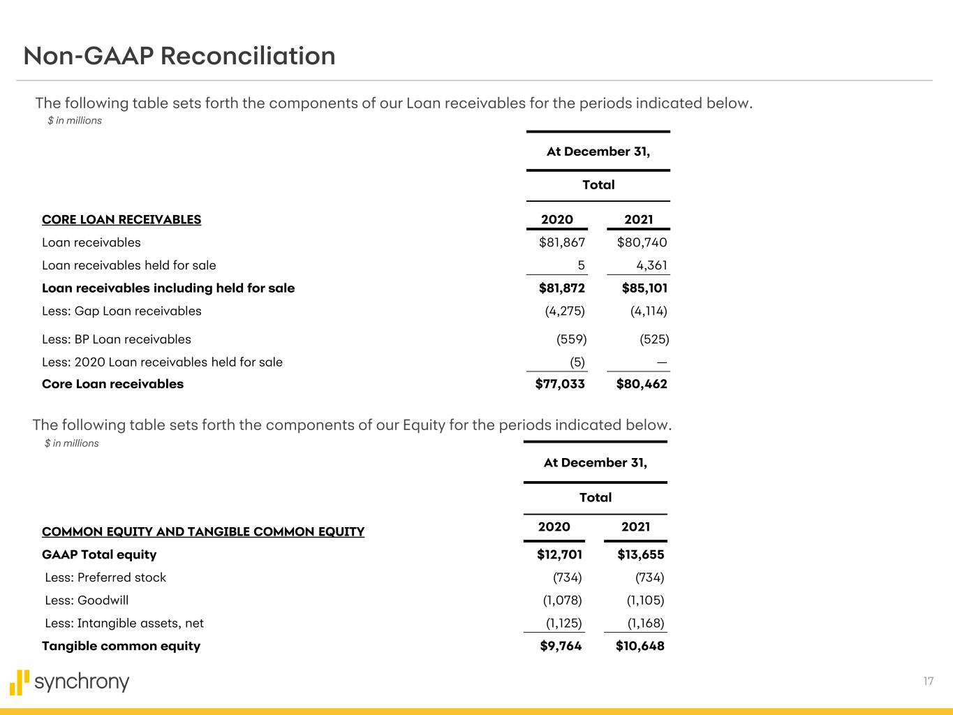 17 Non-GAAP Reconciliation The following table sets forth the components of our Loan receivables for the periods indicated below. $ in millions At December 31, Total CORE LOAN RECEIVABLES 2020 2021 Loan receivables $81,867 $80,740 Loan receivables held for sale 5 4,361 Loan receivables including held for sale $81,872 $85,101 Less: Gap Loan receivables (4,275) (4,114) Less: BP Loan receivables (559) (525) Less: 2020 Loan receivables held for sale (5) — Core Loan receivables $77,033 $80,462 At December 31, Total COMMON EQUITY AND TANGIBLE COMMON EQUITY 2020 2021 GAAP Total equity $12,701 $13,655 Less: Preferred stock (734) (734) Less: Goodwill (1,078) (1,105) Less: Intangible assets, net (1,125) (1,168) Tangible common equity $9,764 $10,648 The following table sets forth the components of our Equity for the periods indicated below. $ in millions