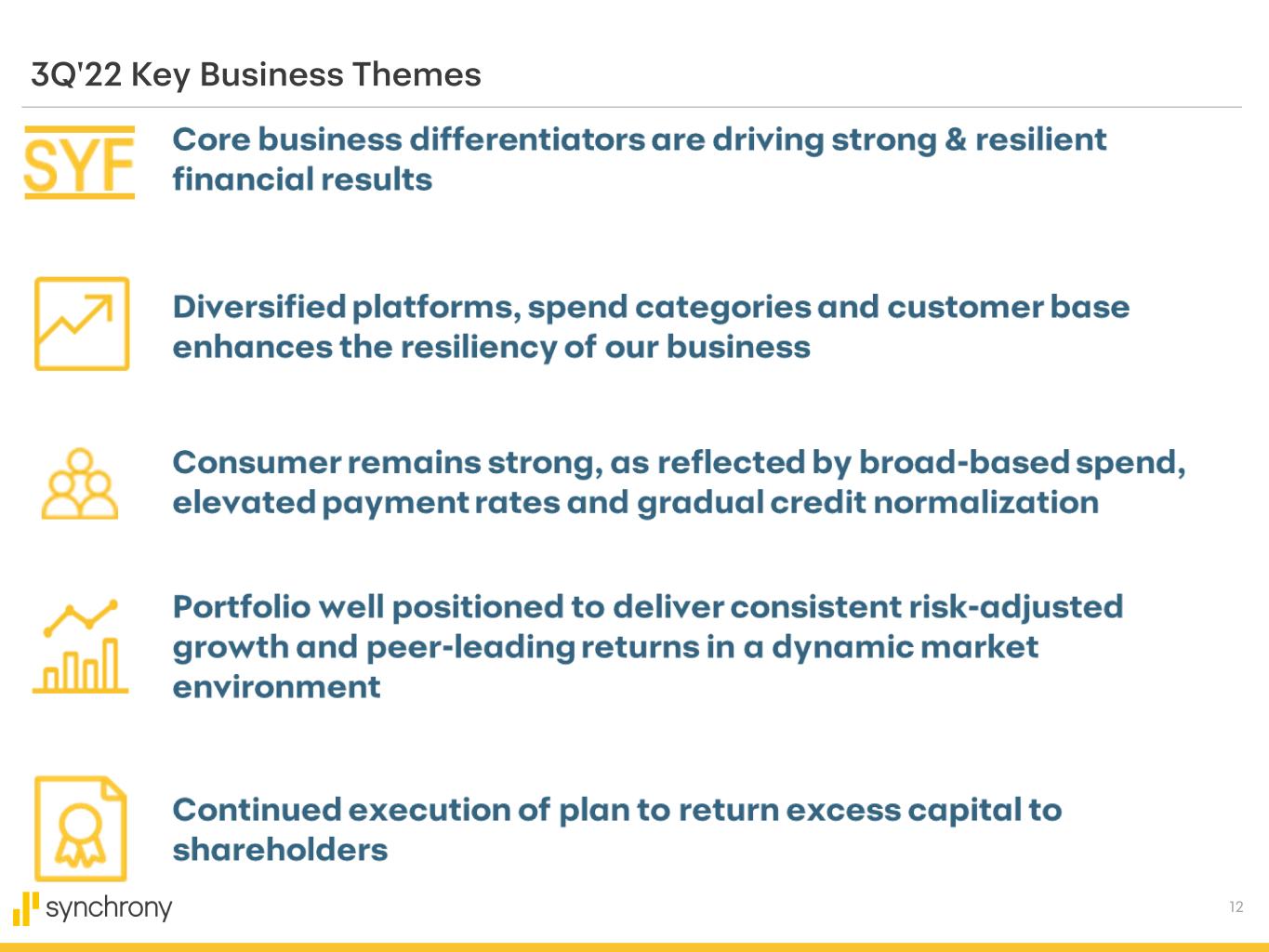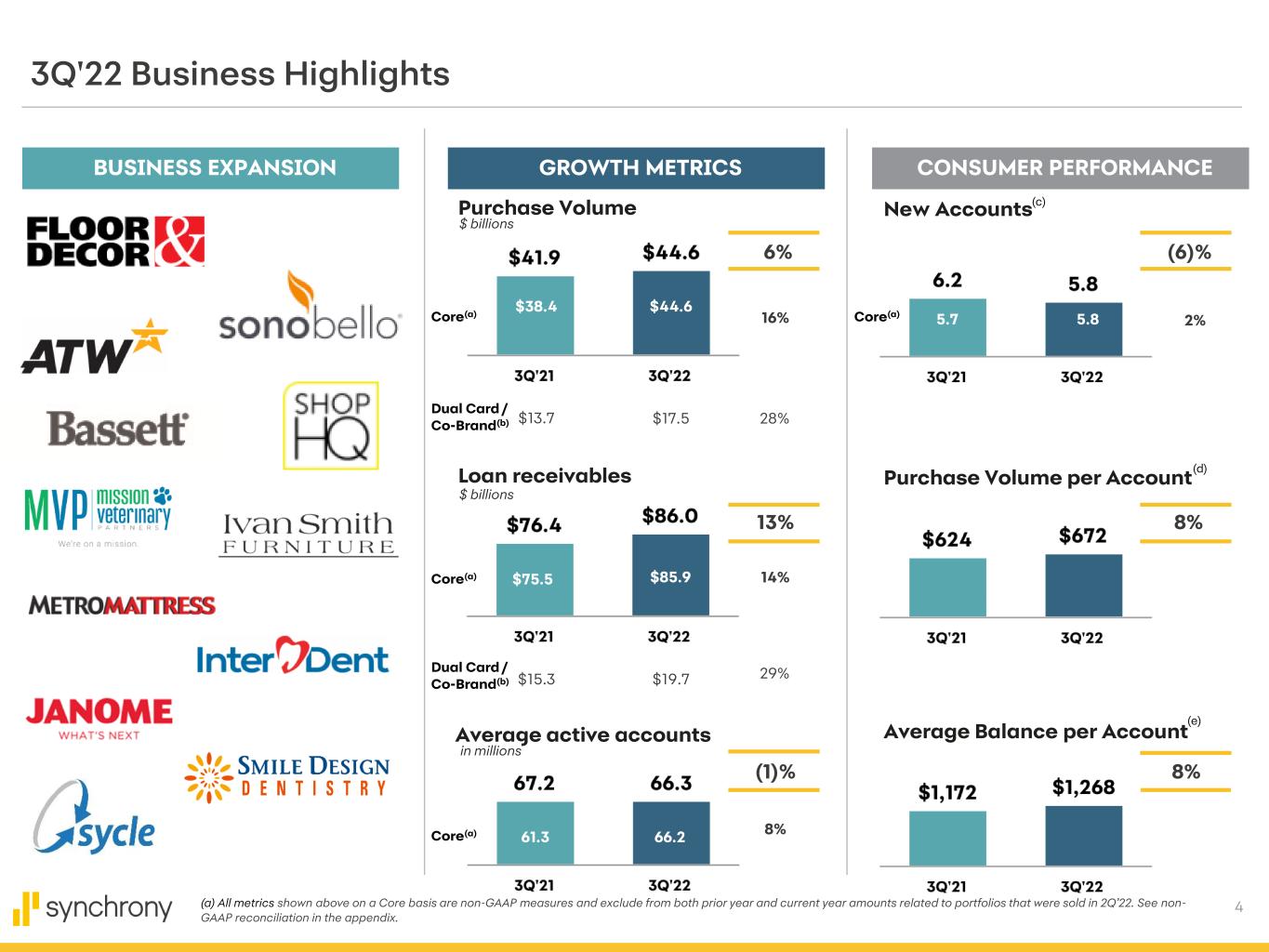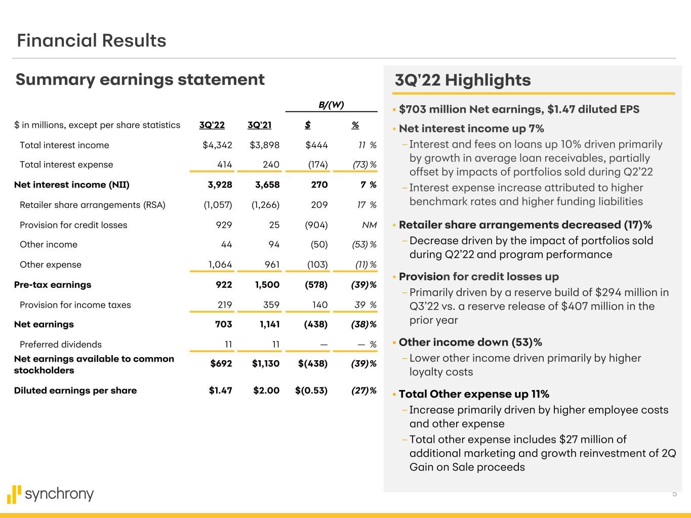 2 Cautionary Statement Regarding Forward-Looking Statements The following slides are part of a presentation by Synchrony Financial in connection with reporting quarterly financial results. No representation is made that the information in these slides is complete. For additional information, see the earnings release and financial supplement included as exhibits to our Current Report on Form 8-K filed today and available on our website (www.synchronyfinancial.com) and the SEC's website (www.sec.gov). All references to net earnings and net income are intended to have the same meaning. All comparisons are for the third quarter of 2022 compared to the third quarter of 2021, unless otherwise noted. This presentation contains certain forward-looking statements as defined in Section 27A of the Securities Act of 1933, as amended, and Section 21E of the Securities Exchange Act of 1934, as amended, which are subject to the "safe harbor" created by those sections. Forward-looking statements may be identified by words such as "expects," "intends," "anticipates," "plans," "believes," "seeks," "targets," "outlook," "estimates," "will," "should," "may" or words of similar meaning, but these words are not the exclusive means of identifying forward-looking statements. Forward- looking statements are based on management's current expectations and assumptions, and are subject to inherent uncertainties, risks and changes in circumstances that are difficult to predict. As a result, actual results could differ materially from those indicated in these forward-looking statements. Factors that could cause actual results to differ materially include global political, economic, business, competitive, market, regulatory and other factors and risks, such as: the impact of macroeconomic conditions and whether industry trends we have identified develop as anticipated, including the future impacts of the novel coronavirus disease (“COVID-19”) outbreak and measures taken in response thereto for which future developments are highly uncertain and difficult to predict; retaining existing partners and attracting new partners, concentration of our revenue in a small number of partners, and promotion and support of our products by our partners; cyber-attacks or other security breaches; disruptions in the operations of our and our outsourced partners' computer systems and data centers; the financial performance of our partners; the sufficiency of our allowance for credit losses and the accuracy of the assumptions or estimates used in preparing our financial statements, including those related to the CECL accounting guidance; higher borrowing costs and adverse financial market conditions impacting our funding and liquidity, and any reduction in our credit ratings; our ability to grow our deposits in the future; damage to our reputation; our ability to securitize our loan receivables, occurrence of an early amortization of our securitization facilities, loss of the right to service or sub-service our securitized loan receivables, and lower payment rates on our securitized loan receivables; changes in market interest rates and the impact of any margin compression; effectiveness of our risk management processes and procedures, reliance on models which may be inaccurate or misinterpreted, our ability to manage our credit risk; our ability to offset increases in our costs in retailer share arrangements; competition in the consumer finance industry; our concentration in the U.S. consumer credit market; our ability to successfully develop and commercialize new or enhanced products and services; our ability to realize the value of acquisitions and strategic investments; reductions in interchange fees; fraudulent activity; failure of third-parties to provide various services that are important to our operations; international risks and compliance and regulatory risks and costs associated with international operations; alleged infringement of intellectual property rights of others and our ability to protect our intellectual property; litigation and regulatory actions; our ability to attract, retain and motivate key officers and employees; tax legislation initiatives or challenges to our tax positions and/or interpretations, and state sales tax rules and regulations; regulation, supervision, examination and enforcement of our business by governmental authorities, the impact of the Dodd-Frank Wall Street Reform and Consumer Protection Act (the “Dodd-Frank Act”) and other legislative and regulatory developments and the impact of the Consumer Financial Protection Bureau’s (the “CFPB”) regulation of our business; impact of capital adequacy rules and liquidity requirements; restrictions that limit our ability to pay dividends and repurchase our common stock, and restrictions that limit the Bank’s ability to pay dividends to us; regulations relating to privacy, information security and data protection; use of third-party vendors and ongoing third-party business relationships; and failure to comply with anti-money laundering and anti-terrorism financing laws. For the reasons described above, we caution you against relying on any forward-looking statements, which should also be read in conjunction with the other cautionary statements that are included elsewhere in this presentation and in our public filings, including under the heading “Risk Factors Relating to Our Business” and “Risk Factors Relating to Regulation” in the Company's Annual Report on Form 10-K for the fiscal year ended December 31, 2021, as filed on February 10, 2022. You should not consider any list of such factors to be an exhaustive statement of all the risks, uncertainties, or potentially inaccurate assumptions that could cause our current expectations or beliefs to change. Further, any forward-looking statement speaks only as of the date on which it is made, and we undertake no obligation to update or revise any forward-looking statement to reflect eve