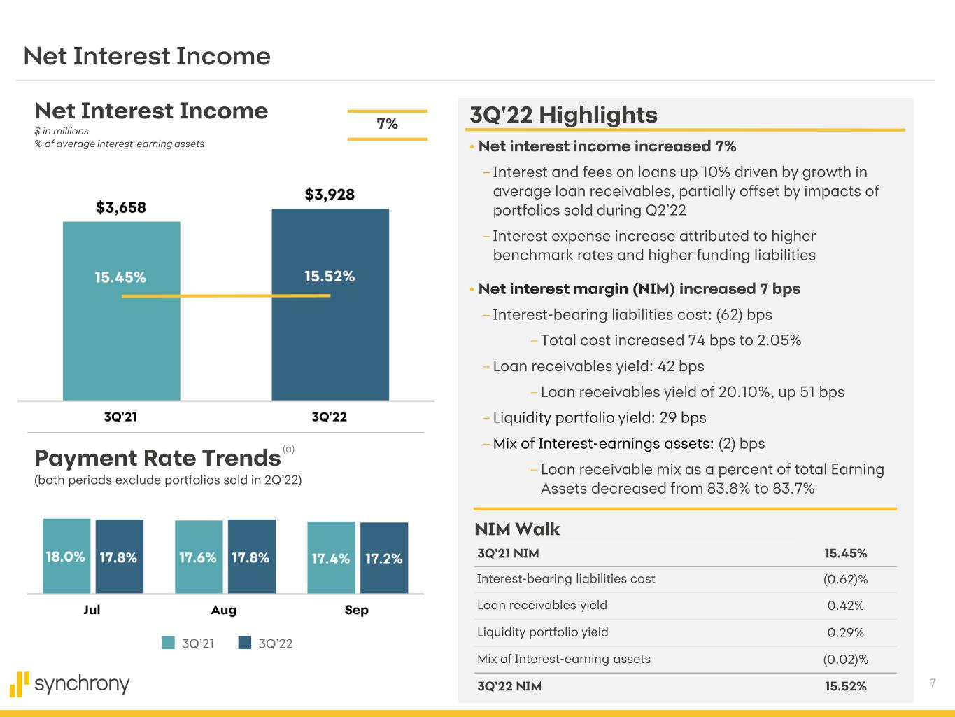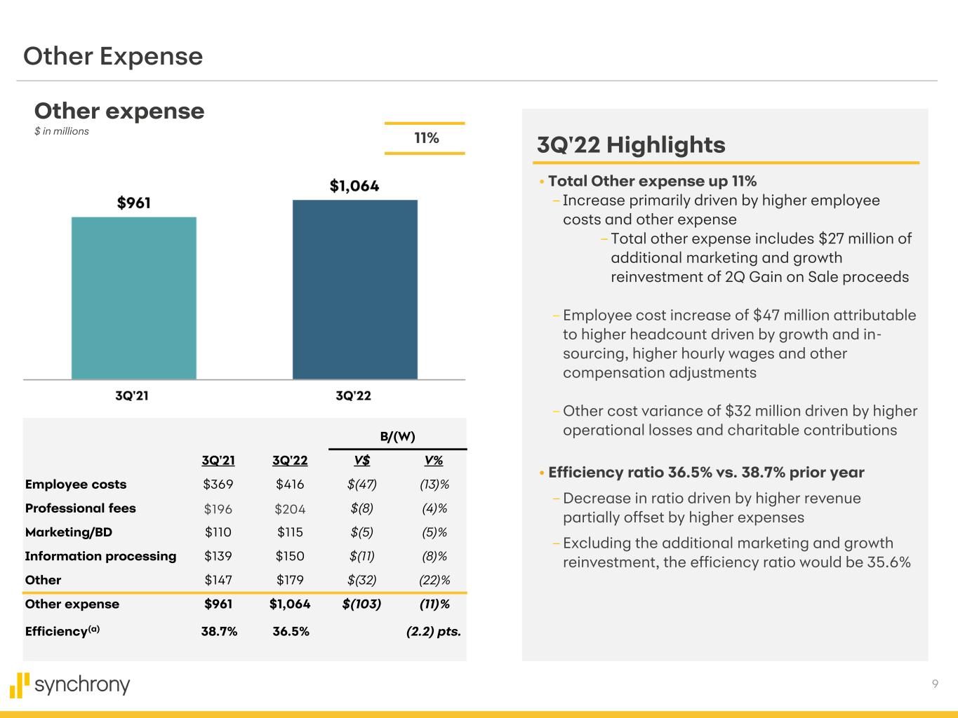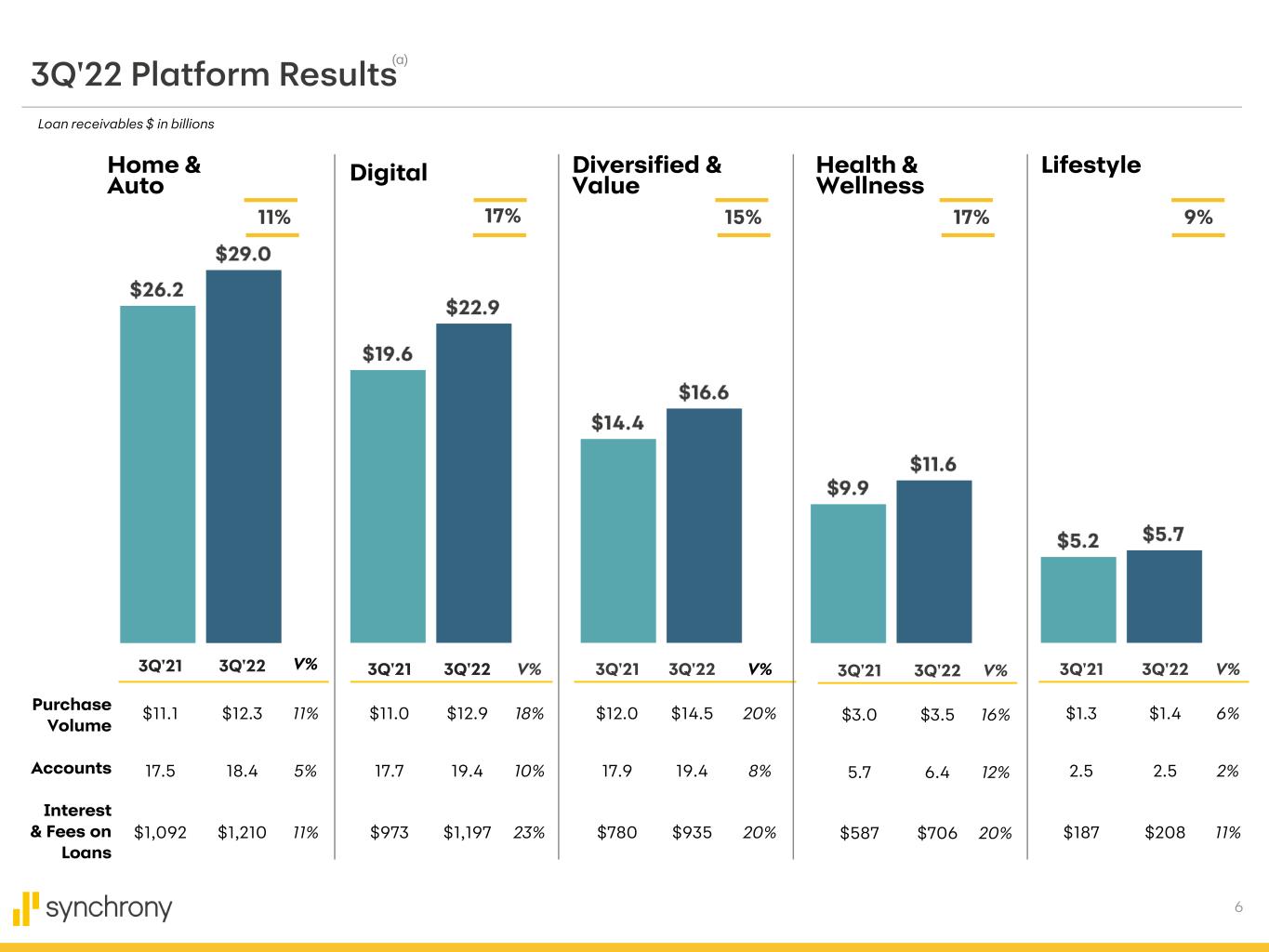 2 Cautionary Statement Regarding Forward-Looking Statements The following slides are part of a presentation by Synchrony Financial in connection with reporting quarterly financial results. No representation is made that the information in these slides is complete. For additional information, see the earnings release and financial supplement included as exhibits to our Current Report on Form 8-K filed today and available on our website (www.synchronyfinancial.com) and the SEC's website (www.sec.gov). All references to net earnings and net income are intended to have the same meaning. All comparisons are for the third quarter of 2022 compared to the third quarter of 2021, unless otherwise noted. This presentation contains certain forward-looking statements as defined in Section 27A of the Securities Act of 1933, as amended, and Section 21E of the Securities Exchange Act of 1934, as amended, which are subject to the "safe harbor" created by those sections. Forward-looking statements may be identified by words such as "expects," "intends," "anticipates," "plans," "believes," "seeks," "targets," "outlook," "estimates," "will," "should," "may" or words of similar meaning, but these words are not the exclusive means of identifying forward-looking statements. Forward- looking statements are based on management's current expectations and assumptions, and are subject to inherent uncertainties, risks and changes in circumstances that are difficult to predict. As a result, actual results could differ materially from those indicated in these forward-looking statements. Factors that could cause actual results to differ materially include global political, economic, business, competitive, market, regulatory and other factors and risks, such as: the impact of macroeconomic conditions and whether industry trends we have identified develop as anticipated, including the future impacts of the novel coronavirus disease (“COVID-19”) outbreak and measures taken in response thereto for which future developments are highly uncertain and difficult to predict; retaining existing partners and attracting new partners, concentration of our revenue in a small number of partners, and promotion and support of our products by our partners; cyber-attacks or other security breaches; disruptions in the operations of our and our outsourced partners' computer systems and data centers; the financial performance of our partners; the sufficiency of our allowance for credit losses and the accuracy of the assumptions or estimates used in preparing our financial statements, including those related to the CECL accounting guidance; higher borrowing costs and adverse financial market conditions impacting our funding and liquidity, and any reduction in our credit ratings; our ability to grow our deposits in the future; damage to our reputation; our ability to securitize our loan receivables, occurrence of an early amortization of our securitization facilities, loss of the right to service or sub-service our securitized loan receivables, and lower payment rates on our securitized loan receivables; changes in market interest rates and the impact of any margin compression; effectiveness of our risk management processes and procedures, reliance on models which may be inaccurate or misinterpreted, our ability to manage our credit risk; our ability to offset increases in our costs in retailer share arrangements; competition in the consumer finance industry; our concentration in the U.S. consumer credit market; our ability to successfully develop and commercialize new or enhanced products and services; our ability to realize the value of acquisitions and strategic investments; reductions in interchange fees; fraudulent activity; failure of third-parties to provide various services that are important to our operations; international risks and compliance and regulatory risks and costs associated with international operations; alleged infringement of intellectual property rights of others and our ability to protect our intellectual property; litigation and regulatory actions; our ability to attract, retain and motivate key officers and employees; tax legislation initiatives or challenges to our tax positions and/or interpretations, and state sales tax rules and regulations; regulation, supervision, examination and enforcement of our business by governmental authorities, the impact of the Dodd-Frank Wall Street Reform and Consumer Protection Act (the “Dodd-Frank Act”) and other legislative and regulatory developments and the impact of the Consumer Financial Protection Bureau’s (the “CFPB”) regulation of our business; impact of capital adequacy rules and liquidity requirements; restrictions that limit our ability to pay dividends and repurchase our common stock, and restrictions that limit the Bank’s ability to pay dividends to us; regulations relating to privacy, information security and data protection; use of third-party vendors and ongoing third-party business relationships; and failure to comply with anti-money laundering and anti-terrorism financing laws. For the reasons described above, we caution you against relying on any forward-looking statements, which should also be read in conjunction with the other cautionary statements that are included elsewhere in this presentation and in our public filings, including under the heading “Risk Factors Relating to Our Business” and “Risk Factors Relating to Regulation” in the Company's Annual Report on Form 10-K for the fiscal year ended December 31, 2021, as filed on February 10, 2022. You should not consider any list of such factors to be an exhaustive statement of all the risks, uncertainties, or potentially inaccurate assumptions that could cause our current expectations or beliefs to change. Further, any forward-looking statement speaks only as of the date on which it is made, and we undertake no obligation to update or revise any forward-looking statement to reflect eve