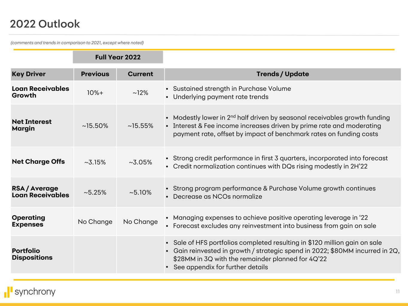 11 2022 Outlook Key Driver Previous Current Trends / Update Loan Receivables Growth 10%+ ~12% • Sustained strength in Purchase Volume • Underlying payment rate trends Net Interest Margin ~15.50% ~15.55% • Modestly lower in 2nd half driven by seasonal receivables growth funding • Interest & Fee income increases driven by prime rate and moderating payment rate, offset by impact of benchmark rates on funding costs Net Charge Offs ~3.15% ~3.05% • Strong credit performance in first 3 quarters, incorporated into forecast • Credit normalization continues with DQs rising modestly in 2H’22 RSA / Average Loan Receivables ~5.25% ~5.10% • Strong program performance & Purchase Volume growth continues • Decrease as NCOs normalize Operating Expenses No Change No Change • Managing expenses to achieve positive operating leverage in ‘22 • Forecast excludes any reinvestment into business from gain on sale Portfolio Dispositions • Sale of HFS portfolios completed resulting in $120 million gain on sale • Gain reinvested in growth / strategic spend in 2022; $80MM incurred in 2Q, $28MM in 3Q with the remainder planned for 4Q’22 • See appendix for further details (comments and trends in comparison to 2021, except where noted) Full Year 2022