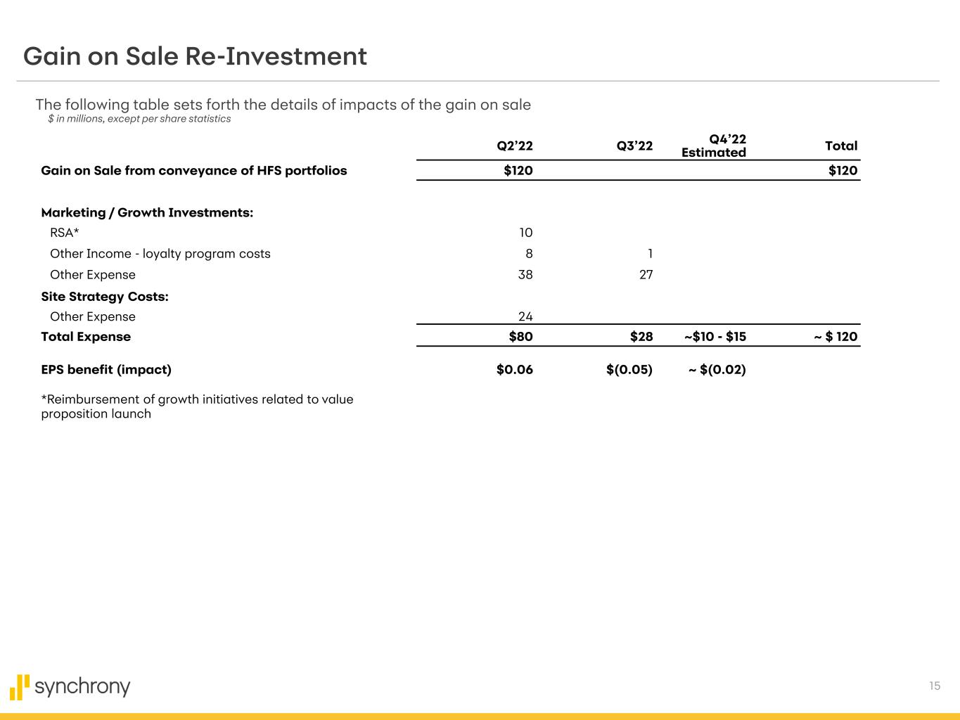 15 Gain on Sale Re-Investment Q2’22 Q3’22 Q4’22 Estimated Total Gain on Sale from conveyance of HFS portfolios $120 $120 Marketing / Growth Investments: RSA* 10 Other Income - loyalty program costs 8 1 Other Expense 38 27 Site Strategy Costs: Other Expense 24 Total Expense $80 $28 ~$10 - $15 ~ $ 120 EPS benefit (impact) $0.06 $(0.05) ~ $(0.02) *Reimbursement of growth initiatives related to value proposition launch The following table sets forth the details of impacts of the gain on sale $ in millions, except per share statistics