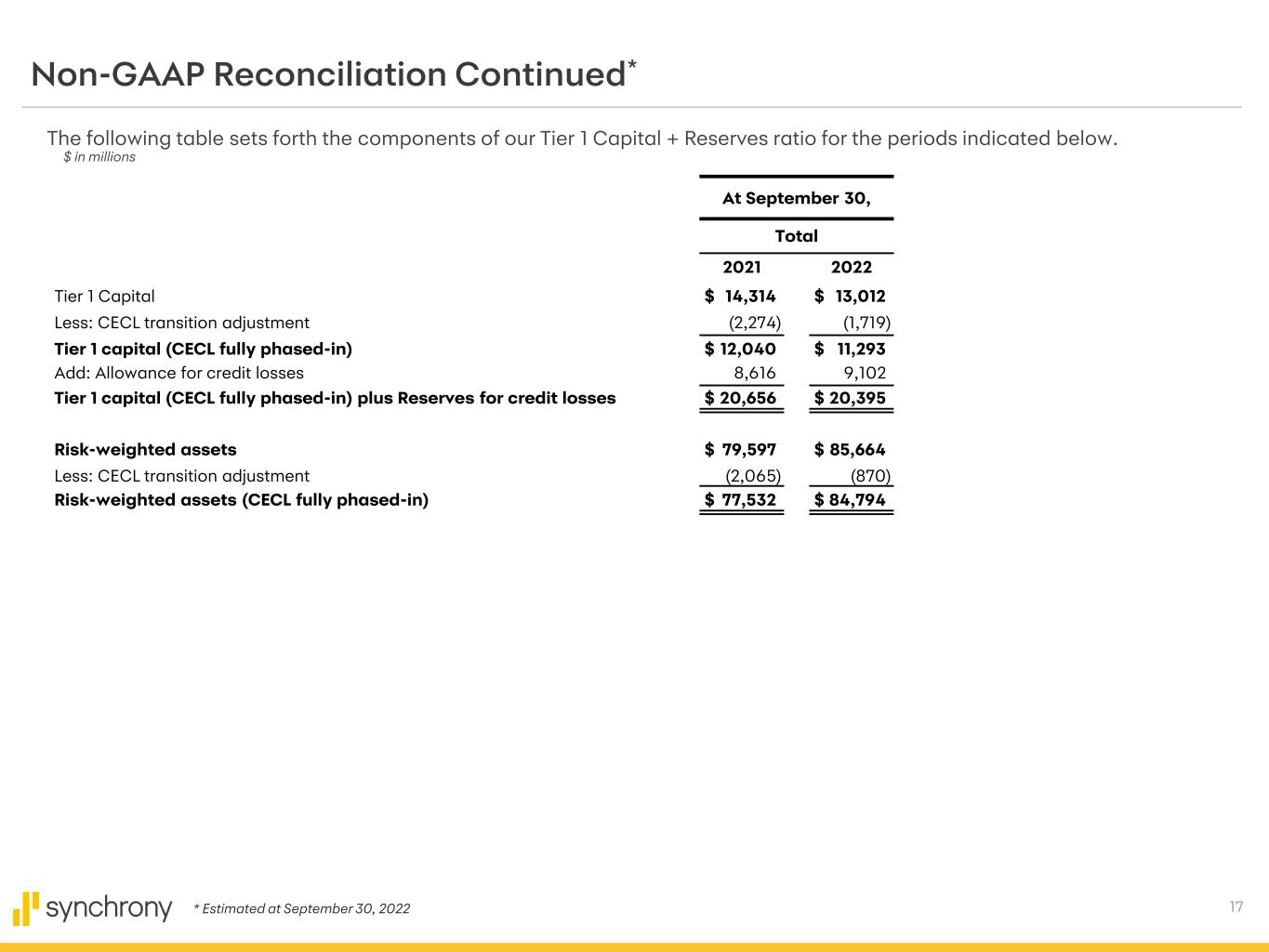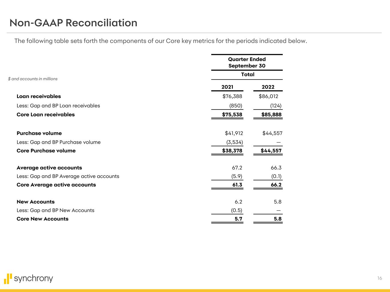 16 Non-GAAP Reconciliation The following table sets forth the components of our Core key metrics for the periods indicated below. $ and accounts in millions Quarter Ended September 30 Total 2021 2022 Loan receivables $76,388 $86,012 Less: Gap and BP Loan receivables (850) (124) Core Loan receivables $75,538 $85,888 Purchase volume $41,912 $44,557 Less: Gap and BP Purchase volume (3,534) — Core Purchase volume $38,378 $44,557 Average active accounts 67.2 66.3 Less: Gap and BP Average active accounts (5.9) (0.1) Core Average active accounts 61.3 66.2 New Accounts 6.2 5.8 Less: Gap and BP New Accounts (0.5) — Core New Accounts 5.7 5.8