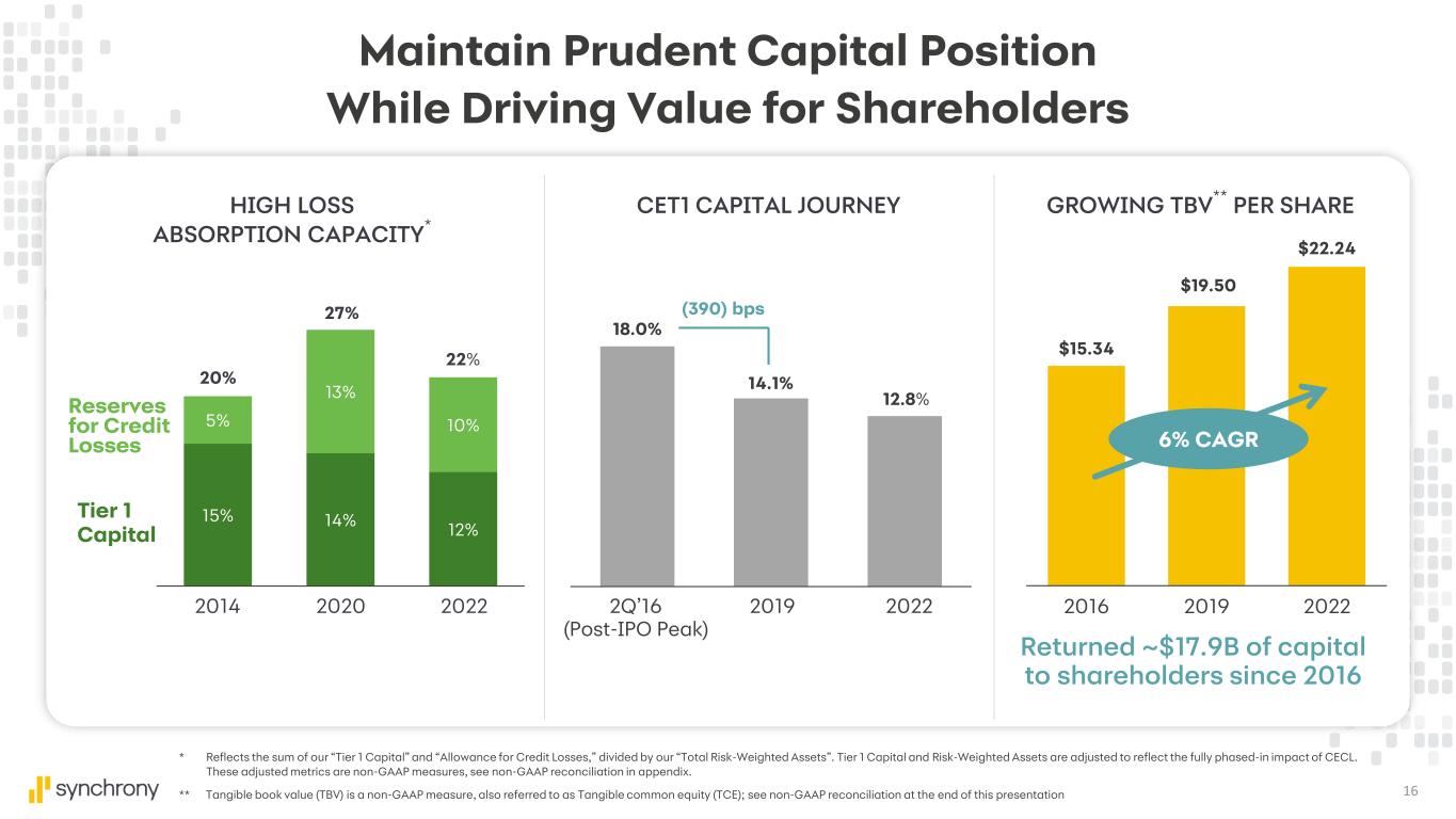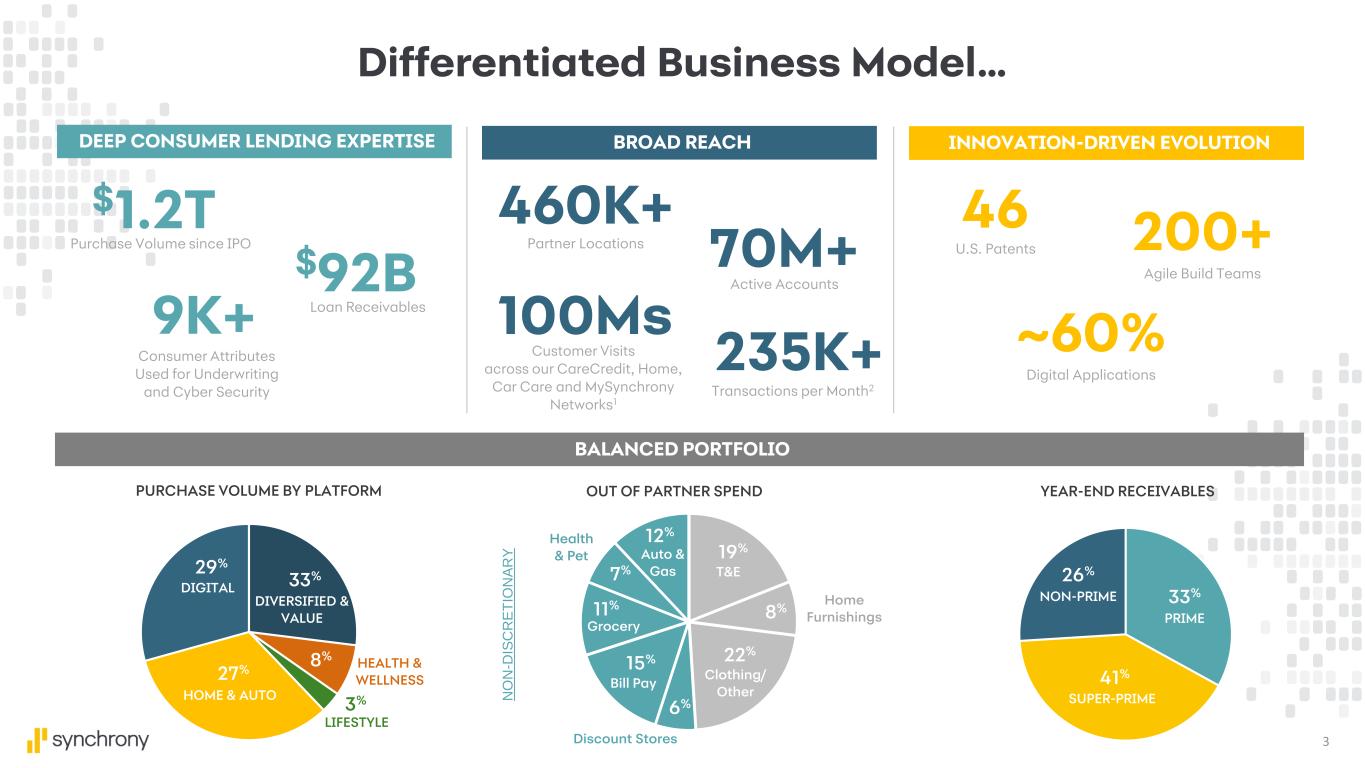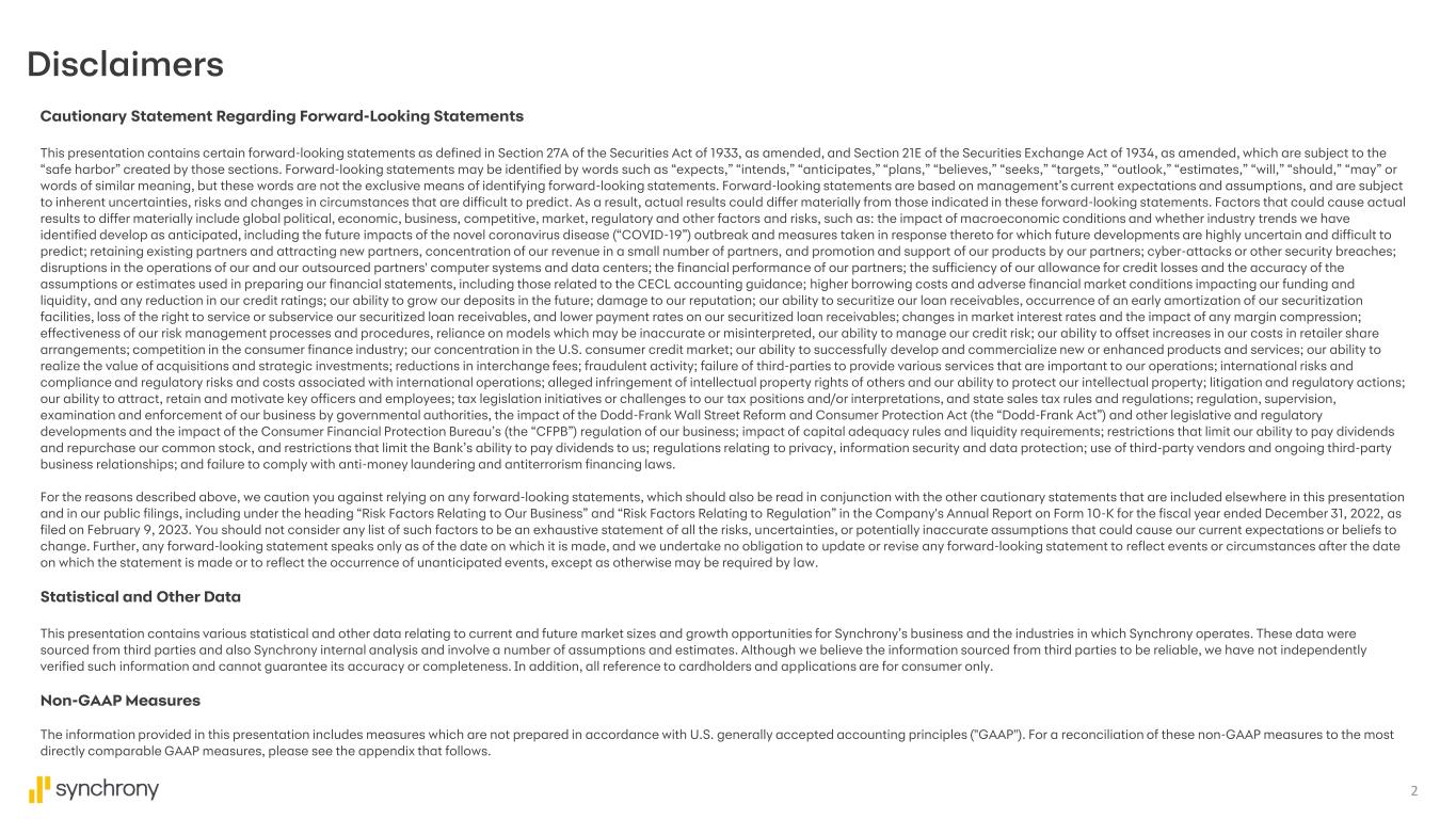 2 Disclaimers Cautionary Statement Regarding Forward-Looking Statements This presentation contains certain forward-looking statements as defined in Section 27A of the Securities Act of 1933, as amended, and Section 21E of the Securities Exchange Act of 1934, as amended, which are subject to the “safe harbor” created by those sections. Forward-looking statements may be identified by words such as “expects,” “intends,” “anticipates,” “plans,” “believes,” “seeks,” “targets,” “outlook,” “estimates,” “will,” “should,” “may” or words of similar meaning, but these words are not the exclusive means of identifying forward-looking statements. Forward-looking statements are based on management’s current expectations and assumptions, and are subject to inherent uncertainties, risks and changes in circumstances that are difficult to predict. As a result, actual results could differ materially from those indicated in these forward-looking statements. Factors that could cause actual results to differ materially include global political, economic, business, competitive, market, regulatory and other factors and risks, such as: the impact of macroeconomic conditions and whether industry trends we have identified develop as anticipated, including the future impacts of the novel coronavirus disease (“COVID-19”) outbreak and measures taken in response thereto for which future developments are highly uncertain and difficult to predict; retaining existing partners and attracting new partners, concentration of our revenue in a small number of partners, and promotion and support of our products by our partners; cyber-attacks or other security breaches; disruptions in the operations of our and our outsourced partners' computer systems and data centers; the financial performance of our partners; the sufficiency of our allowance for credit losses and the accuracy of the assumptions or estimates used in preparing our financial statements, including those related to the CECL accounting guidance; higher borrowing costs and adverse financial market conditions impacting our funding and liquidity, and any reduction in our credit ratings; our ability to grow our deposits in the future; damage to our reputation; our ability to securitize our loan receivables, occurrence of an early amortization of our securitization facilities, loss of the right to service or subservice our securitized loan receivables, and lower payment rates on our securitized loan receivables; changes in market interest rates and the impact of any margin compression; effectiveness of our risk management processes and procedures, reliance on models which may be inaccurate or misinterpreted, our ability to manage our credit risk; our ability to offset increases in our costs in retailer share arrangements; competition in the consumer finance industry; our concentration in the U.S. consumer credit market; our ability to successfully develop and commercialize new or enhanced products and services; our ability to realize the value of acquisitions and strategic investments; reductions in interchange fees; fraudulent activity; failure of third-parties to provide various services that are important to our operations; international risks and compliance and regulatory risks and costs associated with international operations; alleged infringement of intellectual property rights of others and our ability to protect our intellectual property; litigation and regulatory actions; our ability to attract, retain and motivate key officers and employees; tax legislation initiatives or challenges to our tax positions and/or interpretations, and state sales tax rules and regulations; regulation, supervision, examination and enforcement of our business by governmental authorities, the impact of the Dodd-Frank Wall Street Reform and Consumer Protection Act (the “Dodd-Frank Act”) and other legislative and regulatory developments and the impact of the Consumer Financial Protection Bureau’s (the “CFPB”) regulation of our business; impact of capital adequacy rules and liquidity requirements; restrictions that limit our ability to pay dividends and repurchase our common stock, and restrictions that limit the Bank’s ability to pay dividends to us; regulations relating to privacy, information security and data protection; use of third-party vendors and ongoing third-party business relationships; and failure to comply with anti-money laundering and antiterrorism financing laws. For the reasons described above, we caution you against relying on any forward-looking statements, which should also be read in conjunction with the other cautionary statements that are included elsewhere in this presentation and in our public filings, including under the heading “Risk Factors Relating to Our Business” and “Risk Factors Relating to Regulation” in the Company's Annual Report on Form 10-K for the fiscal year ended December 31, 2022, as filed on February 9, 2023. You should not consider any list of such factors to be an exhaustive statement of all the risks, uncertainties, or potentially inaccurate assumptions that could cause our current expectations or beliefs to change. Further, any forward-looking statement speaks only as of the date on which it is made, and we undertake no obligation to update or revise any forward-looking statement to reflect events or circumstances after the date on which the statement is made or to reflect the occurrence of unanticipated events, except as otherwise may be required by law. Statistical and Other Data This presentation contains various statistical and other data relating to current and future market sizes and growth opportunities for Synchrony’s business and the industries in which Synchrony operates. These data were sourced from third parties and also Synchrony internal analysis and involve a number of assumptions and estimates. Although we believe the information sourced from thi