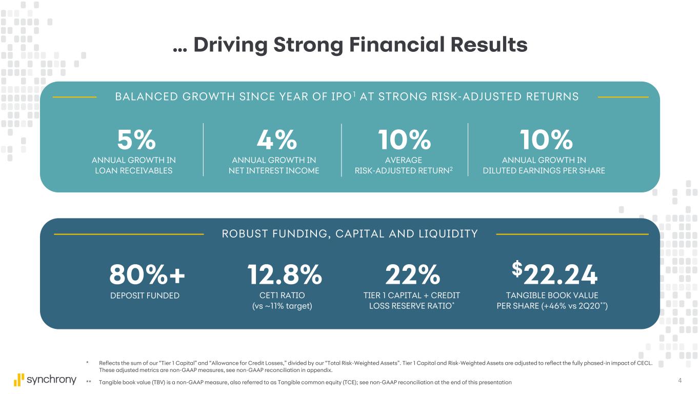 3 Differentiated Business Model… $1.2T Purchase Volume since IPO $92B Loan Receivables 70M+ Active Accounts 46 U.S. Patents 200+ Agile Build Teams Transactions per Month2 235K+ 100Ms Customer Visits across our CareCredit, Home, Car Care and MySynchrony Networks1 N O N -D IS C R E T IO N A R Y OUT OF PARTNER SPENDPURCHASE VOLUME BY PLATFORM Clothing/ Other T&E Home Furnishings Discount Stores Grocery Health & Pet Auto & Gas 19% 22% 12% 7% 11% 15% 6% 8% Bill Pay 33% 29% 3% 8% 27% DIGITAL DIVERSIFIED & VALUE HEALTH & WELLNESS LIFESTYLE DEEP CONSUMER LENDING EXPERTISE INNOVATION-DRIVEN EVOLUTIONBROAD REACH BALANCED PORTFOLIO HOME & AUTO 9K+ Consumer Attributes Used for Underwriting and Cyber Security 460K+ Partner Locations ~60% Digital Applications NON-PRIME 26% SUPER-PRIME 41% PRIME 33% YEAR-END RECEIVABLES