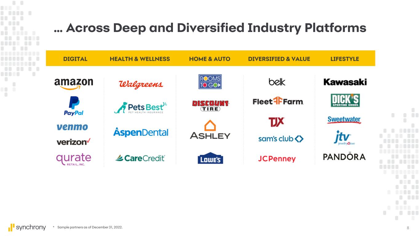 7 28.2% 40.6% 31.3% Efficient Partner Model Builds Broad Cardholder Base … BROAD, MASS-MARKET REACH #1 in total cardholders1 1.7 cards per cardholder 79% 73% 21% 27% 2019 Today PRODUCTS WITH WIDE APPEAL Millennials and Gen Z Baby Boomers and Gen X LOW COST, HIGH VALUE ~$1,200 ~6.5 ~$220 average monthly spend2 average balance2 Co-Brand5 Synchrony 4 Industry5 ~$18 >2x >4x ~$350+ lifetime value of an account6 years average relationship $50 – $100k Median: $70k ~$18 cost to acquire an account <$50k $100k+ Loan Mix Shifting as Younger Borrowers Adopt Cards Accounts Across Broad Spectrum of Income Levels3 Partner Model Drives Efficient Cost to Acquire