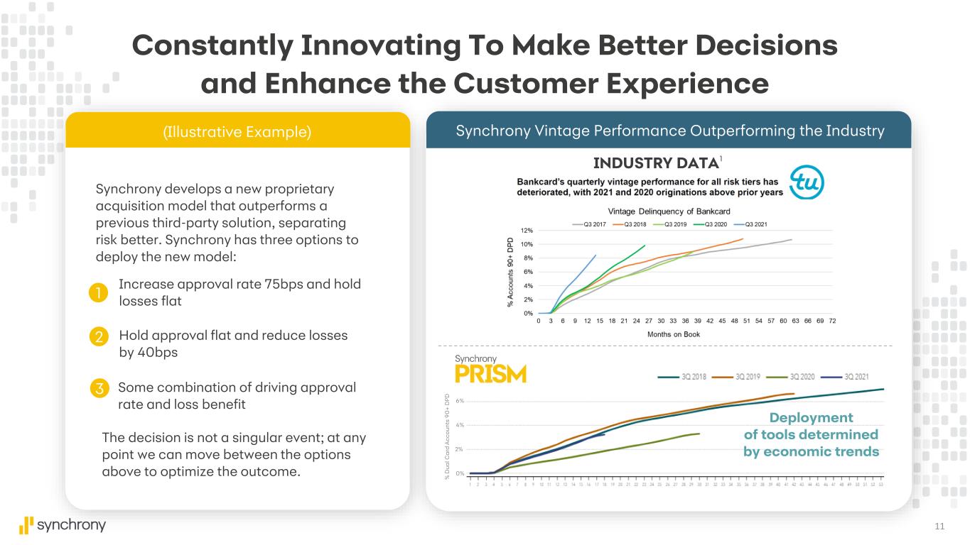 10 Proprietary Data and Multidimensional Underwriting Enable Greater Predictive Precision for a Similar Level of Risk Credit Bureau Trended Data • Payment/Delinquency History • Inquiries/Time on File • Revolving Balances/Lines Alternative Data • Utility and Telecom Data • Income Assets/Cash Flow • Payday Loan Synchrony Data • 100MM+1 customers and billions of transactions Partner-Specific Data • Customer engagement (e.g., frequency, spend) • SKU and category spend of basket Biometric Data • Device identification and usage • Consumer browsing history Authentication • Billions of Synchrony data points • Third-party customer data Knowing who the customer is and why they are shopping enables us to make better credit and fraud decisions REAL-TIME CREDIT DECISIONING