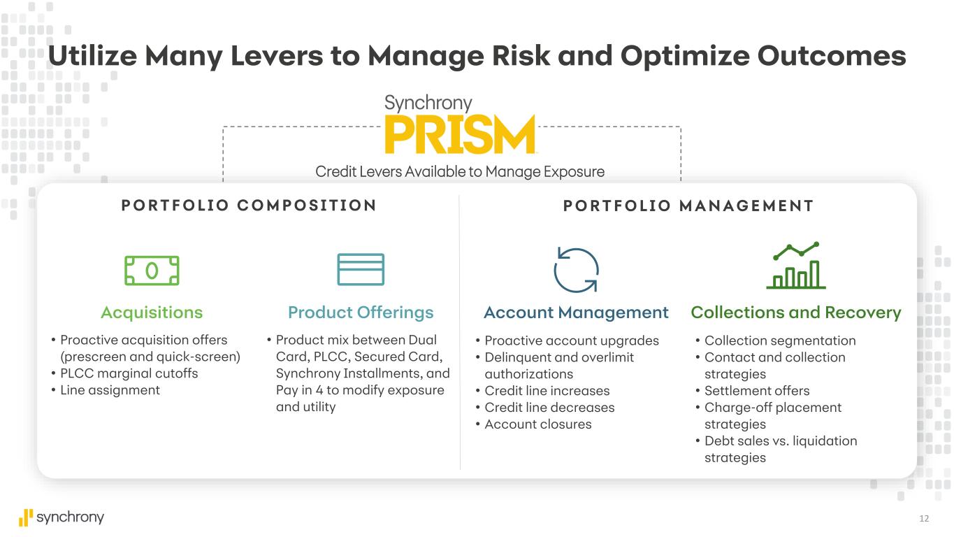 11 Constantly Innovating To Make Better Decisions and Enhance the Customer Experience Synchrony develops a new proprietary acquisition model that outperforms a previous third-party solution, separating risk better. Synchrony has three options to deploy the new model: 1 Increase approval rate 75bps and hold losses flat 2 Hold approval flat and reduce losses by 40bps The decision is not a singular event; at any point we can move between the options above to optimize the outcome. 3 Some combination of driving approval rate and loss benefit Synchrony Vintage Performance Outperforming the Industry INDUSTRY DATA1 (Illustrative Example) Deployment of tools determined by economic trends % D u a l C a rd A c c o u n ts 9 0 + D P D 6% 4% 2% 0%