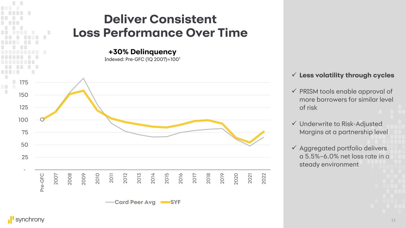 12 P O R T F O L I O C O M P O S I T I O N Utilize Many Levers to Manage Risk and Optimize Outcomes P O R T F O L I O M A N A G E M E N T Credit Levers Available to Manage Exposure • Proactive acquisition offers (prescreen and quick-screen) • PLCC marginal cutoffs • Line assignment • Product mix between Dual Card, PLCC, Secured Card, Synchrony Installments, and Pay in 4 to modify exposure and utility • Proactive account upgrades • Delinquent and overlimit authorizations • Credit line increases • Credit line decreases • Account closures • Collection segmentation • Contact and collection strategies • Settlement offers • Charge-off placement strategies • Debt sales vs. liquidation strategies Acquisitions Product Offerings Account Management Collections and Recovery
