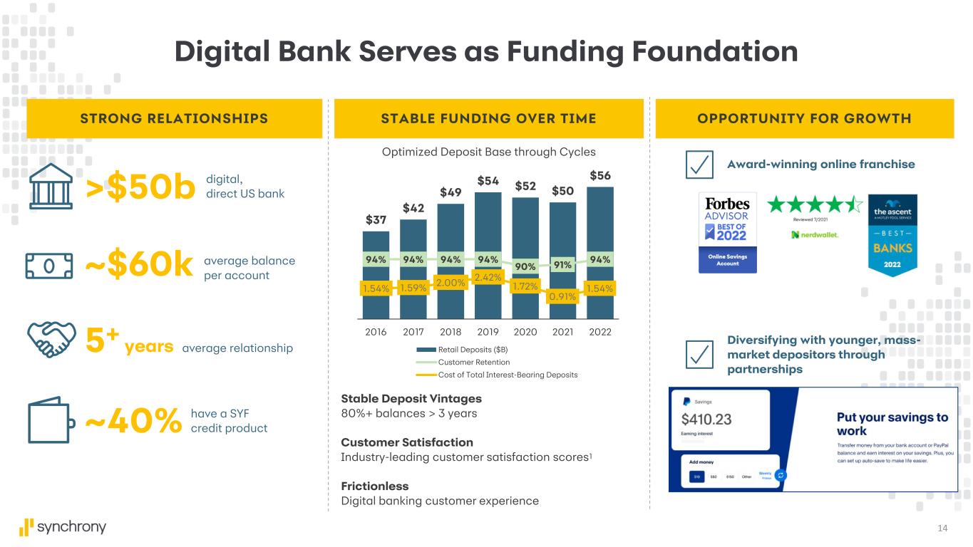13 Deliver Consistent Loss Performance Over Time ✓ Less volatility through cycles ✓ PRISM tools enable approval of more borrowers for similar level of risk ✓ Underwrite to Risk-Adjusted Margins at a partnership level ✓ Aggregated portfolio delivers a 5.5%–6.0% net loss rate in a steady environment - 25 50 75 100 125 150 175 P re -G FC 2 0 0 7 2 0 0 8 2 0 0 9 2 0 10 2 0 11 2 0 12 2 0 13 2 0 14 2 0 15 2 0 16 2 0 17 2 0 18 2 0 19 2 0 2 0 2 0 2 1 2 0 2 2 +30% Delinquency Indexed: Pre-GFC (1Q 2007)=1001 Card Peer Avg SYF