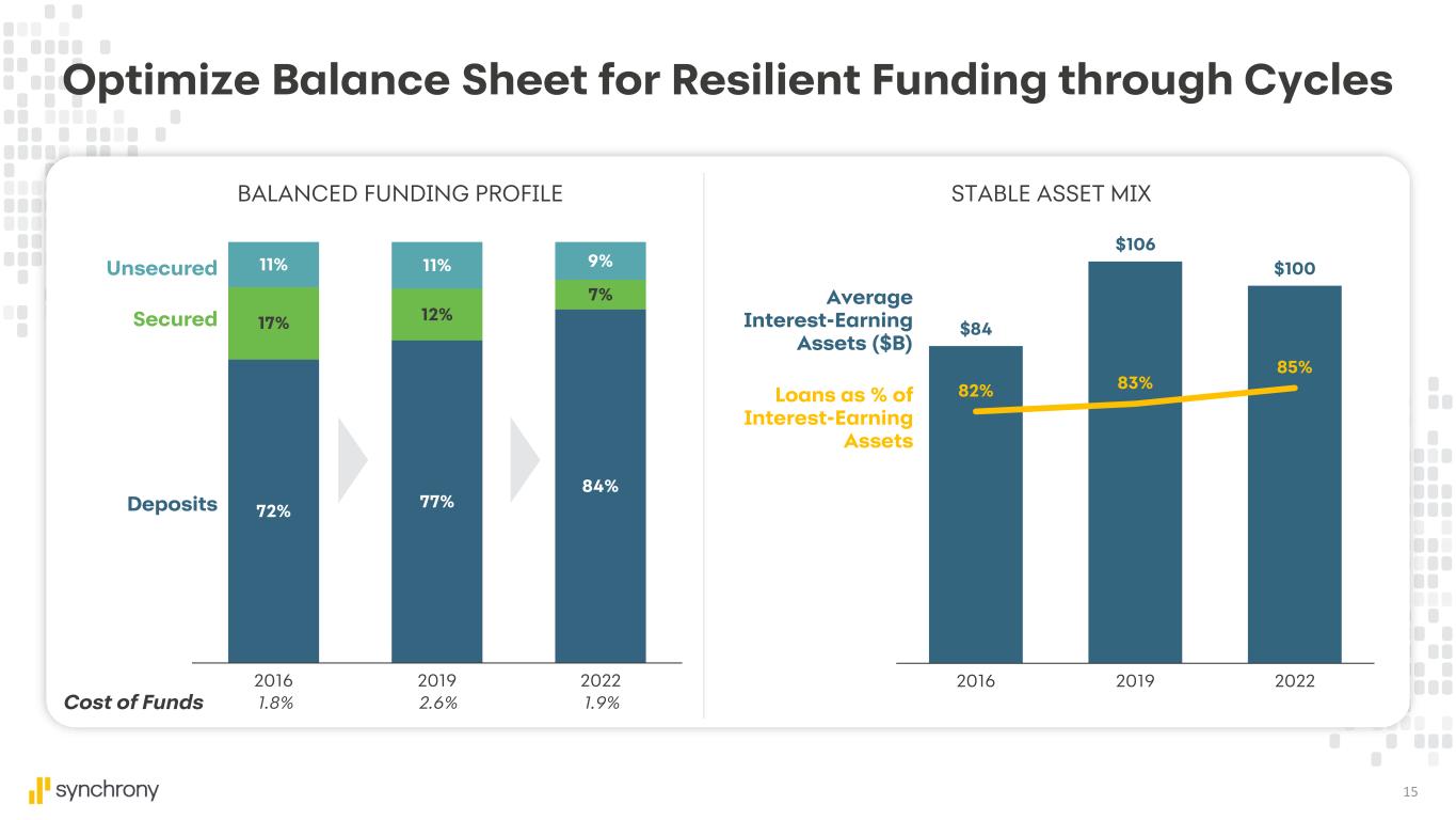 14 Digital Bank Serves as Funding Foundation STRONG RELATIONSHIPS STABLE FUNDING OVER TIME OPPORTUNITY FOR GROWTH ~$60k average balance per account Award-winning online franchise Diversifying with younger, mass- market depositors through partnerships ~40% 5+ years average relationship >$50b Stable Deposit Vintages 80%+ balances > 3 years Customer Satisfaction Industry-leading customer satisfaction scores1 Frictionless Digital banking customer experience $37 $42 $49 $54 $52 $50 $56 94% 94% 94% 94% 90% 91% 94% 60% 70% 80% 90% 100% 110% 120% 130% 140% $- $10.0 $20.0 $30.0 $40.0 $50.0 $60.0 2016 2017 2018 2019 2020 2021 2022 Retail Deposits ($B) Customer Retention Cost of Total Interest-Bearing Deposits 1.54% 1.59% 2.00% 2.42% 1.72% 0.91% 1.54% 0% 1% 1% 2% 2% 3% 3% digital, direct US bank have a SYF credit product Optimized Deposit Base through Cycles