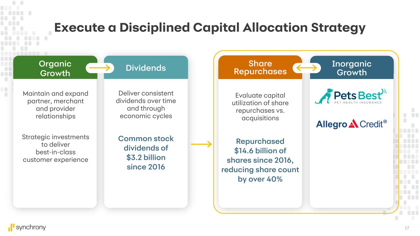 16 CET1 CAPITAL JOURNEY 18.0% 2Q’16 (Post-IPO Peak) 2019 14.1% 12.8% Returned ~$17.9B of capital to shareholders since 2016 Maintain Prudent Capital Position While Driving Value for Shareholders 2022 GROWING TBV ** PER SHARE 15% 14% 12% 5% 13% 10% 20% 27% 2014 2020 Tier 1 Capital Reserves for Credit Losses HIGH LOSS ABSORPTION CAPACITY * 2022 22% $15.34 $19.50 $22.24 2016 2019 2022 6% CAGR (390) bps ** Tangible book value (TBV) is a non-GAAP measure, also referred to as Tangible common equity (TCE); see non-GAAP reconciliation at the end of this presentation * Reflects the sum of our “Tier 1 Capital” and “Allowance for Credit Losses,” divided by our “Total Risk-Weighted Assets”. Tier 1 Capital and Risk-Weighted Assets are adjusted to reflect the fully phased-in impact of CECL. These adjusted metrics are non-GAAP measures, see non-GAAP reconciliation in appendix.