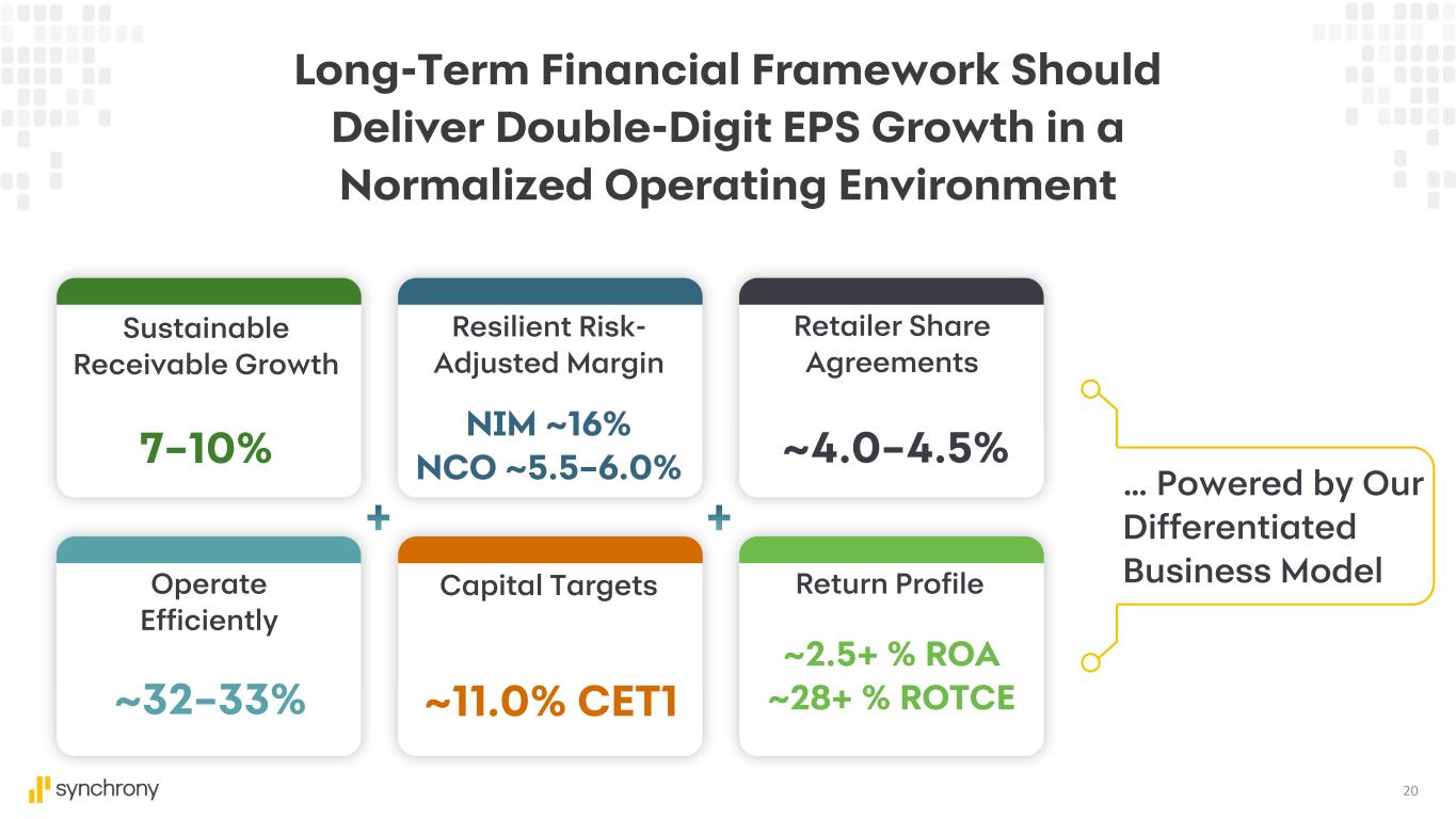 19 RSA/Purchase Volume2 Prime and Super Prime/EOP1,2 ~2.5+% ROA ~28+% ROTCE LONG-TERM TARGETS: … and Resilient Risk-Adjusted Returns through Evolving Environments * Risk-adjusted return (RAR) defined as net interest income minus retailer share agreements (RSA) and net charge offs (NCOs), divided by average loan receivables (ALR) -% 2% 4% 6% 8% 10% 12% 2009 2010 2011 2012 2013 2014 2015 2016 2017 2018 2019 2020 2021 2022 RAR* RSA/ALR2 NCO/ALR2 Financial Crisis CARD Act Took Effect Credit Normalization COVID-19 Pandemic 63% 72% 72% 74% 74% 72% 78% 74% 1.09% 1.83% 2.53% 2.41% 2.23% 2.58% 2.73% 2.40%