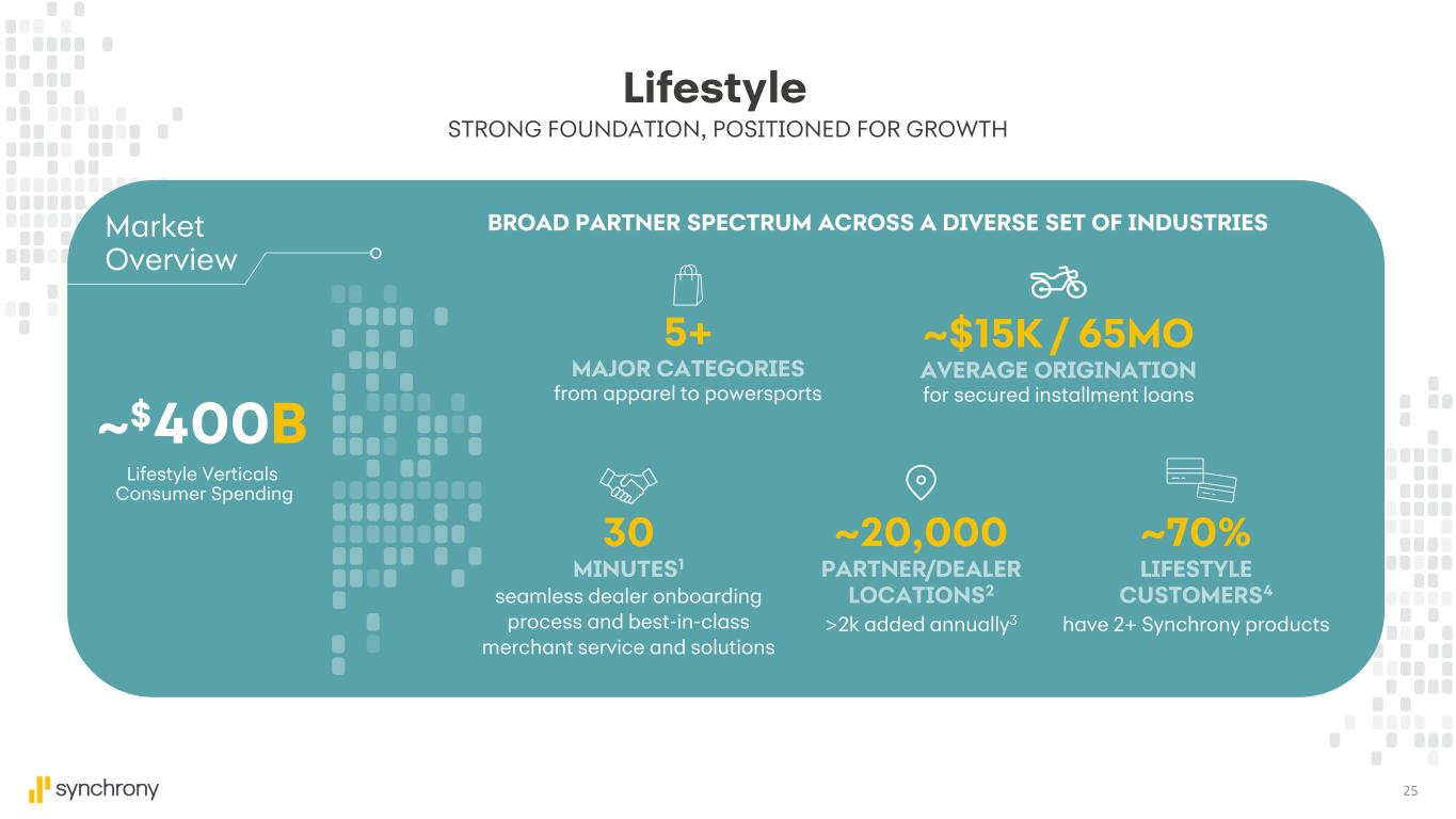 24 >$900B D&V Market ~$125B Current Partner Sales1 DELIVER OMNICHANNEL EXPERIENCES AND EVERYDAY VALUE ACROSS SCALED RETAIL PARTNERS 9+ year CARDHOLDER TENURE on average across Diversified & Value POWER COMPELLING OUTCOMES FOR OUR PARTNERS AND CUSTOMERS 20+ year RELATIONSHIPS average length of relationship >50% WORLD SALES +500bps over last three years ~50% D&V CUSTOMERS2 have 2+ Synchrony products ~65 million TRANSACTIONS per month, +16% in 2022 >20% DIGITAL SALES as a percent of total D&V purchase volume Diversified & Value Market Overview