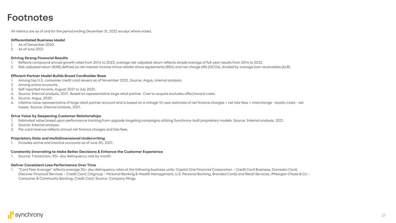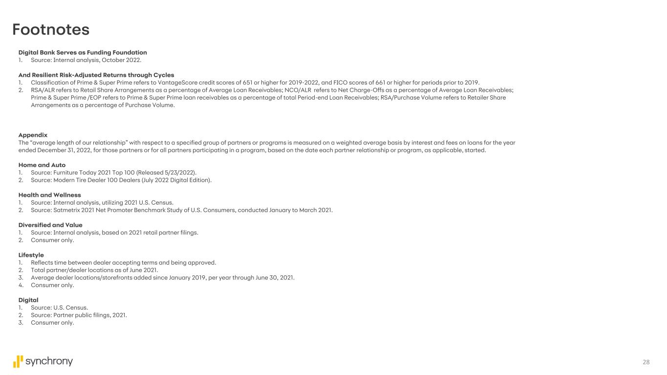 27 Footnotes All metrics are as of and for the period ending December 31, 2022 except where noted. Differentiated Business Model 1. As of December 2020. 2. As of June 2021. Driving Strong Financial Results 1. Reflects compound annual growth rates from 2014 to 2022; average risk-adjusted return reflects simple average of full-year results from 2014 to 2022. 2. Risk-adjusted return (RAR) defined as net interest income minus retailer share agreements (RSA) and net charge offs (NCOs), divided by average loan receivables (ALR). Efficient Partner Model Builds Broad Cardholder Base 1. Among top U.S. consumer credit card issuers as of November 2022. Source: Argus, internal analysis. 2. Among active accounts. 3. Self-reported income, August 2021 to July 2022. 4. Source: Internal analysis, 2021. Based on representative large retail partner. Cost to acquire excludes offer/reward costs. 5. Source: Argus, 2020. 6. Lifetime value representative of large retail partner account and is based on a vintage 10-year estimate of net finance charges + net late fees + interchange - loyalty costs - net losses. Source: Internal analysis, 2021. Drive Value by Deepening Customer Relationships 1. Estimated value based upon performance tracking from upgrade targeting campaigns utilizing Synchrony-built proprietary models. Source: Internal analysis, 2021. 2. Source: Internal analysis. 3. Per-card revenue reflects annual net finance charges and late fees. Proprietary Data and Multidimensional Underwriting 1. Includes active and inactive accounts as of June 30, 2021. Constantly Innovating to Make Better Decisions & Enhance the Customer Experience 1. Source: TransUnion, 90+ day delinquency rate by month. Deliver Consistent Loss Performance Over Time 1. “Card Peer Average” reflects average 30+ day delinquency rates at the following business units: Capital One Financial Corporation – Credit Card Business, Domestic Card; Discover Financial Services – Credit Card; Citigroup – Personal Banking & Wealth Management, U.S. Personal Banking, Branded Cards and Retail Services; JPMorgan Chase & Co – Consumer & Community Banking, Credit Card. Source: Company filings.