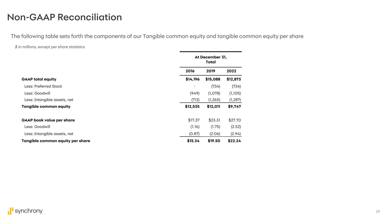 29 Non-GAAP Reconciliation The following table sets forth the components of our Tangible common equity and tangible common equity per share At December 31, Total 2016 2019 2022 GAAP total equity $14,196 $15,088 $12,873 Less: Preferred Stock - (734) (734) Less: Goodwill (949) (1,078) (1,105) Less: Intangible assets, net (712) (1,265) (1,287) Tangible common equity $12,535 $12,011 $9,747 GAAP book value per share $17.37 $23.31 $27.70 Less: Goodwill (1.16) (1.75) (2.52) Less: Intangible assets, net (0.87) (2.06) (2.94) Tangible common equity per share $15.34 $19.50 $22.24 $ in millions, except per share statistics