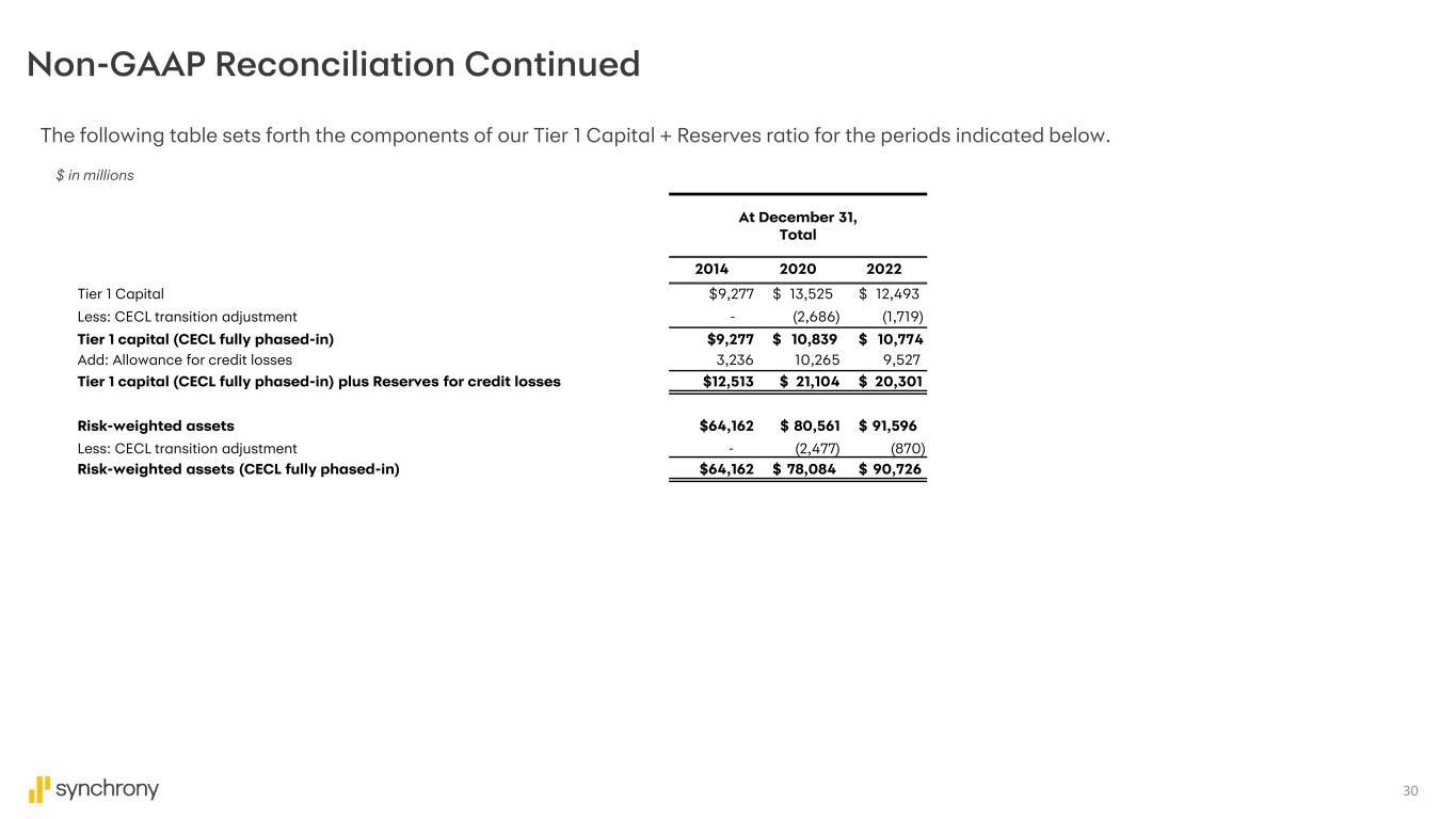30 Non-GAAP Reconciliation Continued The following table sets forth the components of our Tier 1 Capital + Reserves ratio for the periods indicated below. $ in millions At December 31, Total 2014 2020 2022 Tier 1 Capital $9,277 $ 13,525 $ 12,493 Less: CECL transition adjustment - (2,686) (1,719) Tier 1 capital (CECL fully phased-in) $9,277 $ 10,839 $ 10,774 Add: Allowance for credit losses 3,236 10,265 9,527 Tier 1 capital (CECL fully phased-in) plus Reserves for credit losses $12,513 $ 21,104 $ 20,301 Risk-weighted assets $64,162 $ 80,561 $ 91,596 Less: CECL transition adjustment - (2,477) (870) Risk-weighted assets (CECL fully phased-in) $64,162 $ 78,084 $ 90,726