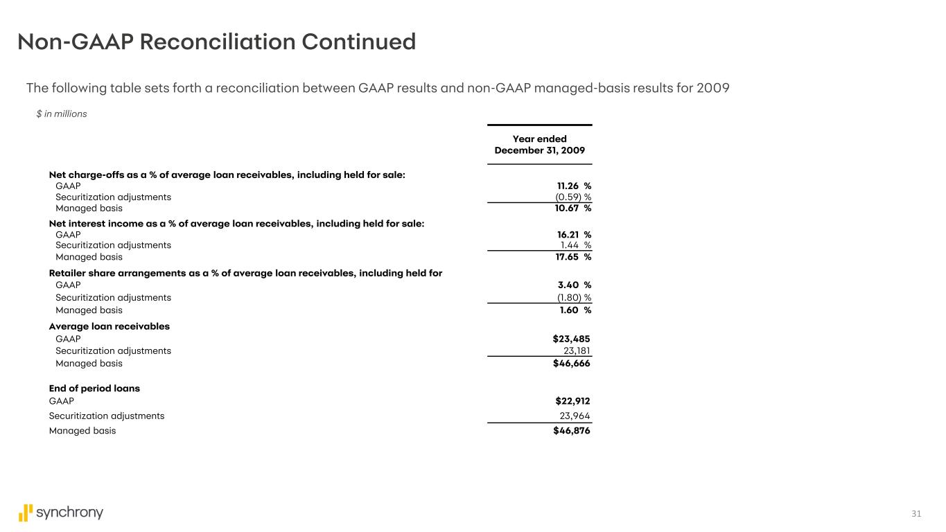 31 Non-GAAP Reconciliation Continued The following table sets forth a reconciliation between GAAP results and non-GAAP managed-basis results for 2009 $ in millions Year ended December 31, 2009 Net charge-offs as a % of average loan receivables, including held for sale: GAAP 11.26 % Securitization adjustments (0.59) % Managed basis 10.67 % Net interest income as a % of average loan receivables, including held for sale: GAAP 16.21 % Securitization adjustments 1.44 % Managed basis 17.65 % Retailer share arrangements as a % of average loan receivables, including held for GAAP 3.40 % Securitization adjustments (1.80) % Managed basis 1.60 % Average loan receivables GAAP $23,485 Securitization adjustments 23,181 Managed basis $46,666 End of period loans GAAP $22,912 Securitization adjustments 23,964 Managed basis $46,876