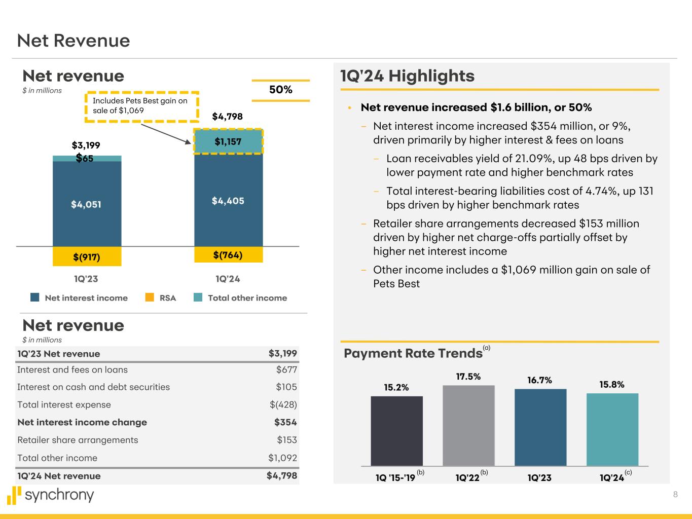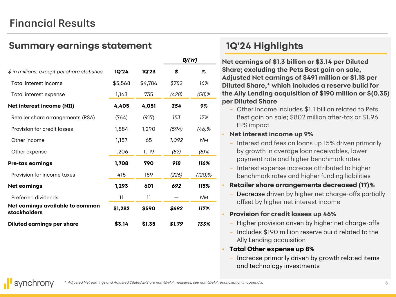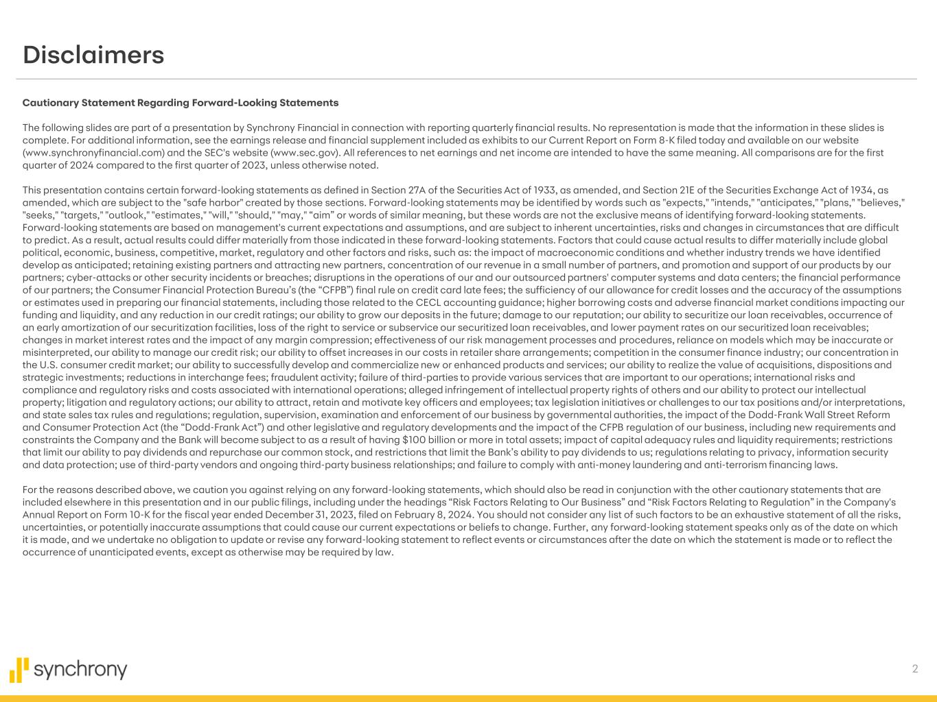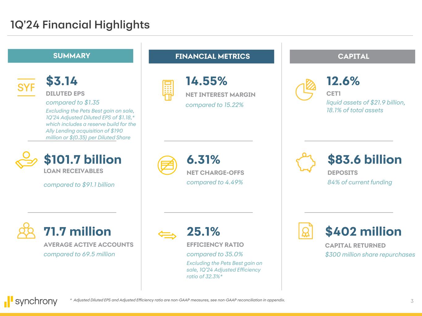 2 Cautionary Statement Regarding Forward-Looking Statements The following slides are part of a presentation by Synchrony Financial in connection with reporting quarterly financial results. No representation is made that the information in these slides is complete. For additional information, see the earnings release and financial supplement included as exhibits to our Current Report on Form 8-K filed today and available on our website (www.synchronyfinancial.com) and the SEC's website (www.sec.gov). All references to net earnings and net income are intended to have the same meaning. All comparisons are for the first quarter of 2024 compared to the first quarter of 2023, unless otherwise noted. This presentation contains certain forward-looking statements as defined in Section 27A of the Securities Act of 1933, as amended, and Section 21E of the Securities Exchange Act of 1934, as amended, which are subject to the "safe harbor" created by those sections. Forward-looking statements may be identified by words such as "expects," "intends," "anticipates," "plans," "believes," "seeks," "targets," "outlook," "estimates," "will," "should," "may," “aim” or words of similar meaning, but these words are not the exclusive means of identifying forward-looking statements. Forward-looking statements are based on management's current expectations and assumptions, and are subject to inherent uncertainties, risks and changes in circumstances that are difficult to predict. As a result, actual results could differ materially from those indicated in these forward-looking statements. Factors that could cause actual results to differ materially include global political, economic, business, competitive, market, regulatory and other factors and risks, such as: the impact of macroeconomic conditions and whether industry trends we have identified develop as anticipated; retaining existing partners and attracting new partners, concentration of our revenue in a small number of partners, and promotion and support of our products by our partners; cyber-attacks or other security incidents or breaches; disruptions in the operations of our and our outsourced partners' computer systems and data centers; the financial performance of our partners; the Consumer Financial Protection Bureau’s (the “CFPB”) final rule on credit card late fees; the sufficiency of our allowance for credit losses and the accuracy of the assumptions or estimates used in preparing our financial statements, including those related to the CECL accounting guidance; higher borrowing costs and adverse financial market conditions impacting our funding and liquidity, and any reduction in our credit ratings; our ability to grow our deposits in the future; damage to our reputation; our ability to securitize our loan receivables, occurrence of an early amortization of our securitization facilities, loss of the right to service or subservice our securitized loan receivables, and lower payment rates on our securitized loan receivables; changes in market interest rates and the impact of any margin compression; effectiveness of our risk management processes and procedures, reliance on models which may be inaccurate or misinterpreted, our ability to manage our credit risk; our ability to offset increases in our costs in retailer share arrangements; competition in the consumer finance industry; our concentration in the U.S. consumer credit market; our ability to successfully develop and commercialize new or enhanced products and services; our ability to realize the value of acquisitions, dispositions and strategic investments; reductions in interchange fees; fraudulent activity; failure of third-parties to provide various services that are important to our operations; international risks and compliance and regulatory risks and costs associated with international operations; alleged infringement of intellectual property rights of others and our ability to protect our intellectual property; litigation and regulatory actions; our ability to attract, retain and motivate key officers and employees; tax legislation initiatives or challenges to our tax positions and/or interpretations, and state sales tax rules and regulations; regulation, supervision, examination and enforcement of our business by governmental authorities, the impact of the Dodd-Frank Wall Street Reform and Consumer Protection Act (the “Dodd-Frank Act”) and other legislative and regulatory developments and the impact of the CFPB regulation of our business, including new requirements and constraints the Company and the Bank will become subject to as a result of having $100 billion or more in total assets; impact of capital adequacy rules and liquidity requirements; restrictions that limit our ability to pay dividends and repurchase our common stock, and restrictions that limit the Bank’s ability to pay dividends to us; regulations relating to privacy, information security and data protection; use of third-party vendors and ongoing third-party business relationships; and failure to comply with anti-money laundering and anti-terrorism financing laws. For the reasons described above, we caution you against relying on any forward-looking statements, which should also be read in conjunction with the other cautionary statements that are included elsewhere in this presentation and in our public filings, including under the headings “Risk Factors Relating to Our Business” and “Risk Factors Relating to Regulation” in the Company's Annual Report on Form 10-K for the fiscal year ended December 31, 2023, filed on February 8, 2024. You should not consider any list of such factors to be an exhaustive statement of all the risks, uncertainties, or potentially inaccurate assumptions that could cause our current expectations or beliefs to change. Further, any forward-looking statement speaks only as of the date on which it is made, and we undertake no obligation to update or revise any forward-lookin