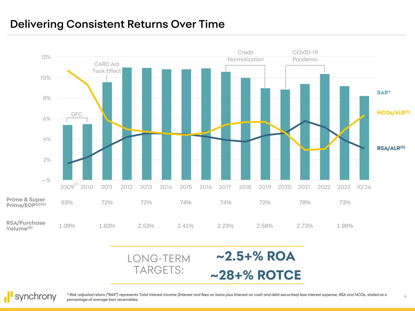 3 25.1% EFFICIENCY RATIO compared to 35.0% Excluding the Pets Best gain on sale, 1Q’24 Adjusted Efficiency ratio of 32.3%* $3.14 DILUTED EPS compared to $1.35 Excluding the Pets Best gain on sale, 1Q’24 Adjusted Diluted EPS of $1.18,* which includes a reserve build for the Ally Lending acquisition of $190 million or $(0.35) per Diluted Share 14.55% NET INTEREST MARGIN compared to 15.22% 12.6% CET1 liquid assets of $21.9 billion, 18.1% of total assets SUMMARY FINANCIAL METRICS CAPITAL 1Q'24 Financial Highlights $101.7 billion LOAN RECEIVABLES compared to $91.1 billion $83.6 billion DEPOSITS 84% of current funding 6.31% NET CHARGE-OFFS compared to 4.49% 71.7 million AVERAGE ACTIVE ACCOUNTS compared to 69.5 million $402 million CAPITAL RETURNED $300 million share repurchases * Adjusted Diluted EPS and Adjusted Efficiency ratio are non-GAAP measures, see non-GAAP reconciliation in appendix.