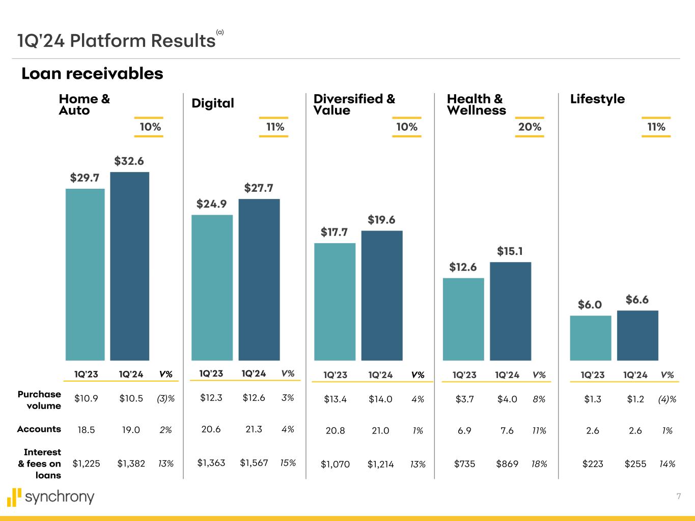 6 B/(W) $ in millions, except per share statistics 1Q'24 1Q'23 $ % Total interest income $5,568 $4,786 $782 16% Total interest expense 1,163 735 (428) (58)% Net interest income (NII) 4,405 4,051 354 9% Retailer share arrangements (RSA) (764) (917) 153 17% Provision for credit losses 1,884 1,290 (594) (46)% Other income 1,157 65 1,092 NM Other expense 1,206 1,119 (87) (8)% Pre-tax earnings 1,708 790 918 116% Provision for income taxes 415 189 (226) (120)% Net earnings 1,293 601 692 115% Preferred dividends 11 11 — NM Net earnings available to common stockholders $1,282 $590 $692 117% Diluted earnings per share $3.14 $1.35 $1.79 133% Summary earnings statement Financial Results 1Q'24 Highlights Net earnings of $1.3 billion or $3.14 per Diluted Share; excluding the Pets Best gain on sale, Adjusted Net earnings of $491 million or $1.18 per Diluted Share,* which includes a reserve build for the Ally Lending acquisition of $190 million or $(0.35) per Diluted Share – Other income includes $1.1 billion related to Pets Best gain on sale; $802 million after-tax or $1.96 EPS impact • Net interest income up 9% – Interest and fees on loans up 15% driven primarily by growth in average loan receivables, lower payment rate and higher benchmark rates – Interest expense increase attributed to higher benchmark rates and higher funding liabilities • Retailer share arrangements decreased (17)% – Decrease driven by higher net charge-offs partially offset by higher net interest income • Provision for credit losses up 46% – Higher provision driven by higher net charge-offs – Includes $190 million reserve build related to the Ally Lending acquisition • Total Other expense up 8% – Increase primarily driven by growth related items and technology investments * Adjusted Net earnings and Adjusted Diluted EPS are non-GAAP measures, see non-GAAP reconciliation in appendix.