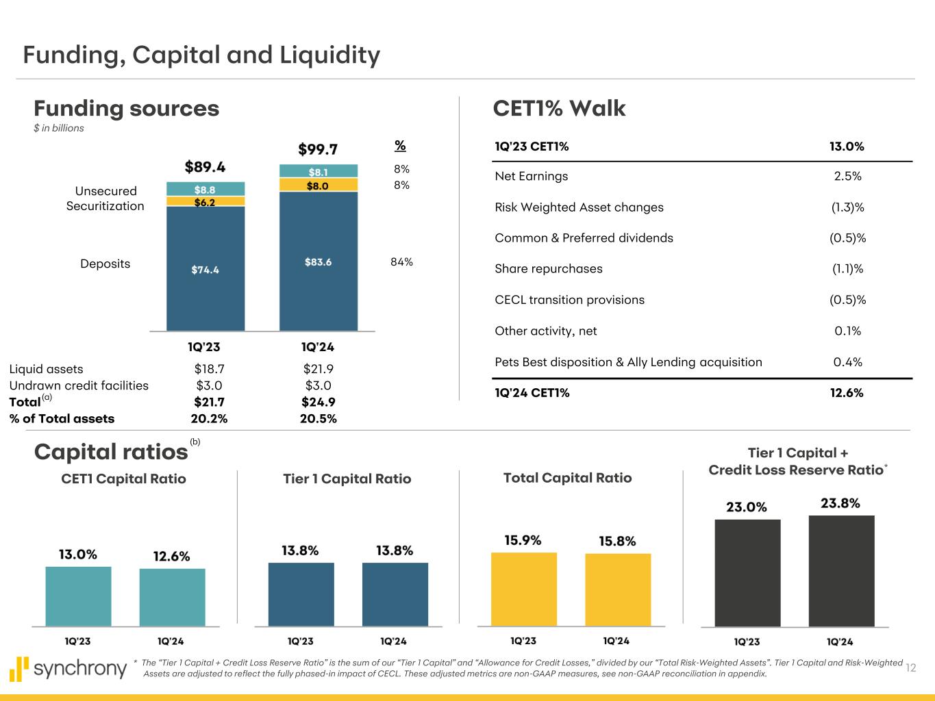 12 CET1% Walk Tier 1 Capital + Credit Loss Reserve Ratio* Capital ratios Funding, Capital and Liquidity Funding sources $ in billions % 8% 8% CET1 Capital Ratio Tier 1 Capital Ratio Total Capital Ratio * The “Tier 1 Capital + Credit Loss Reserve Ratio” is the sum of our “Tier 1 Capital” and “Allowance for Credit Losses,” divided by our “Total Risk-Weighted Assets”. Tier 1 Capital and Risk-Weighted Assets are adjusted to reflect the fully phased-in impact of CECL. These adjusted metrics are non-GAAP measures, see non-GAAP reconciliation in appendix. Unsecured Securitization Deposits Liquid assets $18.7 $21.9 Undrawn credit facilities $3.0 $3.0 Total $21.7 $24.9 % of Total assets 20.2% 20.5% (a) (b) 84% 1Q'23 CET1% 13.0% Net Earnings 2.5% Risk Weighted Asset changes (1.3)% Common & Preferred dividends (0.5)% Share repurchases (1.1)% CECL transition provisions (0.5)% Other activity, net 0.1% Pets Best disposition & Ally Lending acquisition 0.4% 1Q'24 CET1% 12.6%