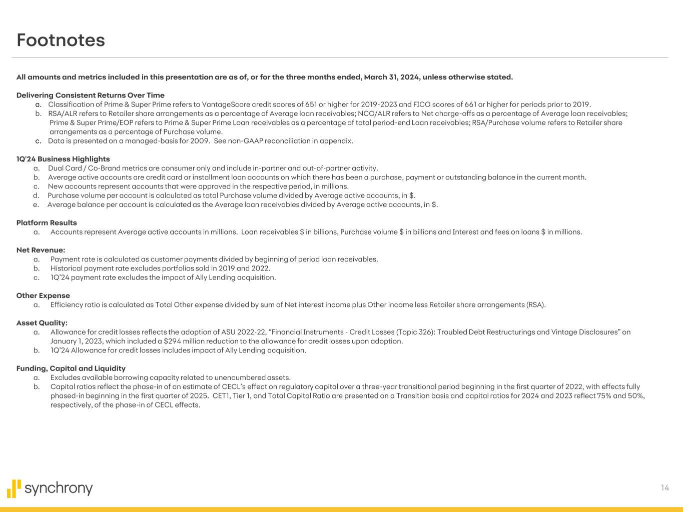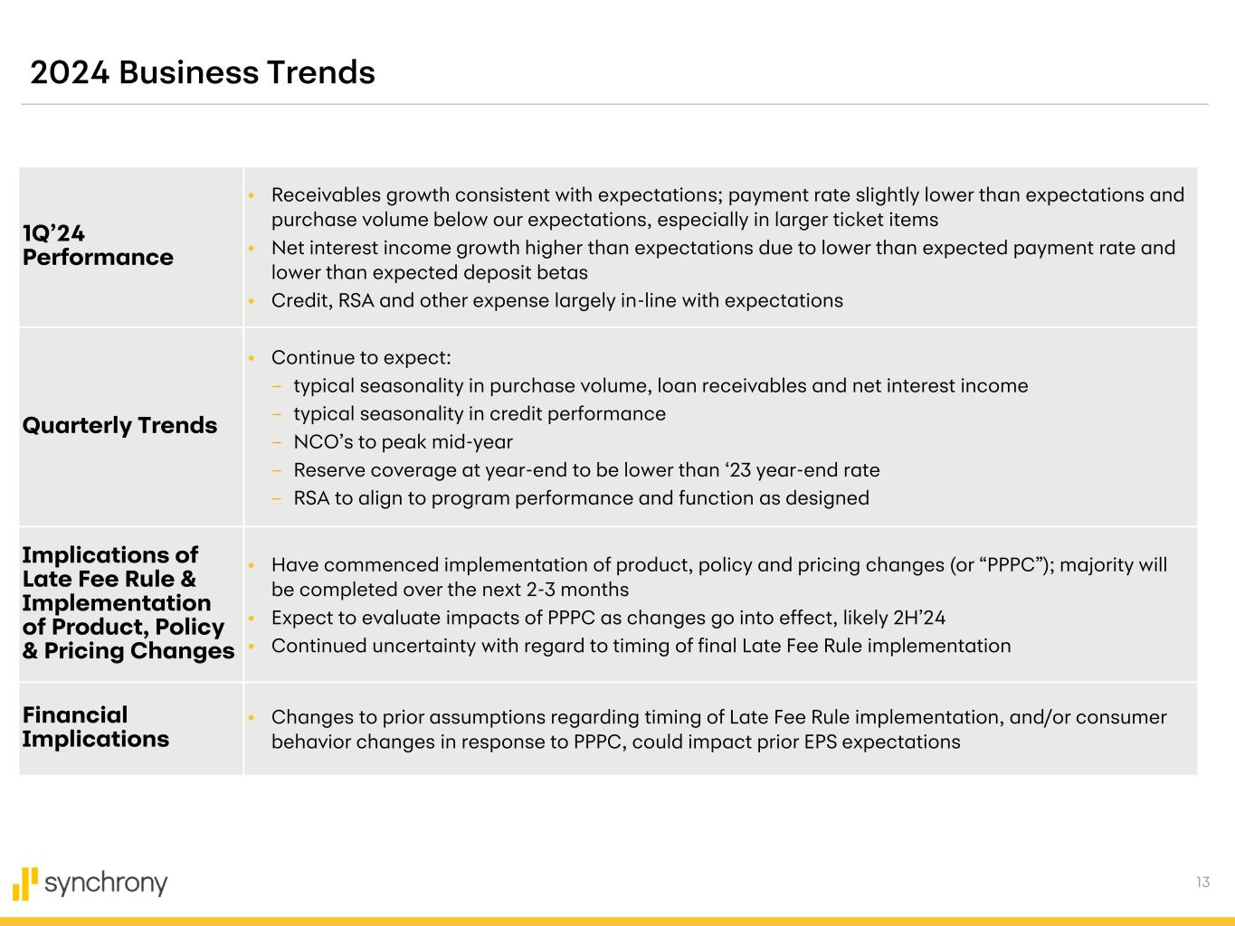 13 2024 Business Trends 1Q’24 Performance • Receivables growth consistent with expectations; payment rate slightly lower than expectations and purchase volume below our expectations, especially in larger ticket items • Net interest income growth higher than expectations due to lower than expected payment rate and lower than expected deposit betas • Credit, RSA and other expense largely in-line with expectations Quarterly Trends • Continue to expect: – typical seasonality in purchase volume, loan receivables and net interest income – typical seasonality in credit performance – NCO’s to peak mid-year – Reserve coverage at year-end to be lower than ‘23 year-end rate – RSA to align to program performance and function as designed Implications of Late Fee Rule & Implementation of Product, Policy & Pricing Changes • Have commenced implementation of product, policy and pricing changes (or “PPPC”); majority will be completed over the next 2-3 months • Expect to evaluate impacts of PPPC as changes go into effect, likely 2H’24 • Continued uncertainty with regard to timing of final Late Fee Rule implementation Financial Implications • Changes to prior assumptions regarding timing of Late Fee Rule implementation, and/or consumer behavior changes in response to PPPC, could impact prior EPS expectations