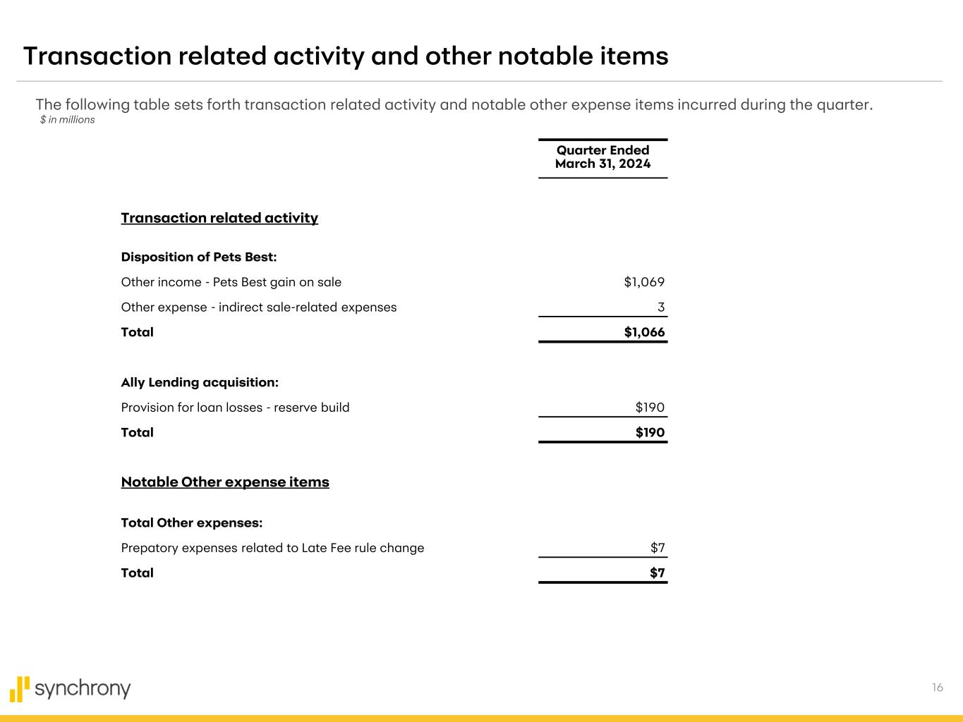 16 Transaction related activity and other notable items The following table sets forth transaction related activity and notable other expense items incurred during the quarter. Quarter Ended March 31, 2024 Transaction related activity Disposition of Pets Best: Other income - Pets Best gain on sale $1,069 Other expense - indirect sale-related expenses 3 Total $1,066 Ally Lending acquisition: Provision for loan losses - reserve build $190 Total $190 Notable Other expense items Total Other expenses: Prepatory expenses related to Late Fee rule change $7 Total $7 $ in millions