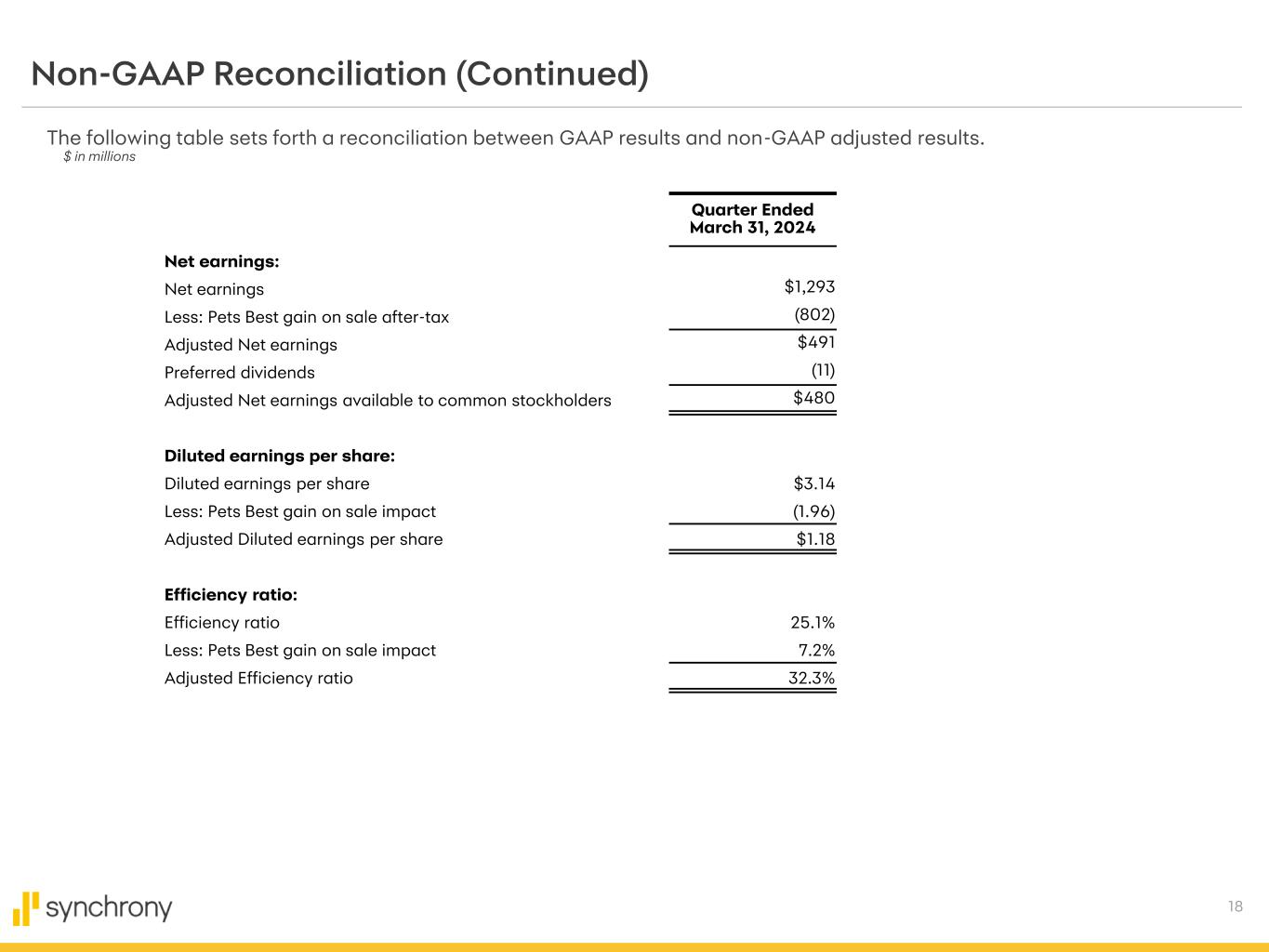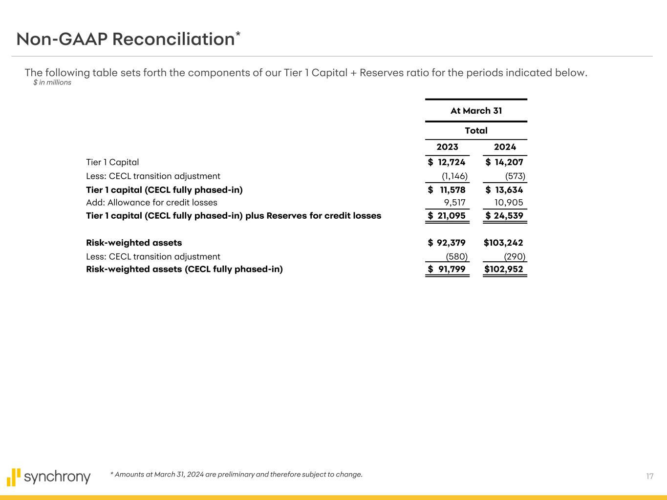 17 Non-GAAP Reconciliation* The following table sets forth the components of our Tier 1 Capital + Reserves ratio for the periods indicated below. $ in millions At March 31 Total 2023 2024 Tier 1 Capital $ 12,724 $ 14,207 Less: CECL transition adjustment (1,146) (573) Tier 1 capital (CECL fully phased-in) $ 11,578 $ 13,634 Add: Allowance for credit losses 9,517 10,905 Tier 1 capital (CECL fully phased-in) plus Reserves for credit losses $ 21,095 $ 24,539 Risk-weighted assets $ 92,379 $103,242 Less: CECL transition adjustment (580) (290) Risk-weighted assets (CECL fully phased-in) $ 91,799 $102,952 * Amounts at March 31, 2024 are preliminary and therefore subject to change.
