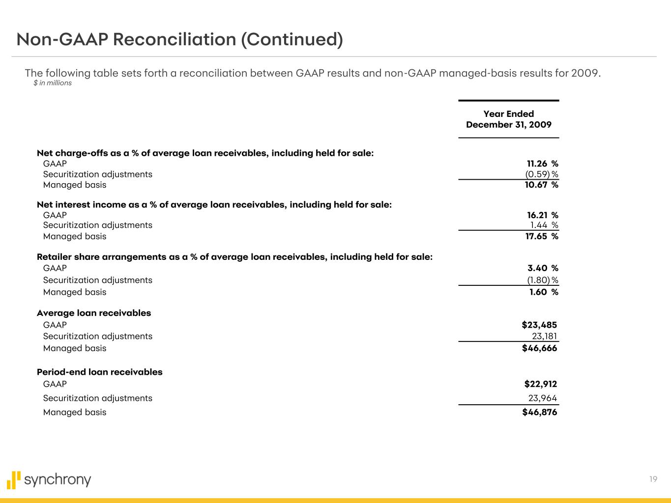 19 Non-GAAP Reconciliation (Continued) The following table sets forth a reconciliation between GAAP results and non-GAAP managed-basis results for 2009. Year Ended December 31, 2009 Net charge-offs as a % of average loan receivables, including held for sale: GAAP 11.26 % Securitization adjustments (0.59) % Managed basis 10.67 % Net interest income as a % of average loan receivables, including held for sale: GAAP 16.21 % Securitization adjustments 1.44 % Managed basis 17.65 % Retailer share arrangements as a % of average loan receivables, including held for sale: GAAP 3.40 % Securitization adjustments (1.80) % Managed basis 1.60 % Average loan receivables GAAP $23,485 Securitization adjustments 23,181 Managed basis $46,666 Period-end loan receivables GAAP $22,912 Securitization adjustments 23,964 Managed basis $46,876 $ in millions