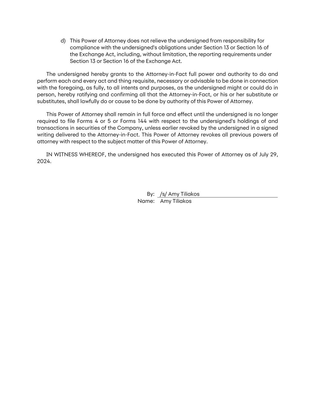 d) This Power of Attorney does not relieve the undersigned from responsibility for compliance with the undersigned's obligations under Section 13 or Section 16 of the Exchange Act, including, without limitation, the reporting requirements under Section 13 or Section 16 of the Exchange Act. The undersigned hereby grants to the Attorney-in-Fact full power and authority to do and perform each and every act and thing requisite, necessary or advisable to be done in connection with the foregoing, as fully, to all intents and purposes, as the undersigned might or could do in person, hereby ratifying and confirming all that the Attorney-in-Fact, or his or her substitute or substitutes, shall lawfully do or cause to be done by authority of this Power of Attorney. This Power of Attorney shall remain in full force and effect until the undersigned is no longer required to file Forms 4 or 5 or Forms 144 with respect to the undersigned's holdings of and transactions in securities of the Company, unless earlier revoked by the undersigned in a signed writing delivered to the Attorney-in-Fact. This Power of Attorney revokes all previous powers of attorney with respect to the subject matter of this Power of Attorney. IN WITNESS WHEREOF, the undersigned has executed this Power of Attorney as of July 29, 2024. By: /s/ Amy Tiliakos Name: Amy Tiliakos