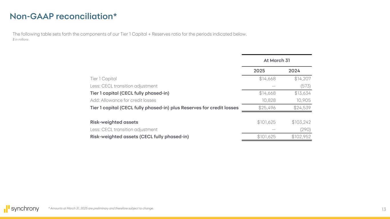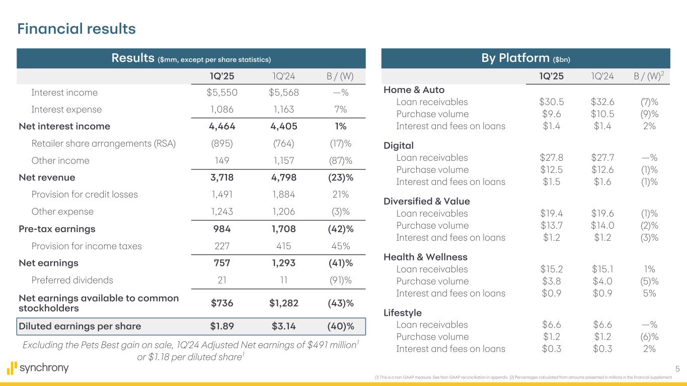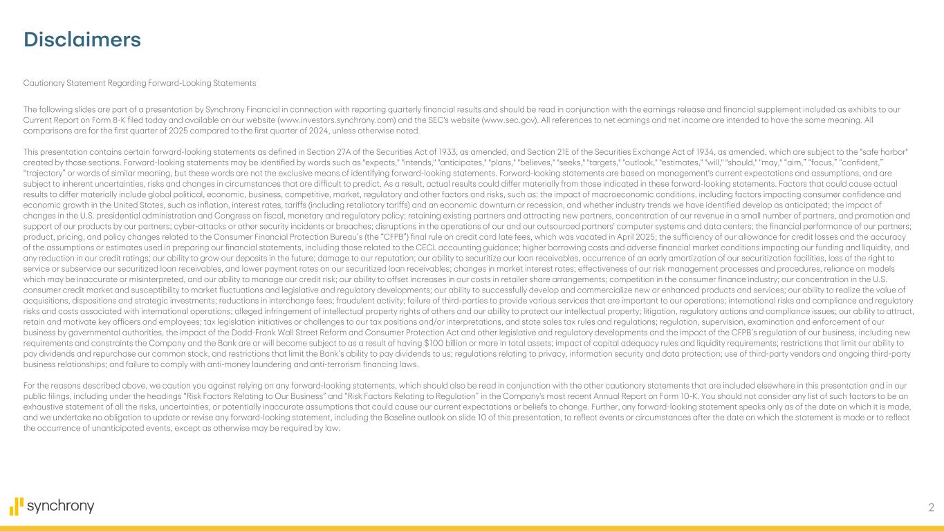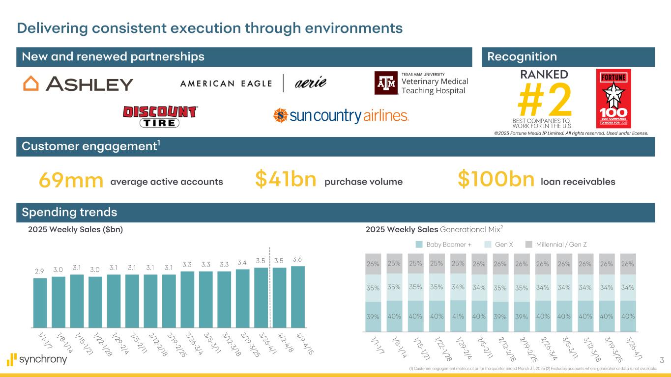 2 Cautionary Statement Regarding Forward-Looking Statements The following slides are part of a presentation by Synchrony Financial in connection with reporting quarterly financial results and should be read in conjunction with the earnings release and financial supplement included as exhibits to our Current Report on Form 8-K filed today and available on our website (www.investors.synchrony.com) and the SEC's website (www.sec.gov). All references to net earnings and net income are intended to have the same meaning. All comparisons are for the first quarter of 2025 compared to the first quarter of 2024, unless otherwise noted. This presentation contains certain forward-looking statements as defined in Section 27A of the Securities Act of 1933, as amended, and Section 21E of the Securities Exchange Act of 1934, as amended, which are subject to the "safe harbor" created by those sections. Forward-looking statements may be identified by words such as "expects," "intends," "anticipates," "plans," "believes," "seeks," "targets," "outlook," "estimates," "will," "should," "may," “aim,” “focus,” “confident,” “trajectory” or words of similar meaning, but these words are not the exclusive means of identifying forward-looking statements. Forward-looking statements are based on management's current expectations and assumptions, and are subject to inherent uncertainties, risks and changes in circumstances that are difficult to predict. As a result, actual results could differ materially from those indicated in these forward-looking statements. Factors that could cause actual results to differ materially include global political, economic, business, competitive, market, regulatory and other factors and risks, such as: the impact of macroeconomic conditions, including factors impacting consumer confidence and economic growth in the United States, such as inflation, interest rates, tariffs (including retaliatory tariffs) and an economic downturn or recession, and whether industry trends we have identified develop as anticipated; the impact of changes in the U.S. presidential administration and Congress on fiscal, monetary and regulatory policy; retaining existing partners and attracting new partners, concentration of our revenue in a small number of partners, and promotion and support of our products by our partners; cyber-attacks or other security incidents or breaches; disruptions in the operations of our and our outsourced partners' computer systems and data centers; the financial performance of our partners; product, pricing, and policy changes related to the Consumer Financial Protection Bureau’s (the “CFPB”) final rule on credit card late fees, which was vacated in April 2025; the sufficiency of our allowance for credit losses and the accuracy of the assumptions or estimates used in preparing our financial statements, including those related to the CECL accounting guidance; higher borrowing costs and adverse financial market conditions impacting our funding and liquidity, and any reduction in our credit ratings; our ability to grow our deposits in the future; damage to our reputation; our ability to securitize our loan receivables, occurrence of an early amortization of our securitization facilities, loss of the right to service or subservice our securitized loan receivables, and lower payment rates on our securitized loan receivables; changes in market interest rates; effectiveness of our risk management processes and procedures, reliance on models which may be inaccurate or misinterpreted, and our ability to manage our credit risk; our ability to offset increases in our costs in retailer share arrangements; competition in the consumer finance industry; our concentration in the U.S. consumer credit market and susceptibility to market fluctuations and legislative and regulatory developments; our ability to successfully develop and commercialize new or enhanced products and services; our ability to realize the value of acquisitions, dispositions and strategic investments; reductions in interchange fees; fraudulent activity; failure of third-parties to provide various services that are important to our operations; international risks and compliance and regulatory risks and costs associated with international operations; alleged infringement of intellectual property rights of others and our ability to protect our intellectual property; litigation, regulatory actions and compliance issues; our ability to attract, retain and motivate key officers and employees; tax legislation initiatives or challenges to our tax positions and/or interpretations, and state sales tax rules and regulations; regulation, supervision, examination and enforcement of our business by governmental authorities, the impact of the Dodd-Frank Wall Street Reform and Consumer Protection Act and other legislative and regulatory developments and the impact of the CFPB’s regulation of our business, including new requirements and constraints the Company and the Bank are or will become subject to as a result of having $100 billion or more in total assets; impact of capital adequacy rules and liquidity requirements; restrictions that limit our ability to pay dividends and repurchase our common stock, and restrictions that limit the Bank’s ability to pay dividends to us; regulations relating to privacy, information security and data protection; use of third-party vendors and ongoing third-party business relationships; and failure to comply with anti-money laundering and anti-terrorism financing laws. For the reasons described above, we caution you against relying on any forward-looking statements, which should also be read in conjunction with the other cautionary statements that are included elsewhere in this presentation and in our public filings, including under the headings “Risk Factors Relating to Our Business” and “Risk Factors Relating to Regulation” in the Company's most recent Annual Report on Form 
