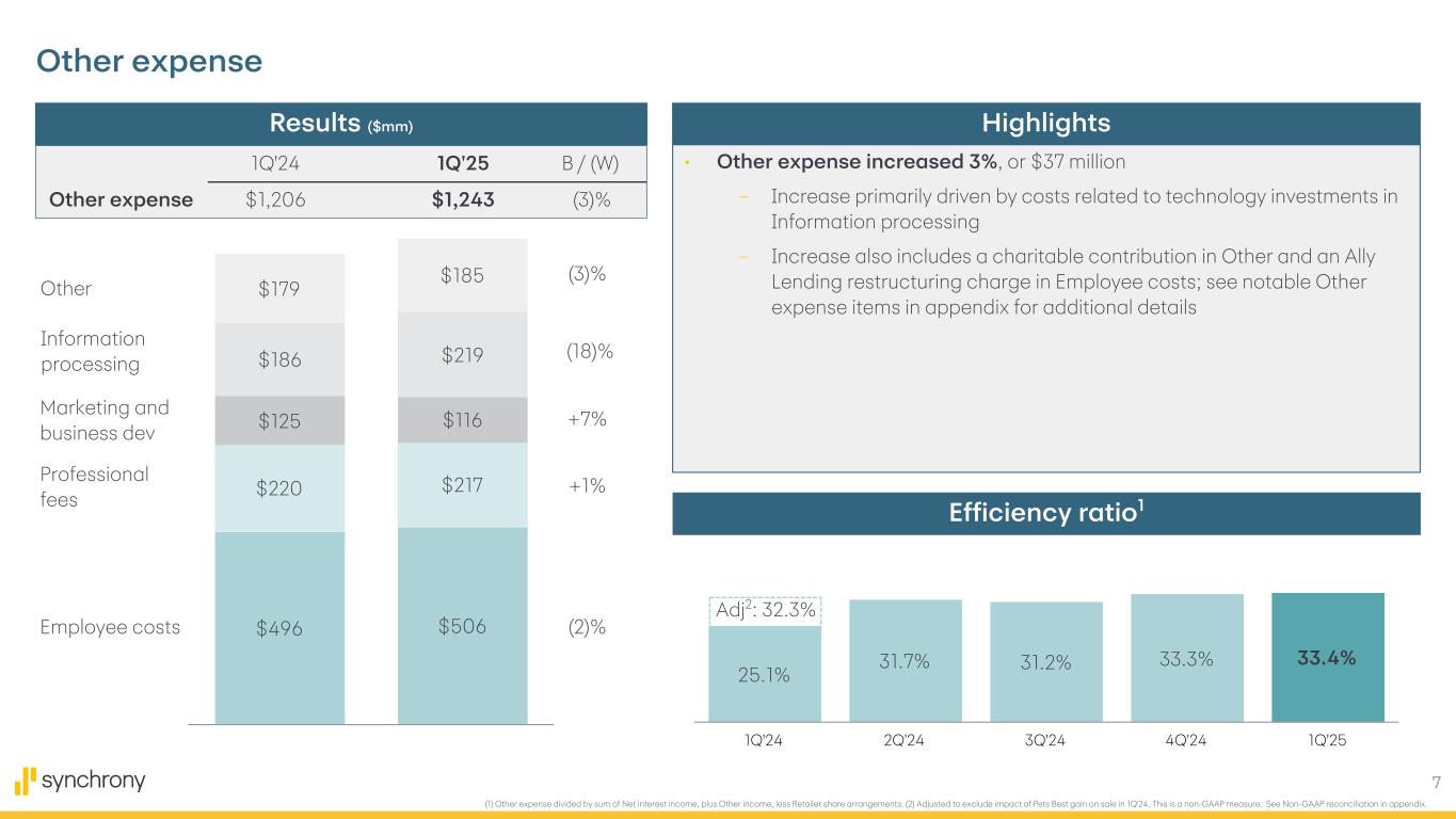 6 (1) Product, Pricing, and Policy Changes (or "PPPCs"). (2) Customer payments received during the period divided by beginning of period loan receivables. (3) Excludes Ally Lending. (4) Excludes portfolios sold in 2019 and 2022. • Net revenue decreased 23%, or $1.1 billion primarily reflecting Pets Best gain on sale in prior year – Net interest income increased 1%, or $59 million ▪ Loan receivables yield of 21.33%, up 24 bps primarily driven by the impact of our PPPCs1, partially offset by lower benchmark rates and lower late fee incidence ▪ Lower benchmark rates primarily drove reductions in Interest- bearing liabilities cost of 26 bps to 4.48% and liquidity portfolio yield of 88 bps to 4.43% – Retailer share arrangements increased 17%, reflecting program performance which includes the impact of our PPPCs – Other income decreased 87%, driven by a $1,069 million Pets Best gain on sale in 1Q'24 partially offset by the impact of PPPC related fees • Net interest margin of 14.74% increased 19bps – Reflects higher loan receivables yield and lower liabilities cost, partially offset by liquidity portfolio yield and mix of Interest-earning assets – Loan receivables mix as a percent of Interest-earning assets of 82.27% decreased 62bps • Payment rate2 of 15.8% flat to 1Q'243 and up approximately 60bps vs. pre- pandemic 5-year historical average ('15-'19)4 Net revenue Results ($mm) Highlights Other income Net interest income RSA (87)% +1% (17)% 1Q'24 Net interest margin 14.55% Loan receivables yield +0.20 % Interest-bearing liabilities cost +0.25 % Liquidity portfolio yield (0.15) % Mix of Interest-earning assets (0.11) % 1Q'25 Net interest margin 14.74% Net interest margin 1Q'24 1Q'25 B / (W) Net revenue $4,798 $3,718 (23)% $4,405 $4,464 $(764) $(895) $1,157 $149