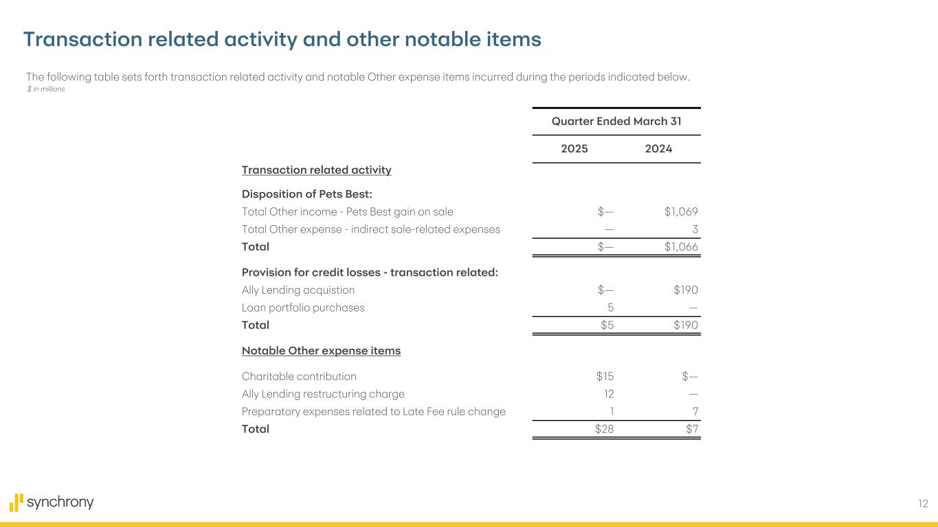 12 Transaction related activity and other notable items The following table sets forth transaction related activity and notable Other expense items incurred during the periods indicated below. $ in millions Quarter Ended March 31 2025 2024 Transaction related activity Disposition of Pets Best: Total Other income - Pets Best gain on sale $— $1,069 Total Other expense - indirect sale-related expenses — 3 Total $— $1,066 Provision for credit losses - transaction related: Ally Lending acquistion $— $190 Loan portfolio purchases 5 — Total $5 $190 Notable Other expense items Charitable contribution $15 $— Ally Lending restructuring charge 12 — Preparatory expenses related to Late Fee rule change 1 7 Total $28 $7