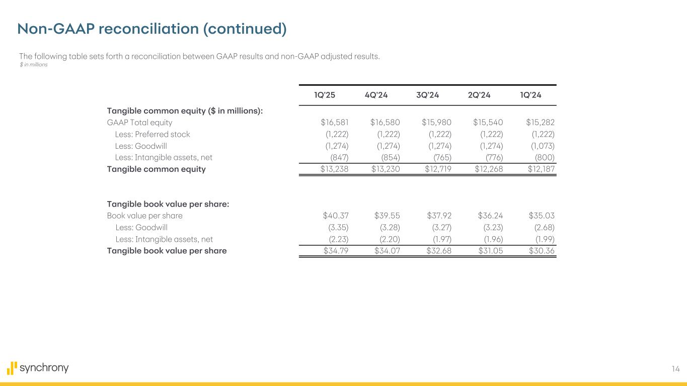 13 Non-GAAP reconciliation* The following table sets forth the components of our Tier 1 Capital + Reserves ratio for the periods indicated below. At March 31 2025 2024 Tier 1 Capital $14,668 $14,207 Less: CECL transition adjustment — (573) Tier 1 capital (CECL fully phased-in) $14,668 $13,634 Add: Allowance for credit losses 10,828 10,905 Tier 1 capital (CECL fully phased-in) plus Reserves for credit losses $25,496 $24,539 Risk-weighted assets $101,625 $103,242 Less: CECL transition adjustment — (290) Risk-weighted assets (CECL fully phased-in) $101,625 $102,952 $ in millions * Amounts at March 31, 2025 are preliminary and therefore subject to change.