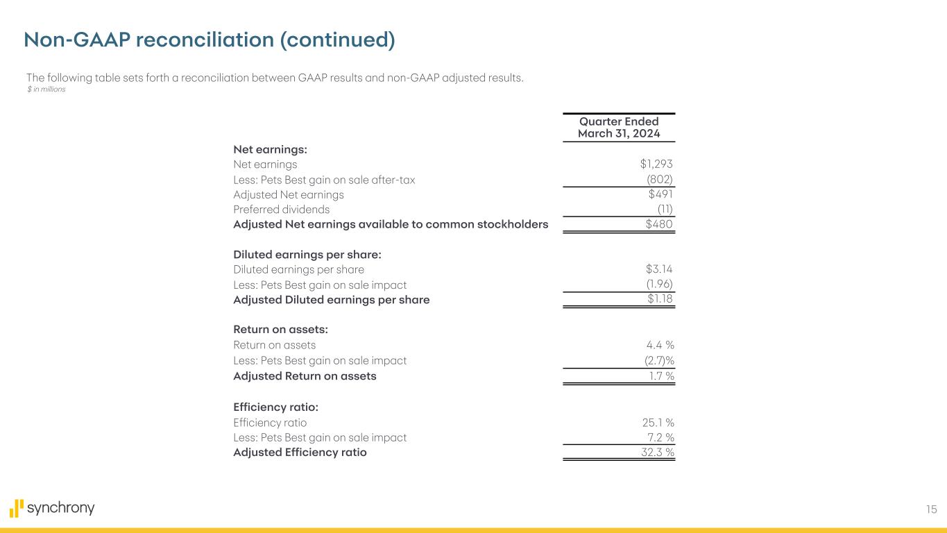15 Non-GAAP reconciliation (continued) The following table sets forth a reconciliation between GAAP results and non-GAAP adjusted results. $ in millions Quarter Ended March 31, 2024 Net earnings: Net earnings $1,293 Less: Pets Best gain on sale after-tax (802) Adjusted Net earnings $491 Preferred dividends (11) Adjusted Net earnings available to common stockholders $480 Diluted earnings per share: Diluted earnings per share $3.14 Less: Pets Best gain on sale impact (1.96) Adjusted Diluted earnings per share $1.18 Return on assets: Return on assets 4.4 % Less: Pets Best gain on sale impact (2.7) % Adjusted Return on assets 1.7 % Efficiency ratio: Efficiency ratio 25.1 % Less: Pets Best gain on sale impact 7.2 % Adjusted Efficiency ratio 32.3 %