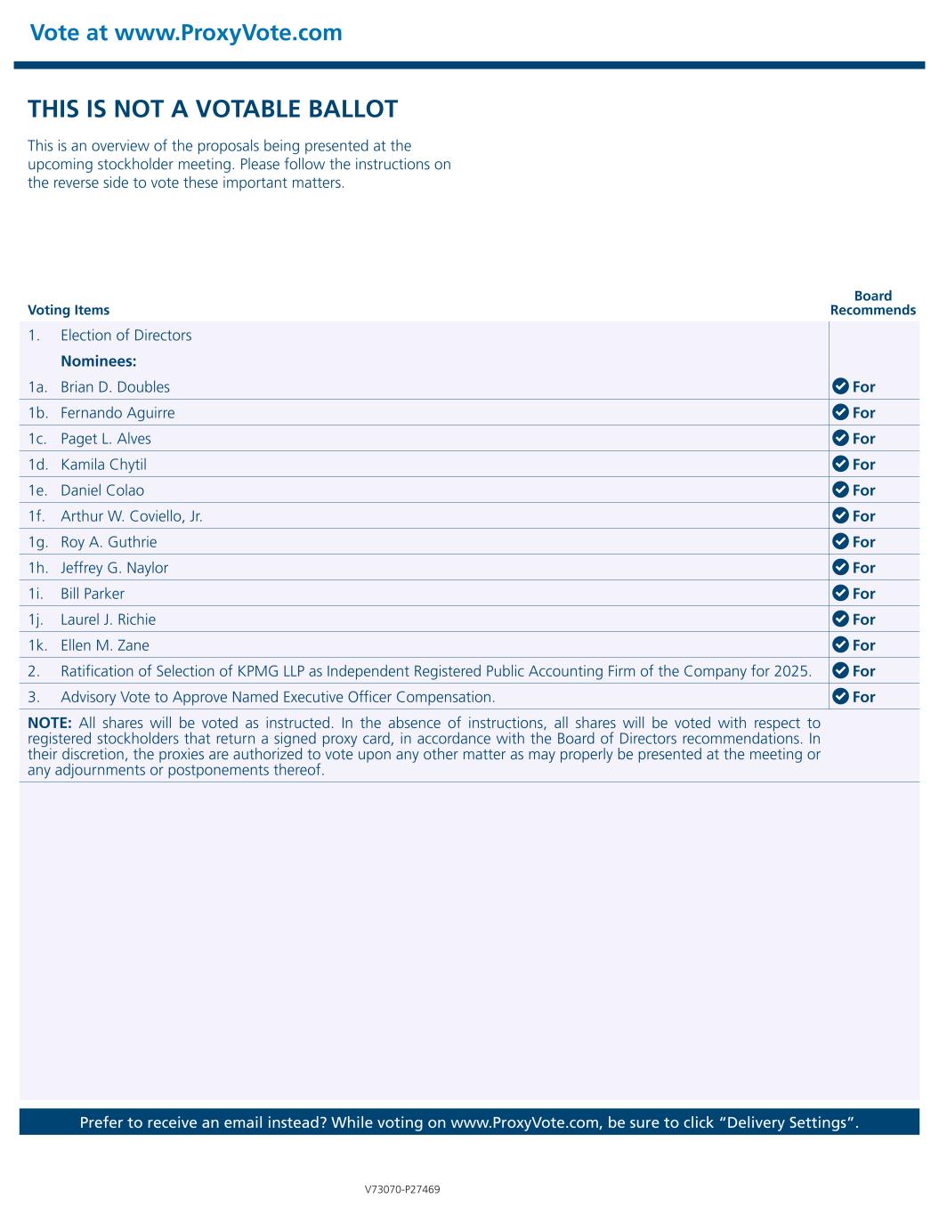 Vote at www.ProxyVote.com Prefer to receive an email instead? While voting on www.ProxyVote.com, be sure to click “Delivery Settings”. Voting Items Board Recommends V73070-P27469 THIS IS NOT A VOTABLE BALLOT This is an overview of the proposals being presented at the upcoming stockholder meeting. Please follow the instructions on the reverse side to vote these important matters. 1. Election of Directors Nominees: 1a. Brian D. Doubles For 1b. Fernando Aguirre For 1c. Paget L. Alves For 1d. Kamila Chytil For 1e. Daniel Colao For 1f. Arthur W. Coviello, Jr. For 1g. Roy A. Guthrie For 1h. Jeffrey G. Naylor For 1i. Bill Parker For 1j. Laurel J. Richie For 1k. Ellen M. Zane For 2. Ratification of Selection of KPMG LLP as Independent Registered Public Accounting Firm of the Company for 2025. For 3. Advisory Vote to Approve Named Executive Officer Compensation. For NOTE: All shares will be voted as instructed. In the absence of instructions, all shares will be voted with respect to registered stockholders that return a signed proxy card, in accordance with the Board of Directors recommendations. In their discretion, the proxies are authorized to vote upon any other matter as may properly be presented at the meeting or any adjournments or postponements thereof.