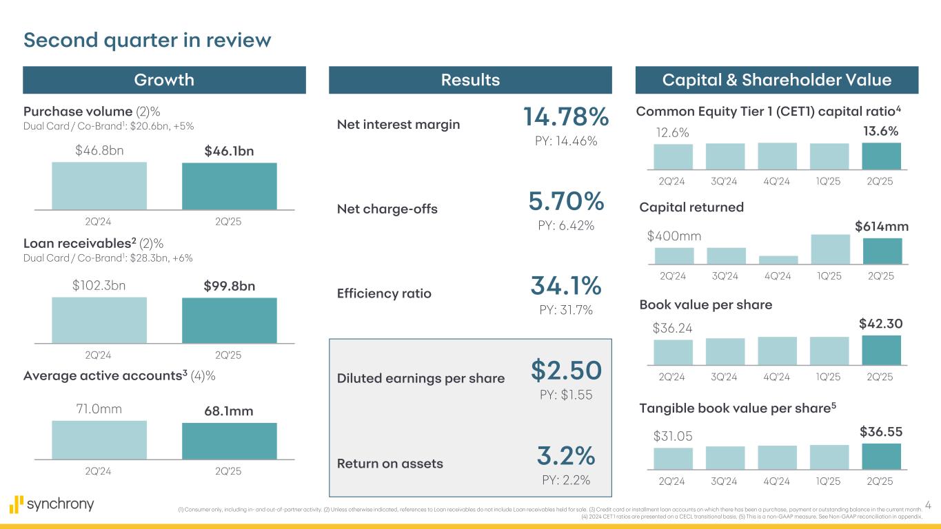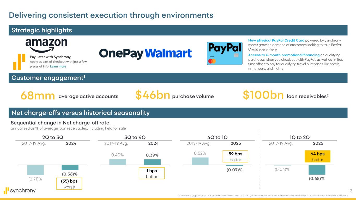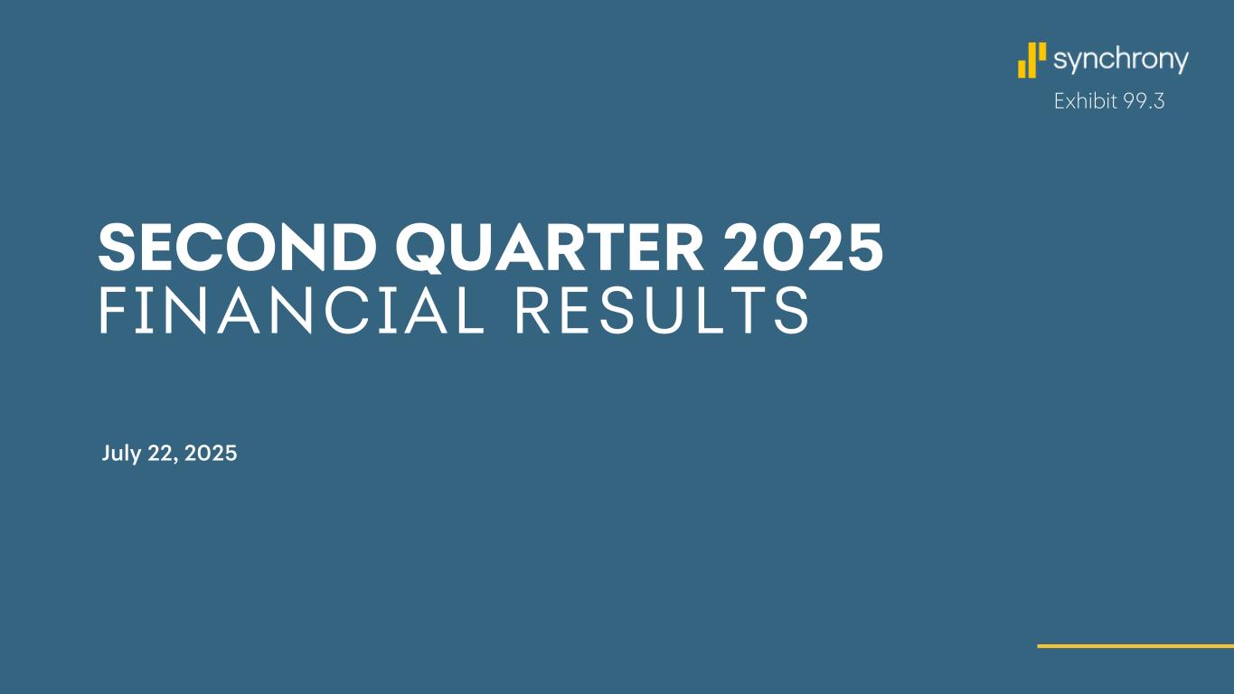 2 Cautionary Statement Regarding Forward-Looking Statements The following slides are part of a presentation by Synchrony Financial in connection with reporting quarterly financial results and should be read in conjunction with the earnings release and financial supplement included as exhibits to our Current Report on Form 8-K filed today and available on our website (www.investors.synchrony.com) and the SEC's website (www.sec.gov). All references to net earnings and net income are intended to have the same meaning. All comparisons are for the second quarter of 2025 compared to the second quarter of 2024, unless otherwise noted. This presentation contains certain forward-looking statements as defined in Section 27A of the Securities Act of 1933, as amended, and Section 21E of the Securities Exchange Act of 1934, as amended, which are subject to the "safe harbor" created by those sections. Forward-looking statements may be identified by words such as "expects," "intends," "anticipates," "plans," "believes," "seeks," "targets," "outlook," "estimates," "will," "should," "may," “aim,” “focus,” “confident,” “trajectory”, "priorities", "designed" or words of similar meaning, but these words are not the exclusive means of identifying forward-looking statements. Forward-looking statements are based on management's current expectations and assumptions, and are subject to inherent uncertainties, risks and changes in circumstances that are difficult to predict. As a result, actual results could differ materially from those indicated in these forward-looking statements. Factors that could cause actual results to differ materially include global political, economic, business, competitive, market, regulatory and other factors and risks, such as: the impact of macroeconomic conditions, including factors impacting consumer confidence and economic growth in the United States, such as inflation, interest rates, tariffs (including retaliatory tariffs) and an economic downturn or recession, and whether industry trends we have identified develop as anticipated; the impact of changes in the U.S. presidential administration and Congress on fiscal, monetary and regulatory policy; retaining existing partners and attracting new partners, concentration of our revenue in a small number of partners, and promotion and support of our products by our partners; cyber-attacks or other security incidents or breaches; disruptions in the operations of our and our outsourced partners' computer systems and data centers; the financial performance of our partners; product, pricing, and policy changes related to the Consumer Financial Protection Bureau’s (the “CFPB”) final rule on credit card late fees, which was vacated in April 2025; the sufficiency of our allowance for credit losses and the accuracy of the assumptions or estimates used in preparing our financial statements, including those related to the CECL accounting guidance; higher borrowing costs and adverse financial market conditions impacting our funding and liquidity, and any reduction in our credit ratings; our ability to grow our deposits in the future; damage to our reputation; our ability to securitize our loan receivables, occurrence of an early amortization of our securitization facilities, loss of the right to service or subservice our securitized loan receivables, and lower payment rates on our securitized loan receivables; changes in market interest rates; effectiveness of our risk management processes and procedures, reliance on models which may be inaccurate or misinterpreted, and our ability to manage our credit risk; our ability to offset increases in our costs in retailer share arrangements; competition in the consumer finance industry; our concentration in the U.S. consumer credit market and susceptibility to market fluctuations and legislative and regulatory developments; our ability to successfully develop and commercialize new or enhanced products and services; our ability to realize the value of acquisitions, dispositions and strategic investments; reductions in interchange fees; fraudulent activity; failure of third-parties to provide various services that are important to our operations; international risks and compliance and regulatory risks and costs associated with international operations; alleged infringement of intellectual property rights of others and our ability to protect our intellectual property; litigation, regulatory actions and compliance issues; our ability to attract, retain and motivate key officers and employees; tax legislation initiatives or challenges to our tax positions and/or interpretations, and state sales tax rules and regulations; regulation, supervision, examination and enforcement of our business by governmental authorities, the impact of the Dodd-Frank Wall Street Reform and Consumer Protection Act and other legislative and regulatory developments and the impact of the CFPB’s regulation of our business, including new requirements and constraints the Company and the Bank are or will become subject to as a result of having $100 billion or more in total assets; impact of capital adequacy rules and liquidity requirements; restrictions that limit our ability to pay dividends and repurchase our common stock, and restrictions that limit the Bank’s ability to pay dividends to us; regulations relating to privacy, information security and data protection; use of third-party vendors and ongoing third-party business relationships; and failure to comply with anti-money laundering and anti-terrorism financing laws. For the reasons described above, we caution you against relying on any forward-looking statements, which should also be read in conjunction with the other cautionary statements that are included elsewhere in this presentation and in our public filings, including under the headings “Risk Factors Relating to Our Business” and “Risk Factors Relating to Regulation” in the Company's most r