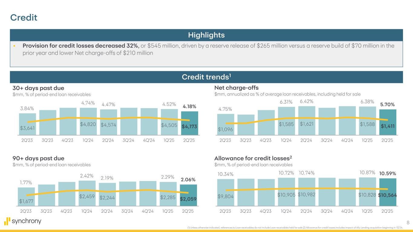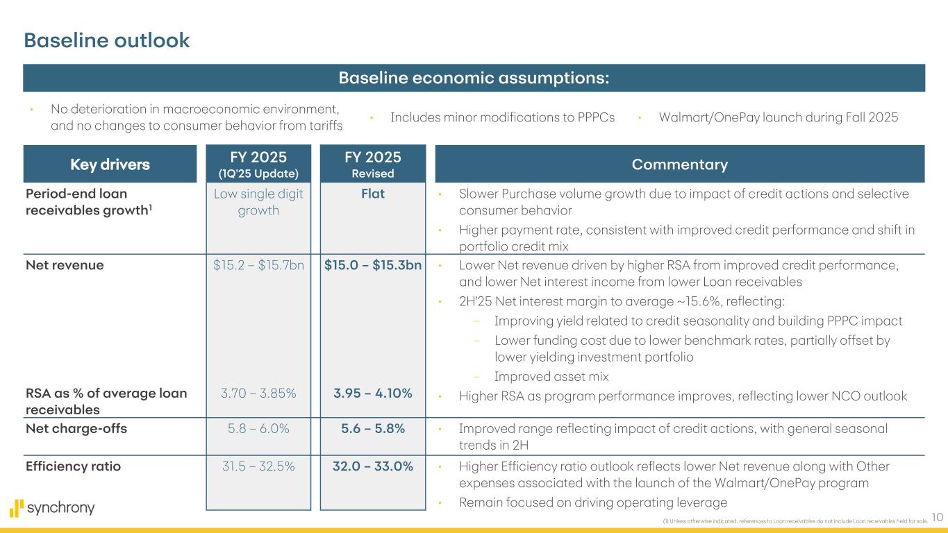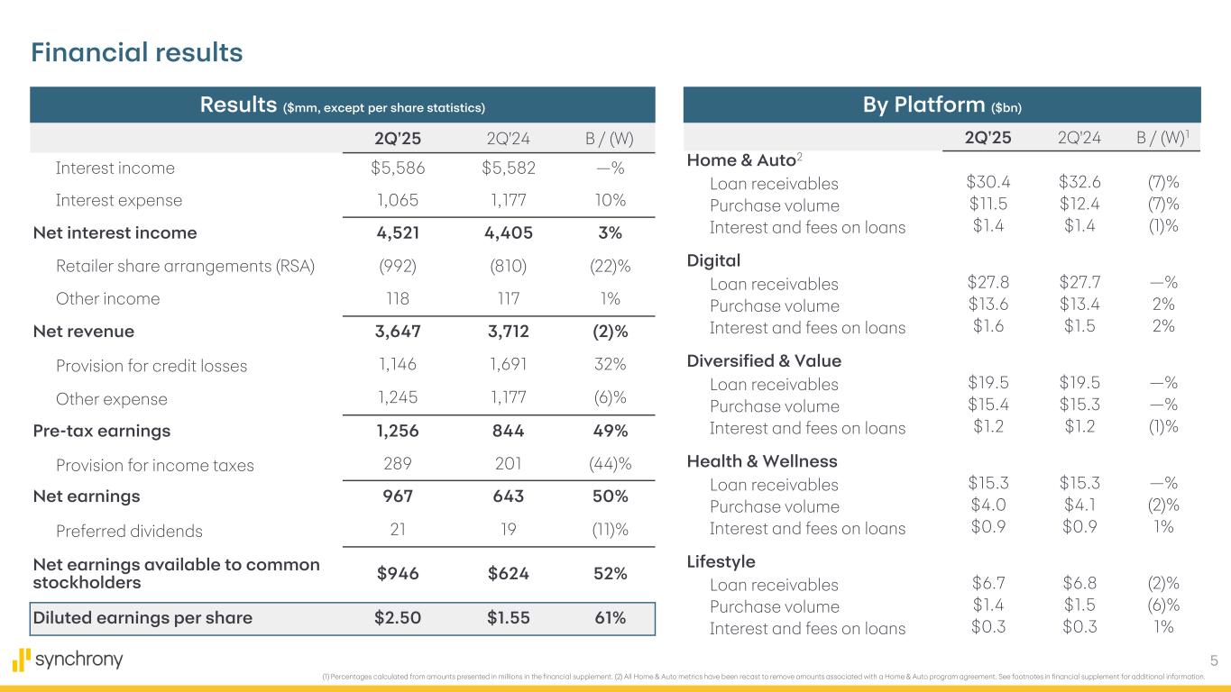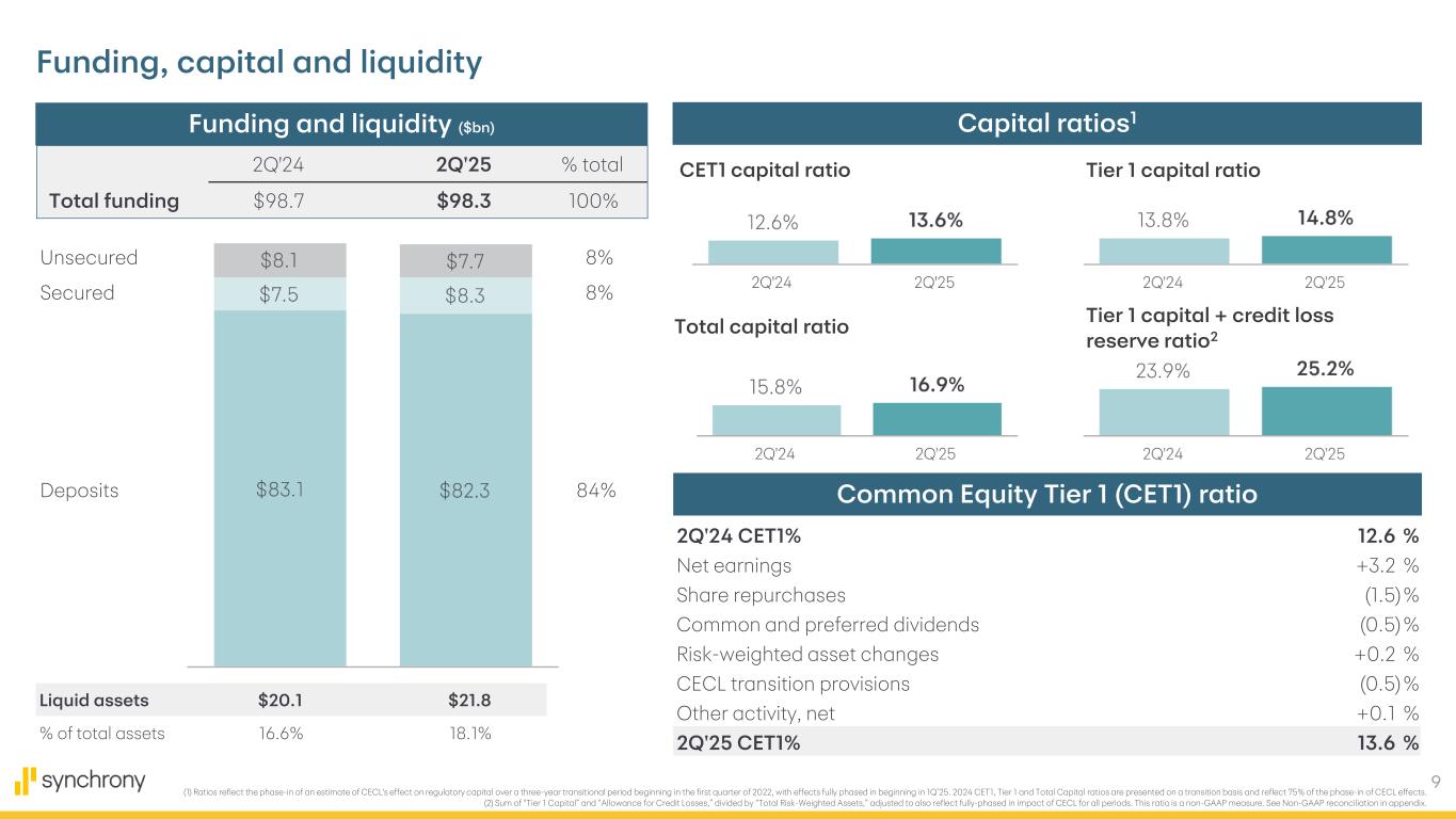 2 Cautionary Statement Regarding Forward-Looking Statements The following slides are part of a presentation by Synchrony Financial in connection with reporting quarterly financial results and should be read in conjunction with the earnings release and financial supplement included as exhibits to our Current Report on Form 8-K filed today and available on our website (www.investors.synchrony.com) and the SEC's website (www.sec.gov). All references to net earnings and net income are intended to have the same meaning. All comparisons are for the second quarter of 2025 compared to the second quarter of 2024, unless otherwise noted. This presentation contains certain forward-looking statements as defined in Section 27A of the Securities Act of 1933, as amended, and Section 21E of the Securities Exchange Act of 1934, as amended, which are subject to the "safe harbor" created by those sections. Forward-looking statements may be identified by words such as "expects," "intends," "anticipates," "plans," "believes," "seeks," "targets," "outlook," "estimates," "will," "should," "may," “aim,” “focus,” “confident,” “trajectory”, "priorities", "designed" or words of similar meaning, but these words are not the exclusive means of identifying forward-looking statements. Forward-looking statements are based on management's current expectations and assumptions, and are subject to inherent uncertainties, risks and changes in circumstances that are difficult to predict. As a result, actual results could differ materially from those indicated in these forward-looking statements. Factors that could cause actual results to differ materially include global political, economic, business, competitive, market, regulatory and other factors and risks, such as: the impact of macroeconomic conditions, including factors impacting consumer confidence and economic growth in the United States, such as inflation, interest rates, tariffs (including retaliatory tariffs) and an economic downturn or recession, and whether industry trends we have identified develop as anticipated; the impact of changes in the U.S. presidential administration and Congress on fiscal, monetary and regulatory policy; retaining existing partners and attracting new partners, concentration of our revenue in a small number of partners, and promotion and support of our products by our partners; cyber-attacks or other security incidents or breaches; disruptions in the operations of our and our outsourced partners' computer systems and data centers; the financial performance of our partners; product, pricing, and policy changes related to the Consumer Financial Protection Bureau’s (the “CFPB”) final rule on credit card late fees, which was vacated in April 2025; the sufficiency of our allowance for credit losses and the accuracy of the assumptions or estimates used in preparing our financial statements, including those related to the CECL accounting guidance; higher borrowing costs and adverse financial market conditions impacting our funding and liquidity, and any reduction in our credit ratings; our ability to grow our deposits in the future; damage to our reputation; our ability to securitize our loan receivables, occurrence of an early amortization of our securitization facilities, loss of the right to service or subservice our securitized loan receivables, and lower payment rates on our securitized loan receivables; changes in market interest rates; effectiveness of our risk management processes and procedures, reliance on models which may be inaccurate or misinterpreted, and our ability to manage our credit risk; our ability to offset increases in our costs in retailer share arrangements; competition in the consumer finance industry; our concentration in the U.S. consumer credit market and susceptibility to market fluctuations and legislative and regulatory developments; our ability to successfully develop and commercialize new or enhanced products and services; our ability to realize the value of acquisitions, dispositions and strategic investments; reductions in interchange fees; fraudulent activity; failure of third-parties to provide various services that are important to our operations; international risks and compliance and regulatory risks and costs associated with international operations; alleged infringement of intellectual property rights of others and our ability to protect our intellectual property; litigation, regulatory actions and compliance issues; our ability to attract, retain and motivate key officers and employees; tax legislation initiatives or challenges to our tax positions and/or interpretations, and state sales tax rules and regulations; regulation, supervision, examination and enforcement of our business by governmental authorities, the impact of the Dodd-Frank Wall Street Reform and Consumer Protection Act and other legislative and regulatory developments and the impact of the CFPB’s regulation of our business, including new requirements and constraints the Company and the Bank are or will become subject to as a result of having $100 billion or more in total assets; impact of capital adequacy rules and liquidity requirements; restrictions that limit our ability to pay dividends and repurchase our common stock, and restrictions that limit the Bank’s ability to pay dividends to us; regulations relating to privacy, information security and data protection; use of third-party vendors and ongoing third-party business relationships; and failure to comply with anti-money laundering and anti-terrorism financing laws. For the reasons described above, we caution you against relying on any forward-looking statements, which should also be read in conjunction with the other cautionary statements that are included elsewhere in this presentation and in our public filings, including under the headings “Risk Factors Relating to Our Business” and “Risk Factors Relating to Regulation” in the Company's most r