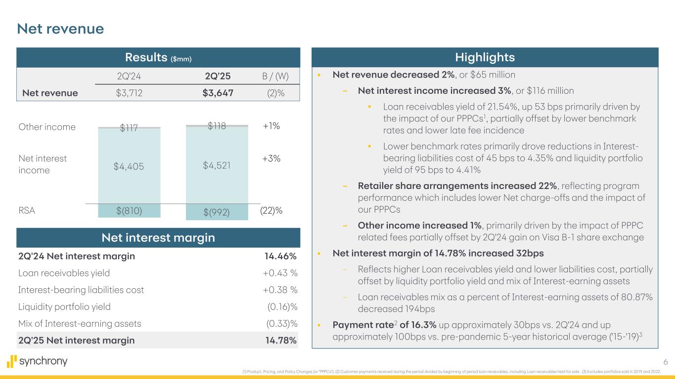 5 (1) Percentages calculated from amounts presented in millions in the financial supplement. (2) All Home & Auto metrics have been recast to remove amounts associated with a Home & Auto program agreement. See footnotes in financial supplement for additional information. Financial results Results ($mm, except per share statistics) By Platform ($bn) 2Q'25 2Q'24 B / (W) Interest income $5,586 $5,582 —% Interest expense 1,065 1,177 10% Net interest income 4,521 4,405 3% Retailer share arrangements (RSA) (992) (810) (22)% Other income 118 117 1% Net revenue 3,647 3,712 (2)% Provision for credit losses 1,146 1,691 32% Other expense 1,245 1,177 (6)% Pre-tax earnings 1,256 844 49% Provision for income taxes 289 201 (44)% Net earnings 967 643 50% Preferred dividends 21 19 (11)% Net earnings available to common stockholders $946 $624 52% Diluted earnings per share $2.50 $1.55 61% 2Q'25 2Q'24 B / (W)1 Home & Auto2 Loan receivables $30.4 $32.6 (7)% Purchase volume $11.5 $12.4 (7)% Interest and fees on loans $1.4 $1.4 (1)% Digital Loan receivables $27.8 $27.7 —% Purchase volume $13.6 $13.4 2% Interest and fees on loans $1.6 $1.5 2% Diversified & Value Loan receivables $19.5 $19.5 —% Purchase volume $15.4 $15.3 —% Interest and fees on loans $1.2 $1.2 (1)% Health & Wellness Loan receivables $15.3 $15.3 —% Purchase volume $4.0 $4.1 (2)% Interest and fees on loans $0.9 $0.9 1% Lifestyle Loan receivables $6.7 $6.8 (2)% Purchase volume $1.4 $1.5 (6)% Interest and fees on loans $0.3 $0.3 1%
