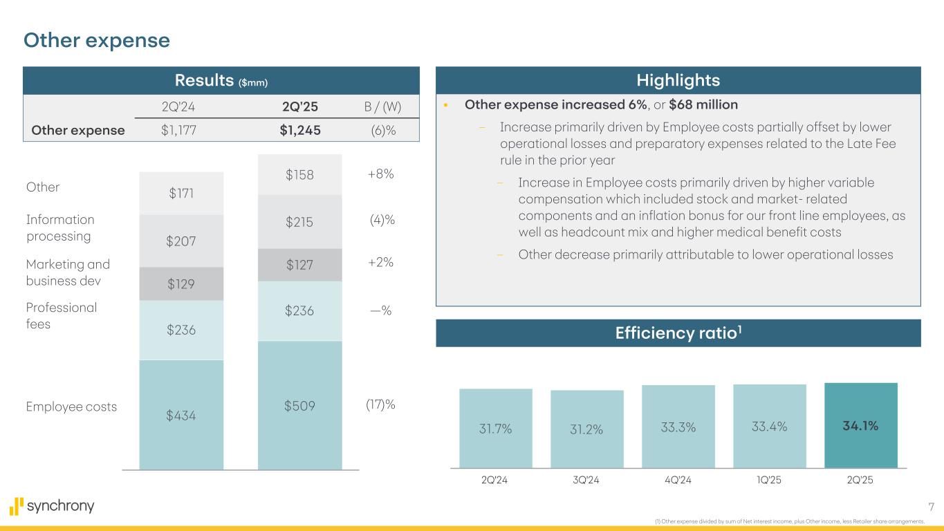 6 (1) Product, Pricing, and Policy Changes (or "PPPCs"). (2) Customer payments received during the period divided by beginning of period loan receivables, including Loan receivables held for sale. (3) Excludes portfolios sold in 2019 and 2022. • Net revenue decreased 2%, or $65 million – Net interest income increased 3%, or $116 million ▪ Loan receivables yield of 21.54%, up 53 bps primarily driven by the impact of our PPPCs1, partially offset by lower benchmark rates and lower late fee incidence ▪ Lower benchmark rates primarily drove reductions in Interest- bearing liabilities cost of 45 bps to 4.35% and liquidity portfolio yield of 95 bps to 4.41% – Retailer share arrangements increased 22%, reflecting program performance which includes lower Net charge-offs and the impact of our PPPCs – Other income increased 1%, primarily driven by the impact of PPPC related fees partially offset by 2Q'24 gain on Visa B-1 share exchange • Net interest margin of 14.78% increased 32bps – Reflects higher Loan receivables yield and lower liabilities cost, partially offset by liquidity portfolio yield and mix of Interest-earning assets – Loan receivables mix as a percent of Interest-earning assets of 80.87% decreased 194bps • Payment rate2 of 16.3% up approximately 30bps vs. 2Q'24 and up approximately 100bps vs. pre-pandemic 5-year historical average ('15-'19)3 Net revenue Results ($mm) Highlights Other income Net interest income RSA +1% +3% (22)% 2Q'24 Net interest margin 14.46% Loan receivables yield +0.43 % Interest-bearing liabilities cost +0.38 % Liquidity portfolio yield (0.16)% Mix of Interest-earning assets (0.33)% 2Q'25 Net interest margin 14.78% Net interest margin 2Q'24 2Q'25 B / (W) Net revenue $3,712 $3,647 (2)%