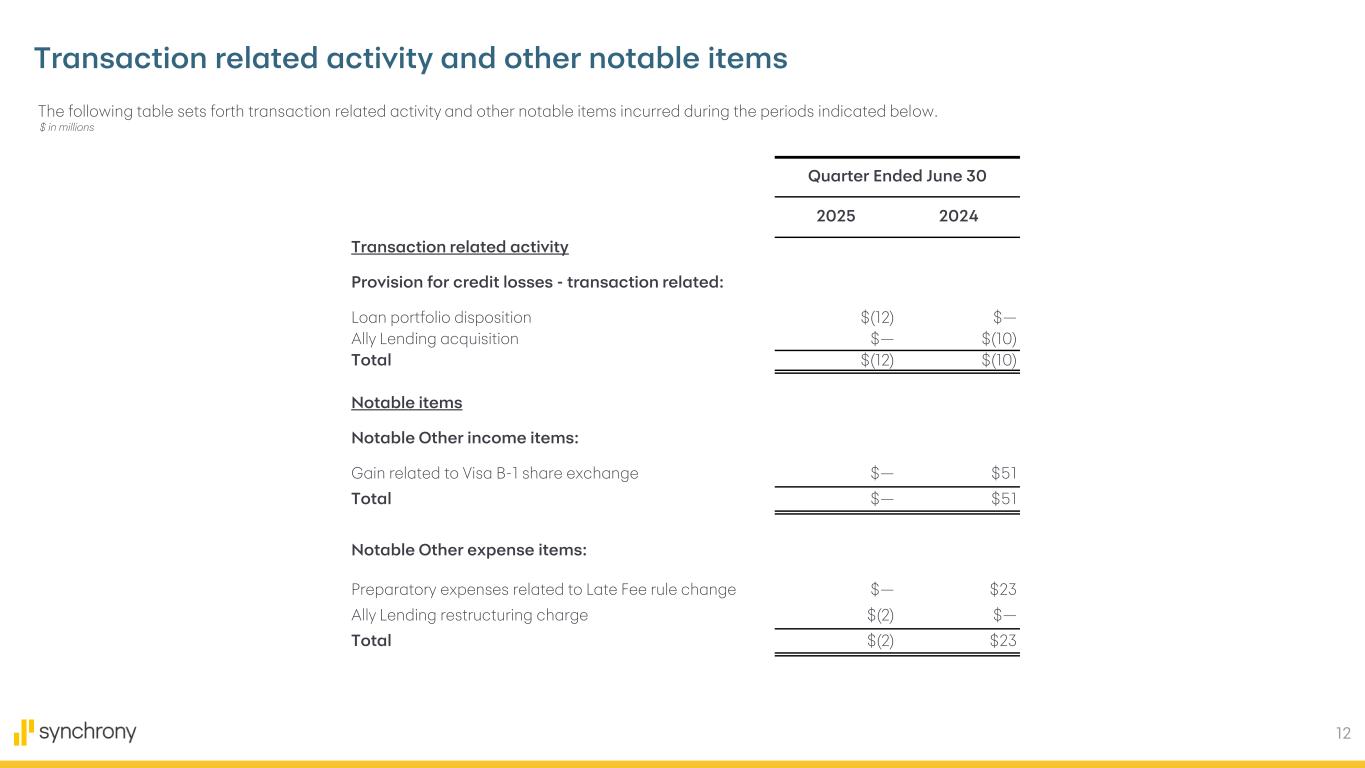 12 The following table sets forth transaction related activity and other notable items incurred during the periods indicated below. Transaction related activity and other notable items $ in millions Quarter Ended June 30 2025 2024 Transaction related activity Provision for credit losses - transaction related: Loan portfolio disposition $(12) $— Ally Lending acquisition $— $(10) Total $(12) $(10) Notable items Notable Other income items: Gain related to Visa B-1 share exchange $— $51 Total $— $51 Notable Other expense items: Preparatory expenses related to Late Fee rule change $— $23 Ally Lending restructuring charge $(2) $— Total $(2) $23