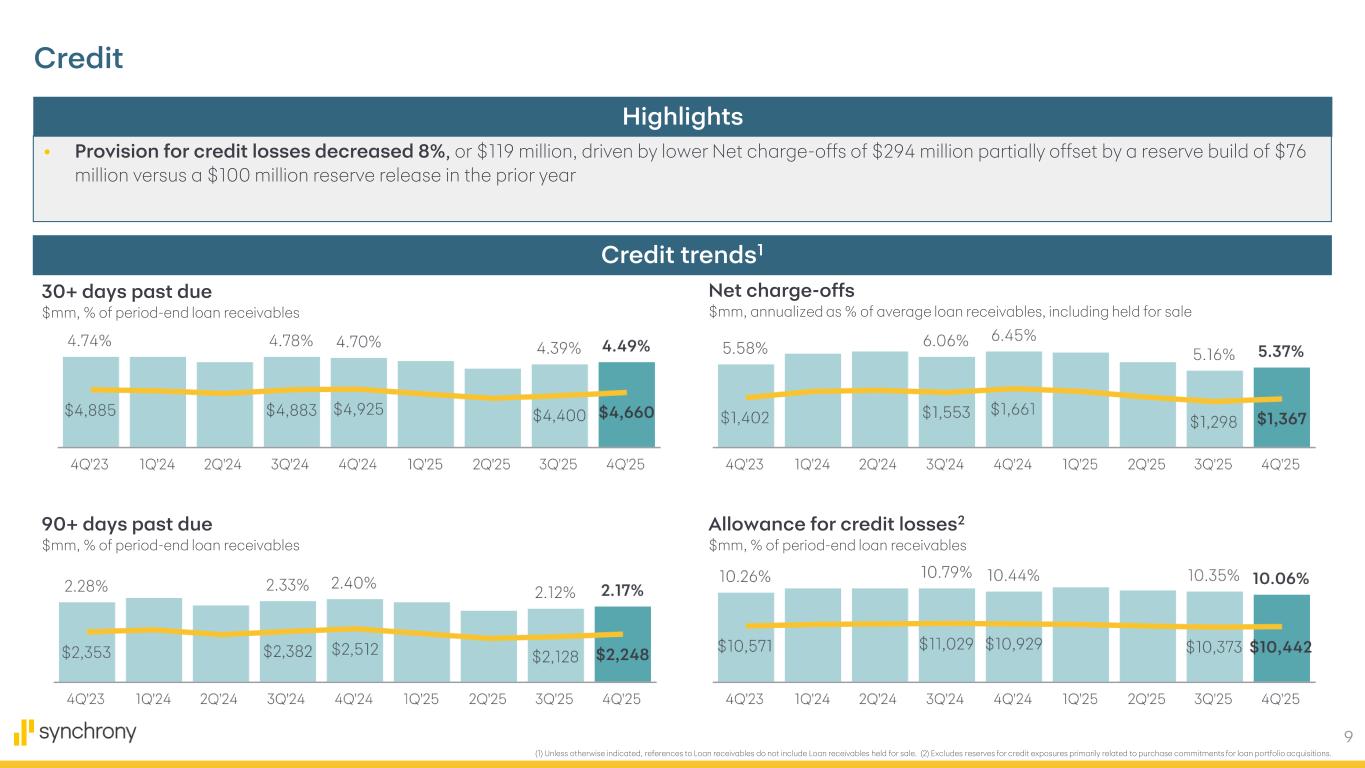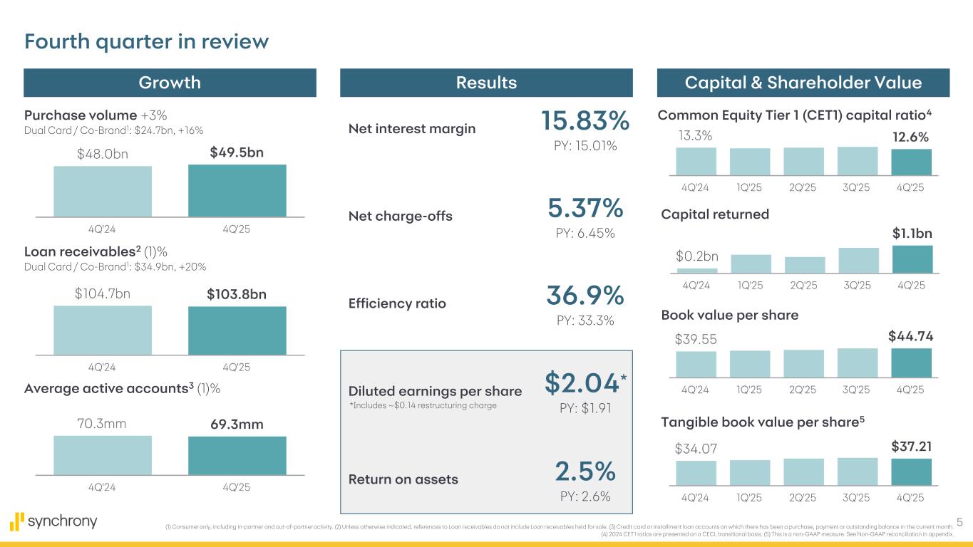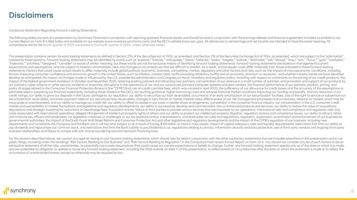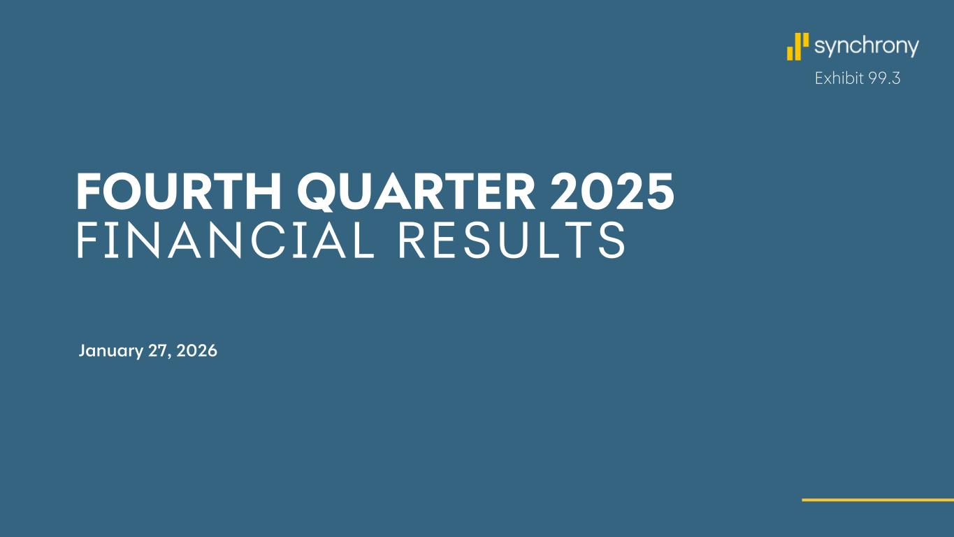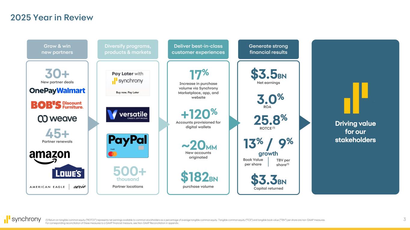 2 Disclaimers Cautionary Statement Regarding Forward-Looking Statements The following slides are part of a presentation by Synchrony Financial in connection with reporting quarterly financial results and should be read in conjunction with the earnings release and financial supplement included as exhibits to our Current Report on Form 8-K filed today and available on our website (www.investors.synchrony.com) and the SEC's website (www.sec.gov). All references to net earnings and net income are intended to have the same meaning. All comparisons are for the fourth quarter of 2025 compared to the fourth quarter of 2024, unless otherwise noted. This presentation contains certain forward-looking statements as defined in Section 27A of the Securities Act of 1933, as amended, and Section 21E of the Securities Exchange Act of 1934, as amended, which are subject to the "safe harbor" created by those sections. Forward-looking statements may be identified by words such as "expects," "intends," "anticipates," "plans," "believes," "seeks," "targets," "outlook," "estimates," "will," "should," "may," “aim,” “focus,” “goal,” “confident,” “trajectory,” "priorities," "designed," "consider" or words of similar meaning, but these words are not the exclusive means of identifying forward-looking statements. Forward-looking statements are based on management's current expectations and assumptions, and are subject to inherent uncertainties, risks and changes in circumstances that are difficult to predict. As a result, actual results could differ materially from those indicated in these forward-looking statements. Factors that could cause actual results to differ materially include global political, economic, business, competitive, market, regulatory and other factors and risks, such as: the impact of macroeconomic conditions, including factors impacting consumer confidence and economic growth in the United States, such as inflation, interest rates, tariffs (including retaliatory tariffs) and an economic downturn or recession, and whether industry trends we have identified develop as anticipated; the impact of changes made or influenced by the U.S. presidential administration and Congress on fiscal, monetary and regulatory policy, including with respect to constraints on the pricing of our credit products; the impact of the federal government shutdown in October and November 2025; retaining existing partners and attracting new partners, concentration of our revenue in a small number of partners, and promotion and support of our products by our partners; cyber-attacks or other security incidents or breaches; disruptions in the operations of our and our outsourced partners' computer systems and data centers; the financial performance of our partners; product, pricing, and policy changes related to the Consumer Financial Protection Bureau’s (the “CFPB”) final rule on credit card late fees, which was vacated in April 2025; the sufficiency of our allowance for credit losses and the accuracy of the assumptions or estimates used in preparing our financial statements, including those related to the CECL accounting guidance; higher borrowing costs and adverse financial market conditions impacting our funding and liquidity, and any reduction in our credit ratings; our ability to grow our deposits in the future; damage to our reputation; our ability to securitize our loan receivables, occurrence of an early amortization of our securitization facilities, loss of the right to service or subservice our securitized loan receivables, and lower payment rates on our securitized loan receivables; changes in benchmark or market interest rates; effectiveness of our risk management processes and procedures, reliance on models which may be inaccurate or misinterpreted, and our ability to manage our credit risk; our ability to offset increases in our costs in retailer share arrangements; competition in the consumer finance industry; our concentration in the U.S. consumer credit market and susceptibility to market fluctuations and legislative and regulatory developments; our ability to successfully develop and commercialize new or enhanced products and services; our ability to realize the value of acquisitions, dispositions and strategic investments; reductions in interchange fees; fraudulent activity; failure of third-parties to provide various services that are important to our operations; international risks and compliance and regulatory risks and costs associated with international operations; alleged infringement of intellectual property rights of others and our ability to protect our intellectual property; litigation, regulatory actions and compliance issues; our ability to attract, retain and motivate key officers and employees; tax legislation initiatives or challenges to our tax positions and/or interpretations, and state sales tax rules and regulations; regulation, supervision, examination and enforcement of our business by governmental authorities, the impact of the Dodd-Frank Wall Street Reform and Consumer Protection Act and other legislative and regulatory developments and the impact of the CFPB’s regulation of our business, including new requirements and constraints the Company and the Bank are or will become subject to as a result of having $100 billion or more in total assets; impact of capital adequacy rules and liquidity requirements; restrictions that limit our ability to pay dividends and repurchase our common stock, and restrictions that limit the Bank’s ability to pay dividends to us; regulations relating to privacy, information security and data protection; use of third-party vendors and ongoing third-party business relationships; and failure to comply with anti-money laundering and anti-terrorism financing laws. For the reasons described above, we caution you against relying on any forward-looking statements, which should also be read in conjunction with the other cautionary statemen
