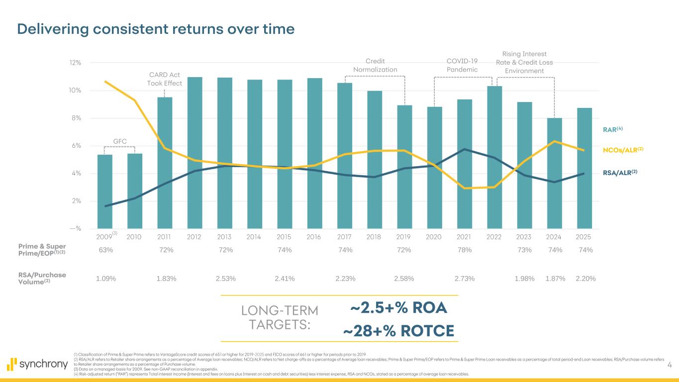 3 3.0% 2025 Year in Review $3.5BN Grow & win new partners New partner deals +120% Accounts provisioned for digital wallets 45+ Partner renewals $182BN purchase volume 500+ 17% Increase in purchase volume via Synchrony Marketplace, app, and website Partner locations thousand Capital returned ROA ROTCE (1) Net earnings $3.3BN Driving value for our stakeholders Diversify programs, products & markets Deliver best-in-class customer experiences Generate strong financial results 30+ ~20MM New accounts originated Book Value per share 13% / 9% growth (1) Return on tangible common equity (“ROTCE”) represents net earnings available to common stockholders as a percentage of average tangible common equity. Tangible common equity ("TCE") and tangible book value (“TBV”) per share are non-GAAP measures. For corresponding reconciliation of these measures to a GAAP financial measure, see Non-GAAP Reconciliation in appendix. 25.8% TBV per share(1)