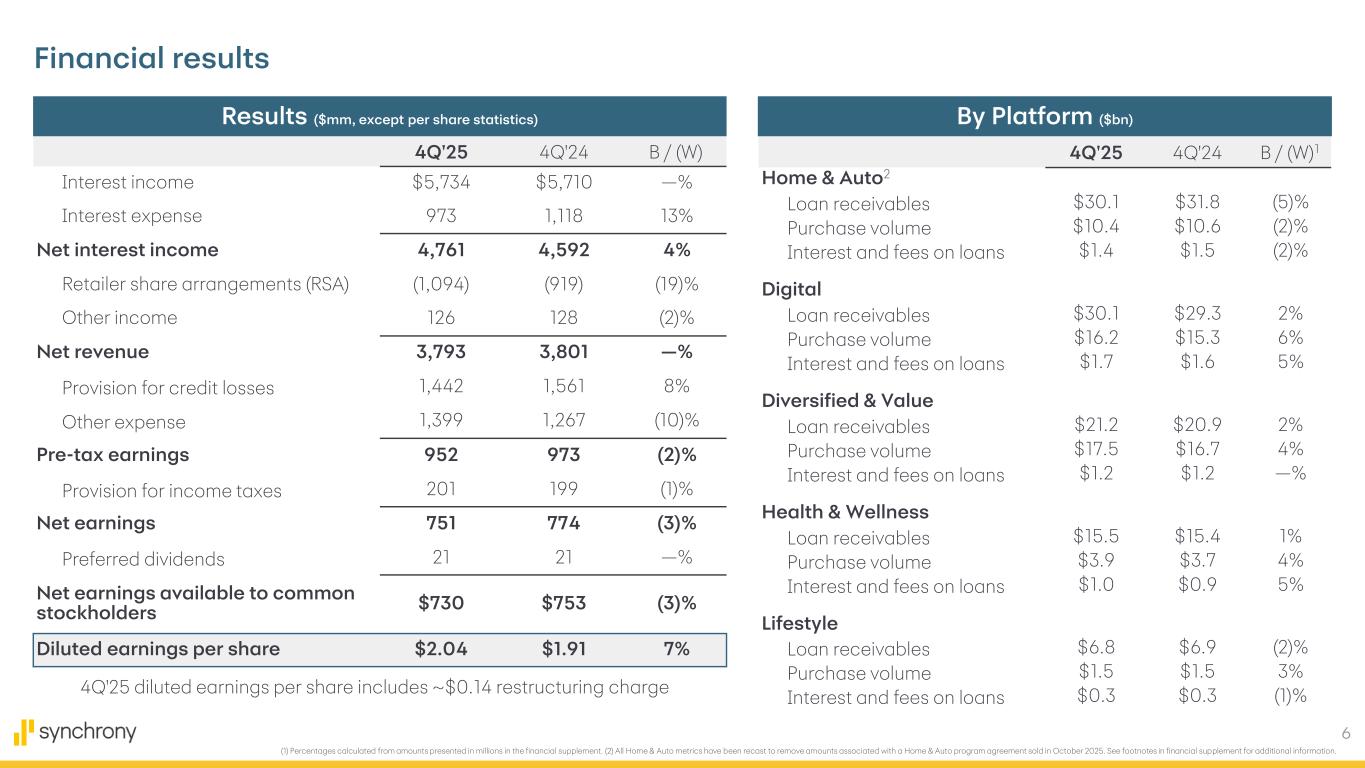 6 (1) Percentages calculated from amounts presented in millions in the financial supplement. (2) All Home & Auto metrics have been recast to remove amounts associated with a Home & Auto program agreement sold in October 2025. See footnotes in financial supplement for additional information. Financial results Results ($mm, except per share statistics) By Platform ($bn) 4Q'25 4Q'24 B / (W) Interest income $5,734 $5,710 —% Interest expense 973 1,118 13% Net interest income 4,761 4,592 4% Retailer share arrangements (RSA) (1,094) (919) (19)% Other income 126 128 (2)% Net revenue 3,793 3,801 —% Provision for credit losses 1,442 1,561 8% Other expense 1,399 1,267 (10)% Pre-tax earnings 952 973 (2)% Provision for income taxes 201 199 (1)% Net earnings 751 774 (3)% Preferred dividends 21 21 —% Net earnings available to common stockholders $730 $753 (3)% Diluted earnings per share $2.04 $1.91 7% 4Q'25 4Q'24 B / (W)1 Home & Auto2 Loan receivables $30.1 $31.8 (5)% Purchase volume $10.4 $10.6 (2)% Interest and fees on loans $1.4 $1.5 (2)% Digital Loan receivables $30.1 $29.3 2% Purchase volume $16.2 $15.3 6% Interest and fees on loans $1.7 $1.6 5% Diversified & Value Loan receivables $21.2 $20.9 2% Purchase volume $17.5 $16.7 4% Interest and fees on loans $1.2 $1.2 —% Health & Wellness Loan receivables $15.5 $15.4 1% Purchase volume $3.9 $3.7 4% Interest and fees on loans $1.0 $0.9 5% Lifestyle Loan receivables $6.8 $6.9 (2)% Purchase volume $1.5 $1.5 3% Interest and fees on loans $0.3 $0.3 (1)%4Q'25 diluted earnings per share includes ~$0.14 restructuring charge