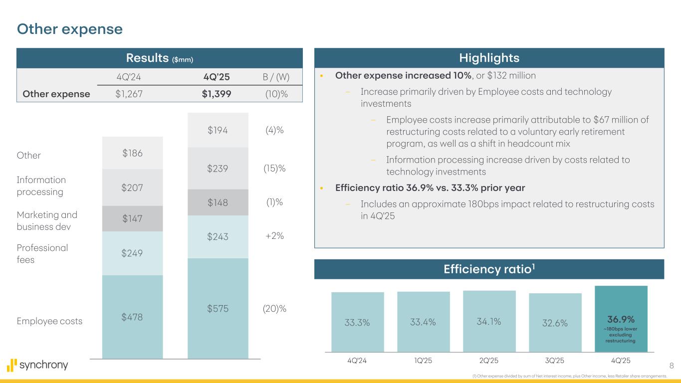 7 (1) Product, Pricing, and Policy Changes (or "PPPCs"). (2) Customer payments received during the period divided by beginning of period loan receivables, including Loan receivables held for sale. (3) Excludes portfolios sold in 2019 and 2022. • Net revenue flat to prior year – Net interest income increased 4%, or $169 million ▪ Loan receivables yield of 21.80%, up 53 bps primarily driven by the impact of our PPPCs1, partially offset by lower benchmark rates and lower late fee incidence ▪ Lower benchmark rates primarily drove reductions in Interest- bearing liabilities cost of 51 bps to 4.07% and liquidity portfolio yield of 73 bps to 4.03% – Retailer share arrangements increased 19%, reflecting program performance which included lower Net charge-offs and the impact of our PPPCs • Net interest margin of 15.83% increased 82bps – Reflects higher Loan receivables yield and lower liabilities cost, partially offset by liquidity portfolio yield – Loan receivables mix as a percent of Interest-earning assets of 84.65% increased 46bps • Payment rate2 of 16.3% up approximately 45bps vs. 4Q'24 and up approximately 155bps vs. pre-pandemic 5-year historical average ('15-'19)3 – The higher payment rate reflects the impact of our previous credit actions Net revenue Results ($mm) Highlights Other income Net interest income RSA (2)% +4% (19)% 4Q'24 Net interest margin 15.01% Loan receivables yield +0.44 % Interest-bearing liabilities cost +0.41 % Liquidity portfolio yield (0.11)% Mix of Interest-earning assets +0.08 % 4Q'25 Net interest margin 15.83% Net interest margin 4Q'24 4Q'25 B / (W) Net revenue $3,801 $3,793 —%