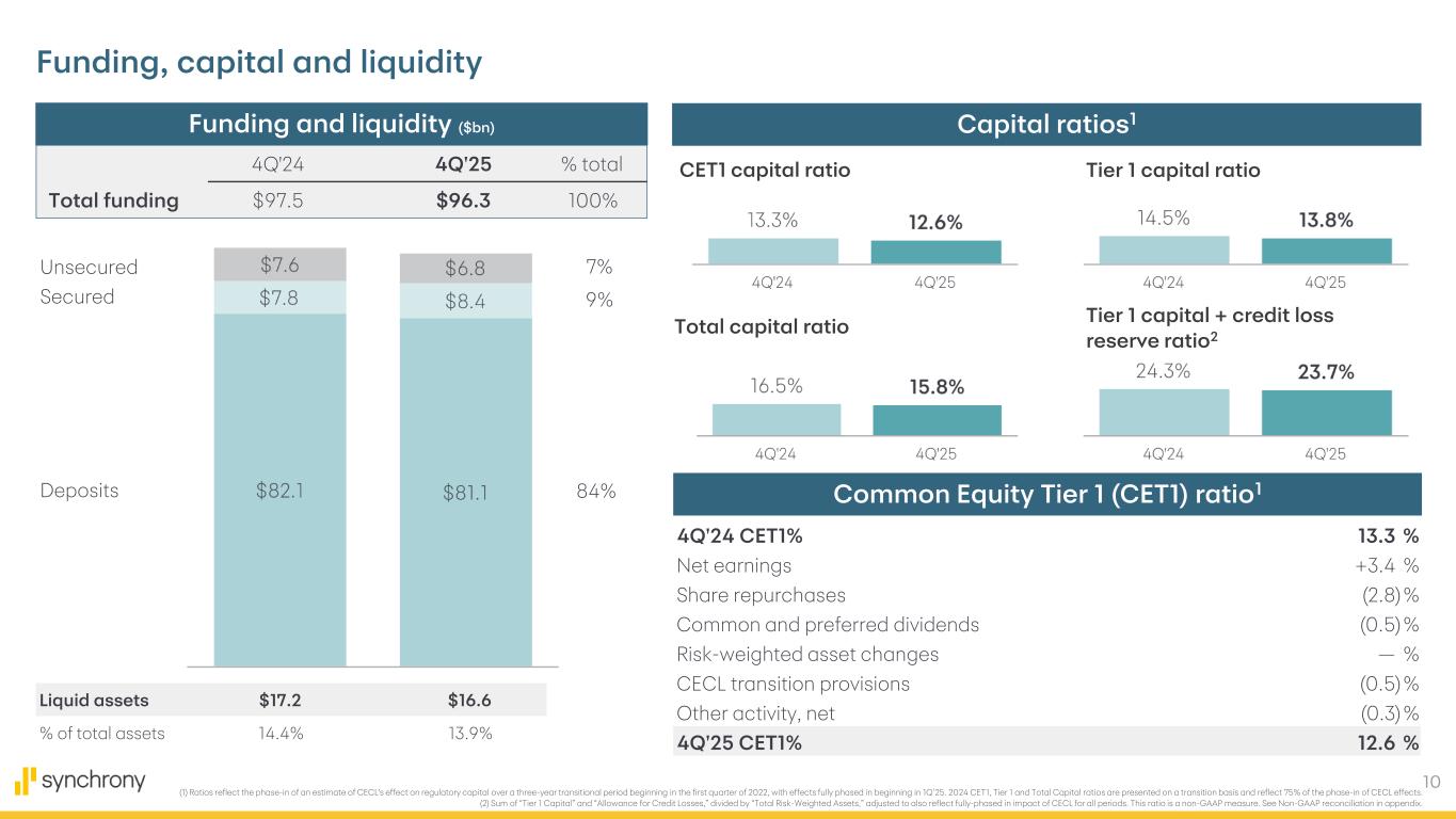9 • Provision for credit losses decreased 8%, or $119 million, driven by lower Net charge-offs of $294 million partially offset by a reserve build of $76 million versus a $100 million reserve release in the prior year (1) Unless otherwise indicated, references to Loan receivables do not include Loan receivables held for sale. (2) Excludes reserves for credit exposures primarily related to purchase commitments for loan portfolio acquisitions. Highlights Credit 30+ days past due $mm, % of period-end loan receivables 90+ days past due $mm, % of period-end loan receivables Net charge-offs $mm, annualized as % of average loan receivables, including held for sale Allowance for credit losses2 $mm, % of period-end loan receivables Credit trends1