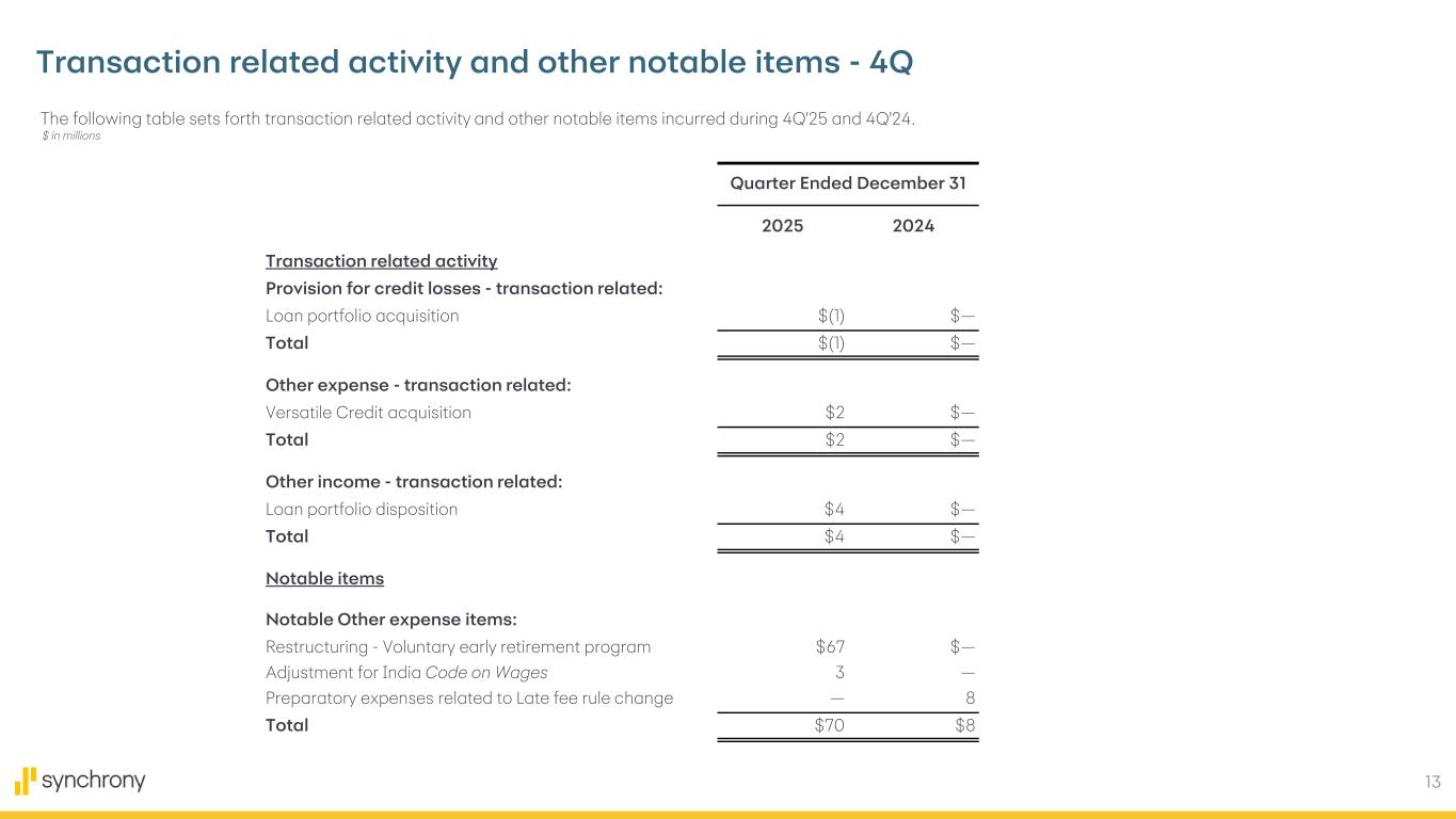 13 The following table sets forth transaction related activity and other notable items incurred during 4Q'25 and 4Q'24. Transaction related activity and other notable items - 4Q $ in millions Quarter Ended December 31 2025 2024 Transaction related activity Provision for credit losses - transaction related: Loan portfolio acquisition $(1) $— Total $(1) $— Other expense - transaction related: Versatile Credit acquisition $2 $— Total $2 $— Other income - transaction related: Loan portfolio disposition $4 $— Total $4 $— Notable items Notable Other expense items: Restructuring - Voluntary early retirement program $67 $— Adjustment for India Code on Wages 3 — Preparatory expenses related to Late fee rule change — 8 Total $70 $8