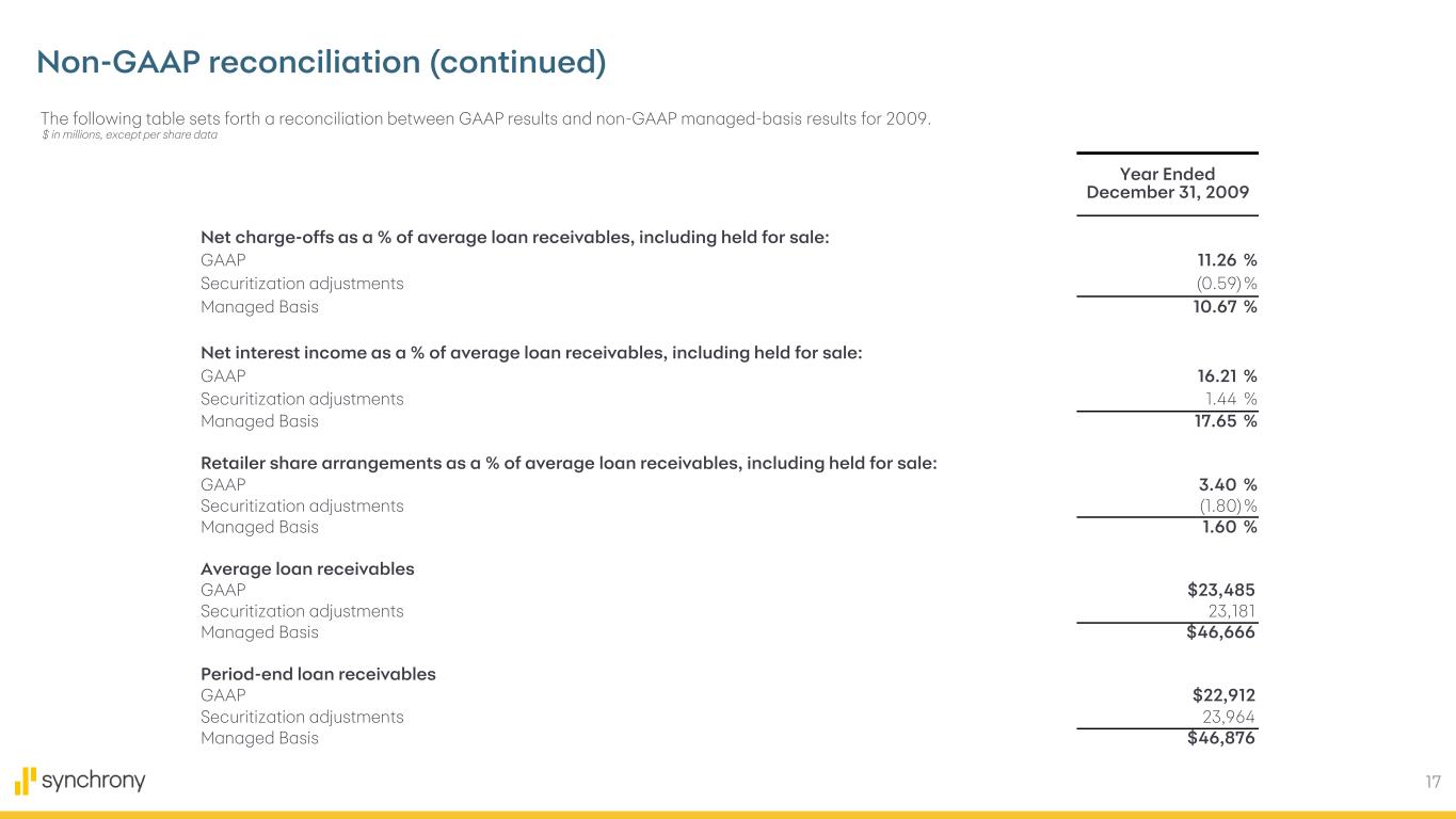 17 Non-GAAP reconciliation (continued) The following table sets forth a reconciliation between GAAP results and non-GAAP managed-basis results for 2009. $ in millions, except per share data Year Ended December 31, 2009 Net charge-offs as a % of average loan receivables, including held for sale: GAAP 11.26 % Securitization adjustments (0.59) % Managed Basis 10.67 % Net interest income as a % of average loan receivables, including held for sale: GAAP 16.21 % Securitization adjustments 1.44 % Managed Basis 17.65 % Retailer share arrangements as a % of average loan receivables, including held for sale: GAAP 3.40 % Securitization adjustments (1.80)% Managed Basis 1.60 % Average loan receivables GAAP $23,485 Securitization adjustments 23,181 Managed Basis $46,666 Period-end loan receivables GAAP $22,912 Securitization adjustments 23,964 Managed Basis $46,876