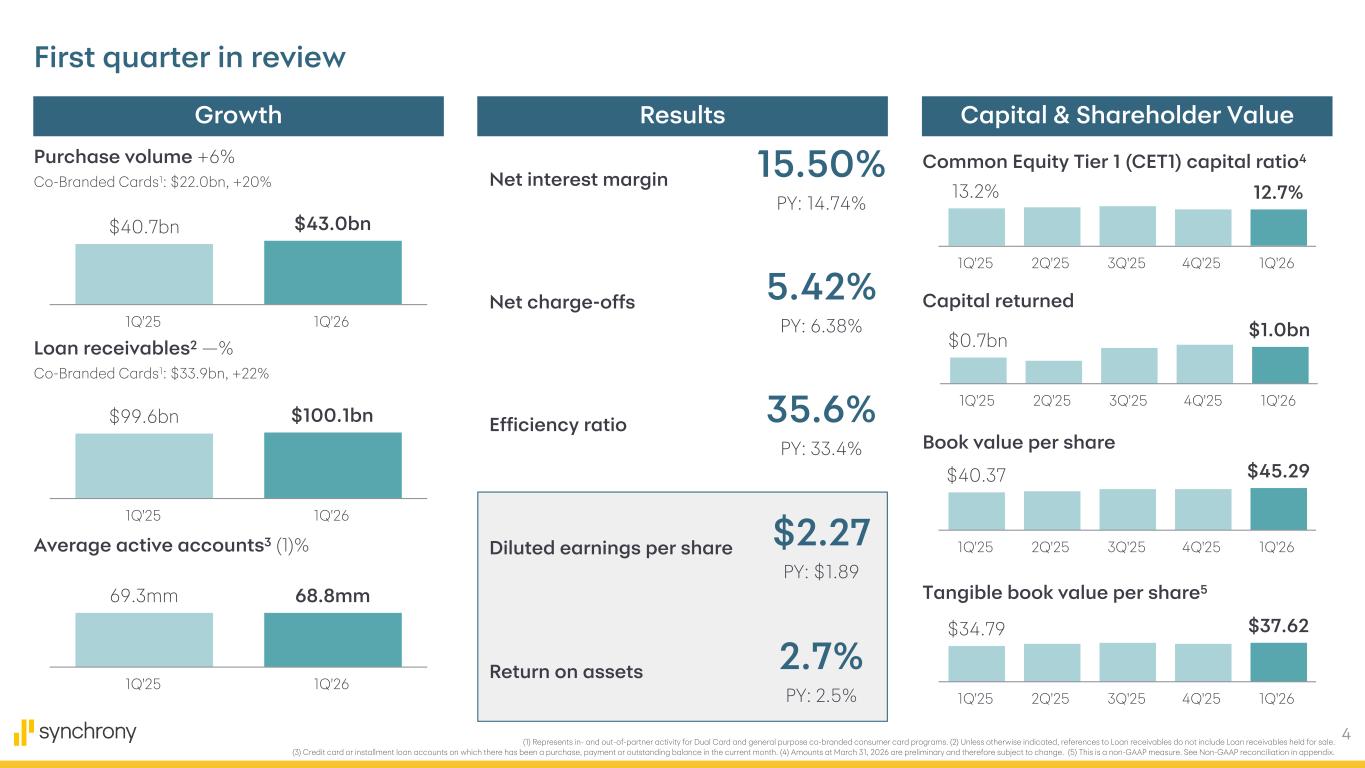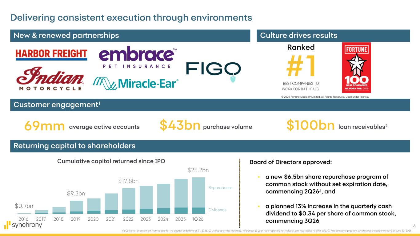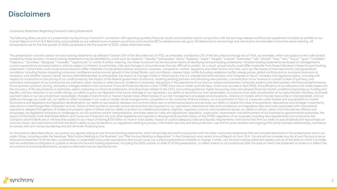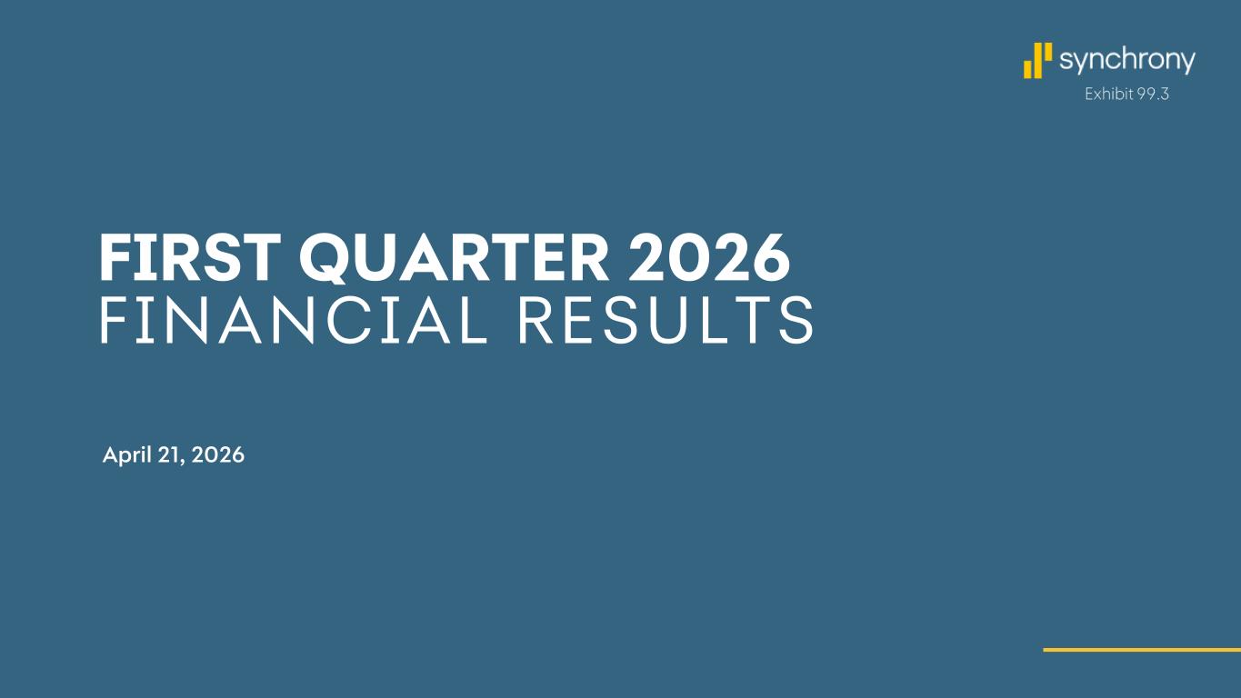 2 Disclaimers Cautionary Statement Regarding Forward-Looking Statements The following slides are part of a presentation by Synchrony Financial in connection with reporting quarterly financial results and should be read in conjunction with the earnings release and financial supplement included as exhibits to our Current Report on Form 8-K filed today and available on our website (www.investors.synchrony.com) and the SEC's website (www.sec.gov). All references to net earnings and net income are intended to have the same meaning. All comparisons are for the first quarter of 2026 compared to the first quarter of 2025, unless otherwise noted. This presentation contains certain forward-looking statements as defined in Section 27A of the Securities Act of 1933, as amended, and Section 21E of the Securities Exchange Act of 1934, as amended, which are subject to the "safe harbor" created by those sections. Forward-looking statements may be identified by words such as "expects," "intends," "anticipates," "plans," "believes," "seeks," "targets," "outlook," "estimates," "will," "should," "may," “aim,” “focus,” “goal,” “confident,” “trajectory,” "priorities," "designed," "consider," “opportunity” or words of similar meaning, but these words are not the exclusive means of identifying forward-looking statements. Forward-looking statements are based on management's current expectations and assumptions, and are subject to inherent uncertainties, risks and changes in circumstances that are difficult to predict. As a result, actual results could differ materially from those indicated in these forward-looking statements. Factors that could cause actual results to differ materially include global political, economic, business, competitive, market, regulatory and other factors and risks, such as: the impact of macroeconomic and geopolitical conditions, including factors impacting consumer confidence and economic growth in the United States, such as inflation, interest rates, tariffs (including retaliatory tariffs), energy prices, global conflicts and an economic downturn or recession, and whether industry trends we have identified develop as anticipated; the impact of changes made or influenced by the U.S. presidential administration and Congress on fiscal, monetary and regulatory policy, including with respect to constraints on the pricing of our credit products; the impact of the federal government shutdowns; retaining existing partners and attracting new partners, concentration of our revenue in a small number of partners, and promotion and support of our products by our partners; cyber-attacks or other security incidents or breaches; disruptions in the operations of our and our outsourced partners' computer systems and data centers; the financial performance of our partners; product, pricing, and policy changes related to the Consumer Financial Protection Bureau’s (the “CFPB”) final rule on credit card late fees, which was vacated in April 2025; the sufficiency of our allowance for credit losses and the accuracy of the assumptions or estimates used in preparing our financial statements, including those related to the CECL accounting guidance; higher borrowing costs and adverse financial market conditions impacting our funding and liquidity, and any reduction in our credit ratings; our ability to grow our deposits in the future; damage to our reputation; our ability to securitize our loan receivables, occurrence of an early amortization of our securitization facilities, and lower payment rates on our securitized loan receivables; changes in benchmark or market interest rates; effectiveness of our risk management processes and procedures, reliance on models which may be inaccurate or misinterpreted, and our ability to manage our credit risk; our ability to offset increases in our costs in retailer share arrangements; competition in the consumer finance industry; our concentration in the U.S. consumer credit market and susceptibility to market fluctuations and legislative and regulatory developments; our ability to successfully develop and commercialize new or enhanced products and services; our ability to realize the value of acquisitions, dispositions and strategic investments; reductions in interchange fees; fraudulent activity; failure of third-parties to provide various services that are important to our operations; international risks and compliance and regulatory risks and costs associated with international operations; alleged infringement of intellectual property rights of others and our ability to protect our intellectual property; litigation, regulatory actions and compliance issues; our ability to attract, retain and motivate key officers and employees; tax legislation initiatives or challenges to our tax positions and/or interpretations, and state sales tax rules and regulations; regulation, supervision, examination and enforcement of our business by governmental authorities, the impact of the Dodd-Frank Wall Street Reform and Consumer Protection Act and other legislative and regulatory developments and the impact of the CFPB’s regulation of our business, including new requirements and constraints the Company and the Bank are or will become subject to as a result of having $100 billion or more in total assets; impact of capital adequacy rules and liquidity requirements; restrictions that limit our ability to pay dividends and repurchase our common stock, and restrictions that limit the Bank’s ability to pay dividends to us; regulations relating to privacy, information security and data protection; use of third-party vendors and ongoing third-party business relationships; and failure to comply with anti-money laundering and anti-terrorism financing laws. For the reasons described above, we caution you against relying on any forward-looking statements, which should also be read in conjunction with the other cautionary statements that are included elsewhere in this